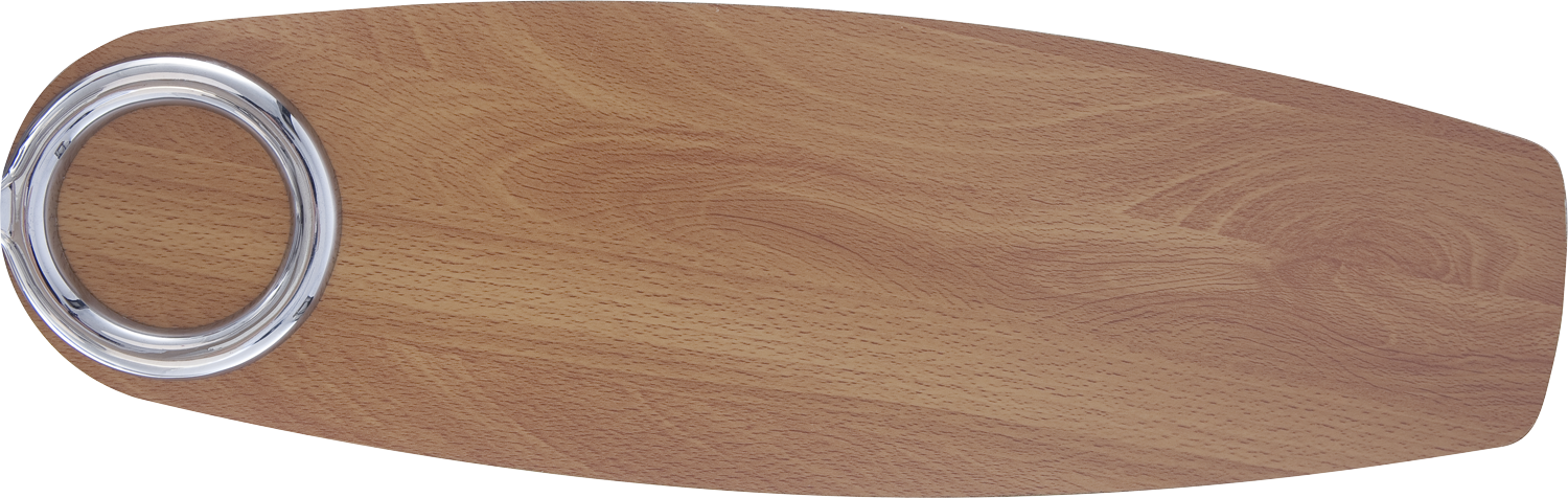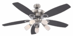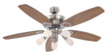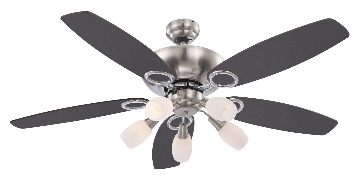 Ovaj model kombinuje prelijepu lampu sa stropnim ventilatorom. Ram je izrađen od metala u izgledu mat nikla, dok su nosači lopatica hromirani. Pet staklenih abažura u bijelom satenskom finišu usmjereni su u svim pravcima. Lopatice su reverzibilne – s jedne strane u dekoru bukve, a s druge u grafitnom izgledu. Model je opremljen i povlačnom sklopkom koja omogućava podešavanje u tri nivoa. Prečnik ventilatora iznosi 130 cm, što ga čini pogodnim za veće prostorije do 30 m². Maksimalna snaga motora je 60 W.