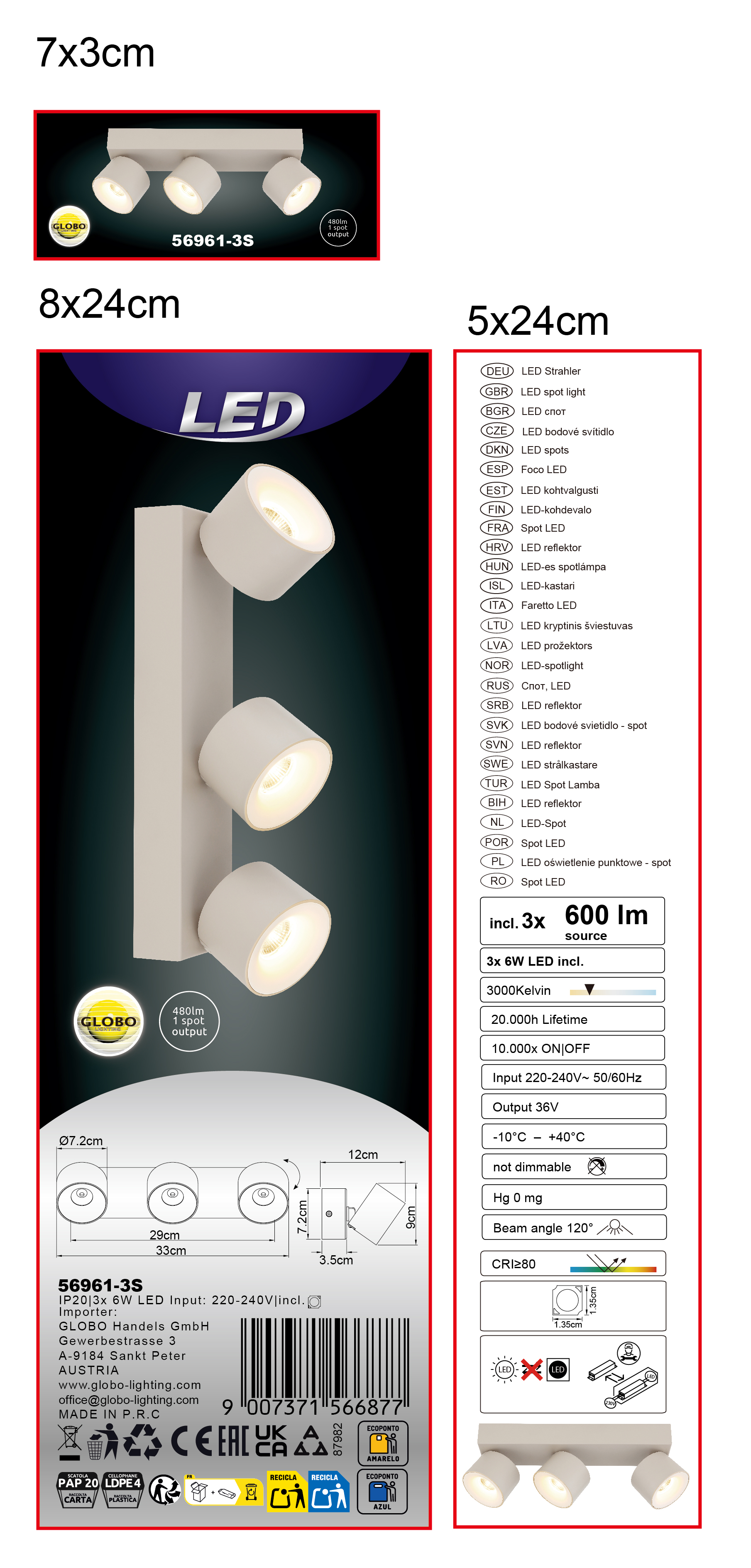 RAE LED reflektor impresionira modernim dizajnom, čistim linijama i elegantnim osvjetljenjem. Pravougaona zidna ploča od mat metala boje pijeska čini osnovu za okrugle, cilindrične reflektore, koji daju ciljane akcente osvjetljenja uz zadržavanje elegancije. Sjenila od aluminija boje pijeska i opal plastike osiguravaju ravnomjernu distribuciju svjetlosti bez odsjaja i stvaraju ugodnu atmosferu u svakoj prostoriji. Sa dužinom od 330 mm i širinom od 72 mm, uređaj je kompaktan, harmonično se uklapa u dnevni ili radni prostor i ističe određena područja bez nametljivosti. Integrisani LED daje 480 lumena na 3000 K, proizvodeći toplo bijelo svjetlo za ugodan ambijent. Sa visokokvalitetnim materijalima, bezvremenskim dizajnom i efikasnom LED tehnologijom, RAE LED reflektor idealan je za hodnike, kuhinje, dnevne sobe ili kancelarije, kombinujući praktično osvetljenje sa estetskom privlačnošću i služeći kao moderan vrhunac u svakom enterijeru.