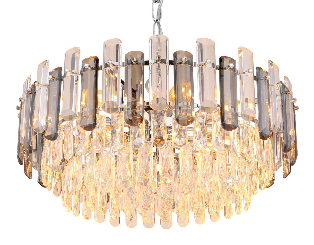 Luster ORGINA unosi dašak glamura u prostoriju sa blistavim kristalima i staklenim šipkama u boji dima. Pogodno za E14 sijalice (ekskluzivno).