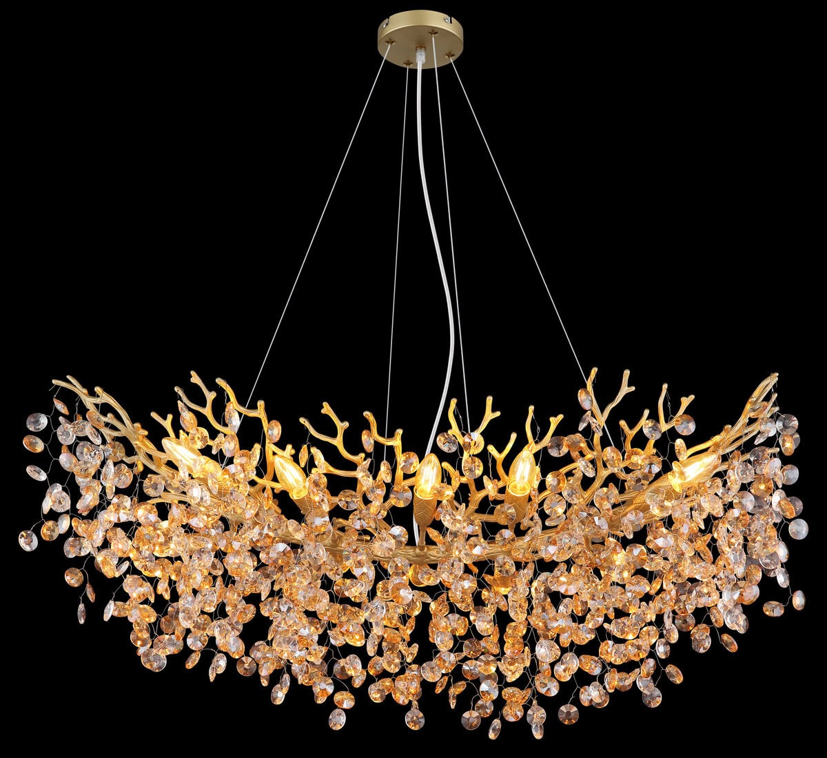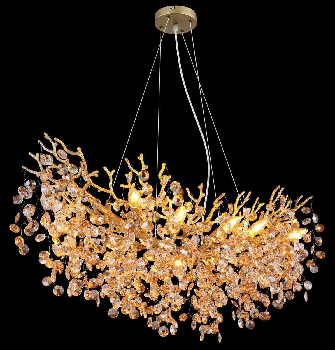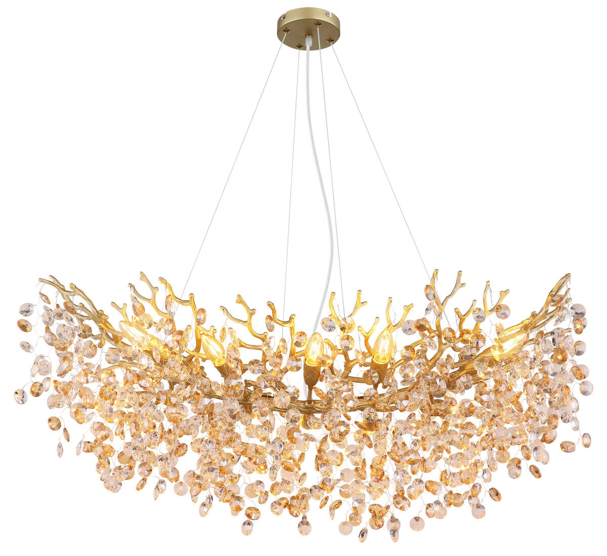 QUEENA – Ovalni luster sa luksuznim kristalnim privescima. Ovalni luster QUEENA impresionira svojim umjetničkim dizajnom i izvrsnom izradom. Nježno tijelo izrađeno od mat metala zlatne boje vješto je oblikovano u elegantne grane, dajući svjetlu prirodnu, ali ekskluzivnu auru. Ukrašen blistavim staklenim kristalima u jantarnoj i prozirnoj boji, luster stvara fascinantnu međusobnu igru svjetla i sjene, dajući svakoj prostoriji toplu i privlačnu atmosferu. Sa 10 E14 utičnica, QUEENA nudi dovoljno svjetla i idealna je za prostrane dnevne i blagovaone, kao i formalne prostore. Integrirani flekso elementi na utičnicama omogućavaju fleksibilno podešavanje izvora svjetlosti, što vam omogućava da individualno prilagodite svjetlo svojim potrebama. Ovaj luster kombinuje klasičnu eleganciju sa modernom udobnošću i postaće svetlucavi centar vašeg enterijera. E14 sijalice nisu uključene.