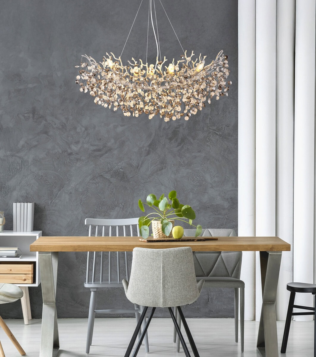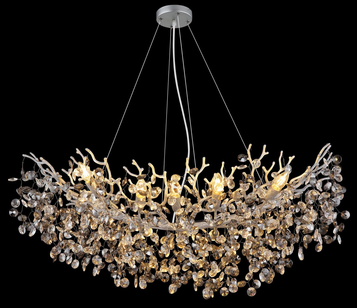 QUEENA – Ovalni luster sa elegantnim kristalnim privescima. Ovalni luster QUEENA impresionira svojim modernim dizajnom i visokokvalitetnom izradom. Umjetno razgranato tijelo od mat metala srebrne boje podsjeća na nježne grane i daje lampi sofisticiran, skulpturalni izgled. Sjenilo je ukrašeno svjetlucavim staklenim kristalima u dimno sivoj i prozirnoj boji, koji nježno prelamaju svjetlost i stvaraju topao, atmosferski sjaj. Sa 10 E14 utičnica, QUEENA nudi izdašan izlaz svjetlosti i idealna je za velike dnevne i blagovaone, kao i formalne prostore. Zahvaljujući flekso elementima na utičnicama, izvori svjetlosti se mogu pojedinačno poravnati kako bi stvorili ciljane svjetlosne akcente i optimalno osvijetlili prostoriju. QUEENA kombinuje elegantnu eleganciju s funkcionalnošću i postaje blistavo privlačenje očiju u svakom interijeru. E14 sijalice nisu uključene.