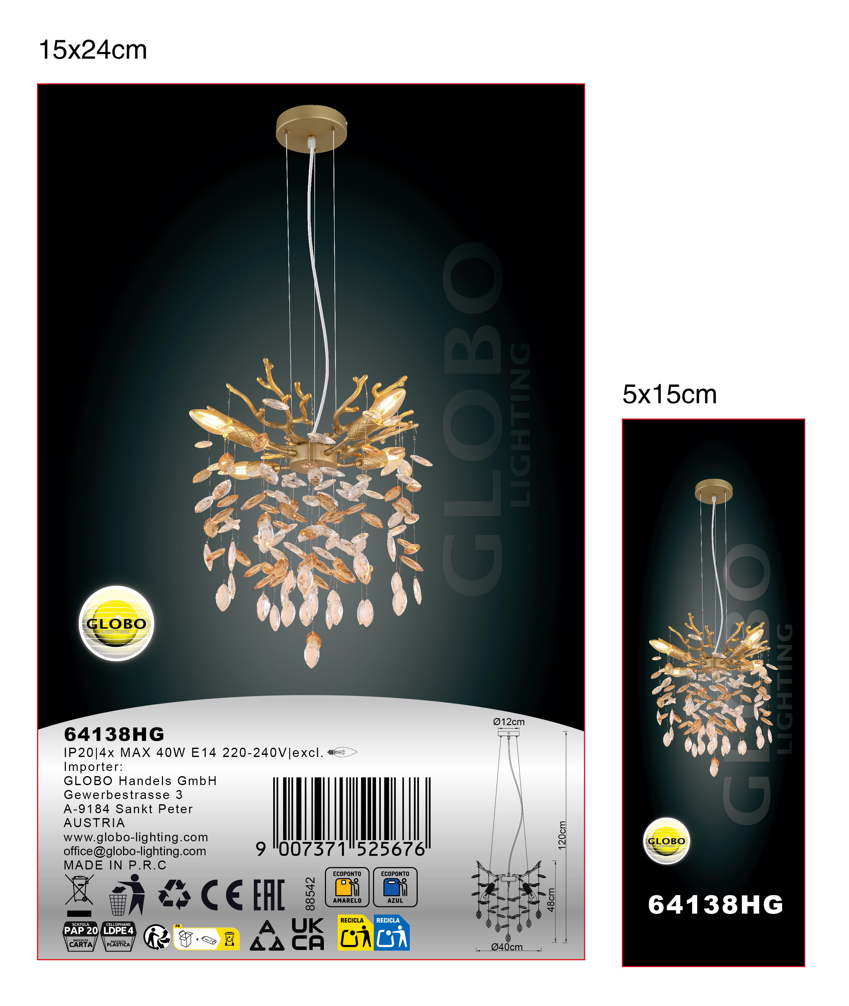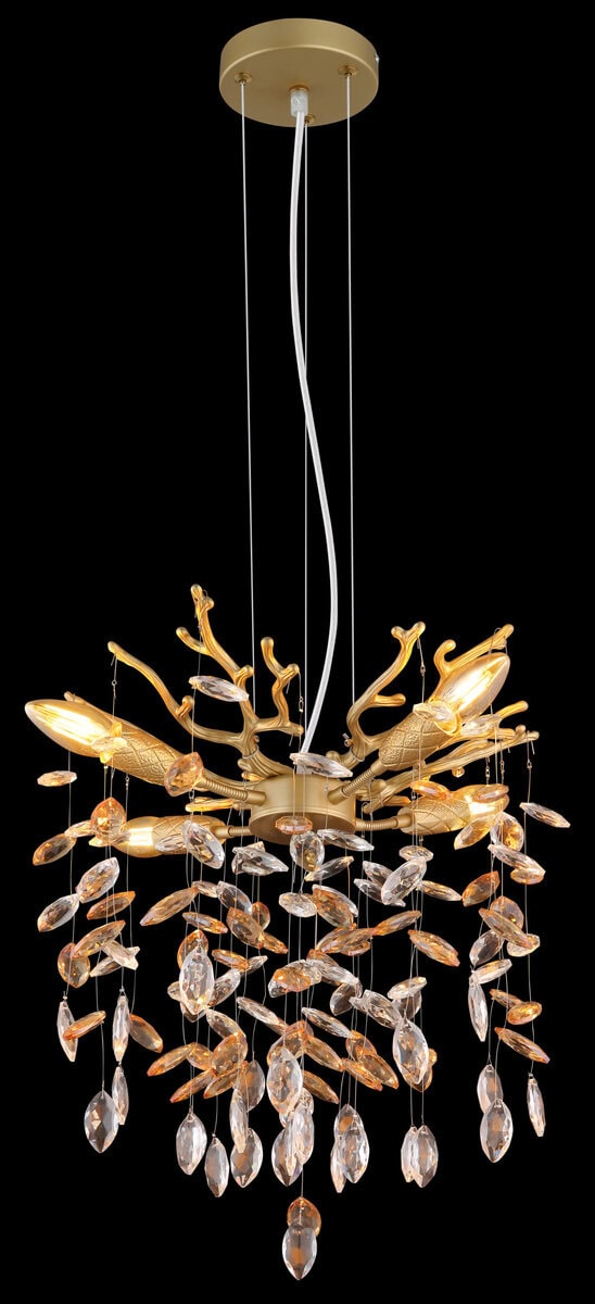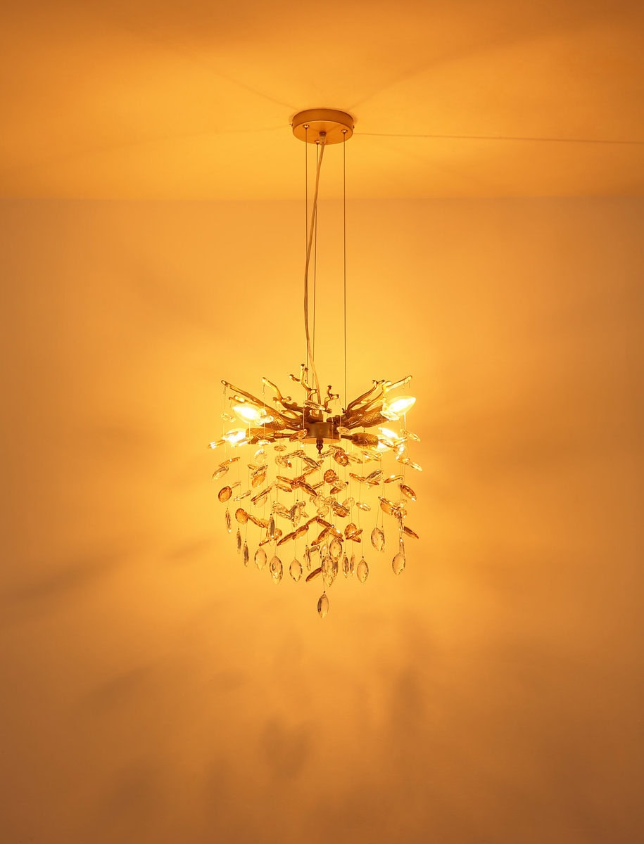 QUEENA – Okrugli luster sa kristalnim privescima u zlatu i ćilibaru. Okrugli luster QUEENA kombinuje umetnički dizajn sa sofisticiranom privlačnošću. Delikatno izrađeno kućište od mat metala zlatne boje podsjeća na nježne grane i daje svjetiljci elegantnu, prirodnu lakoću. Kombinacija sa staklenim kristalima boje ćilibara i prozirne boje stvara fascinantne svjetlosne efekte i topao, privlačan sjaj u prostoriji. Zahvaljujući flexo elementima na utičnicama, izvori svjetlosti mogu biti fleksibilno poravnati – savršeno za postavljanje pojedinačnih akcenta i optimalno osvjetljavanje prostorije. Bilo iznad stola za ručavanje, u dnevnom boravku ili u hodniku – QUEENA će svugdje privući pažnju sa stilom. Luster je opremljen sa nekoliko E14 grla, što vam daje potpunu slobodu u izboru sijalica. E14 sijalice nisu uključene.