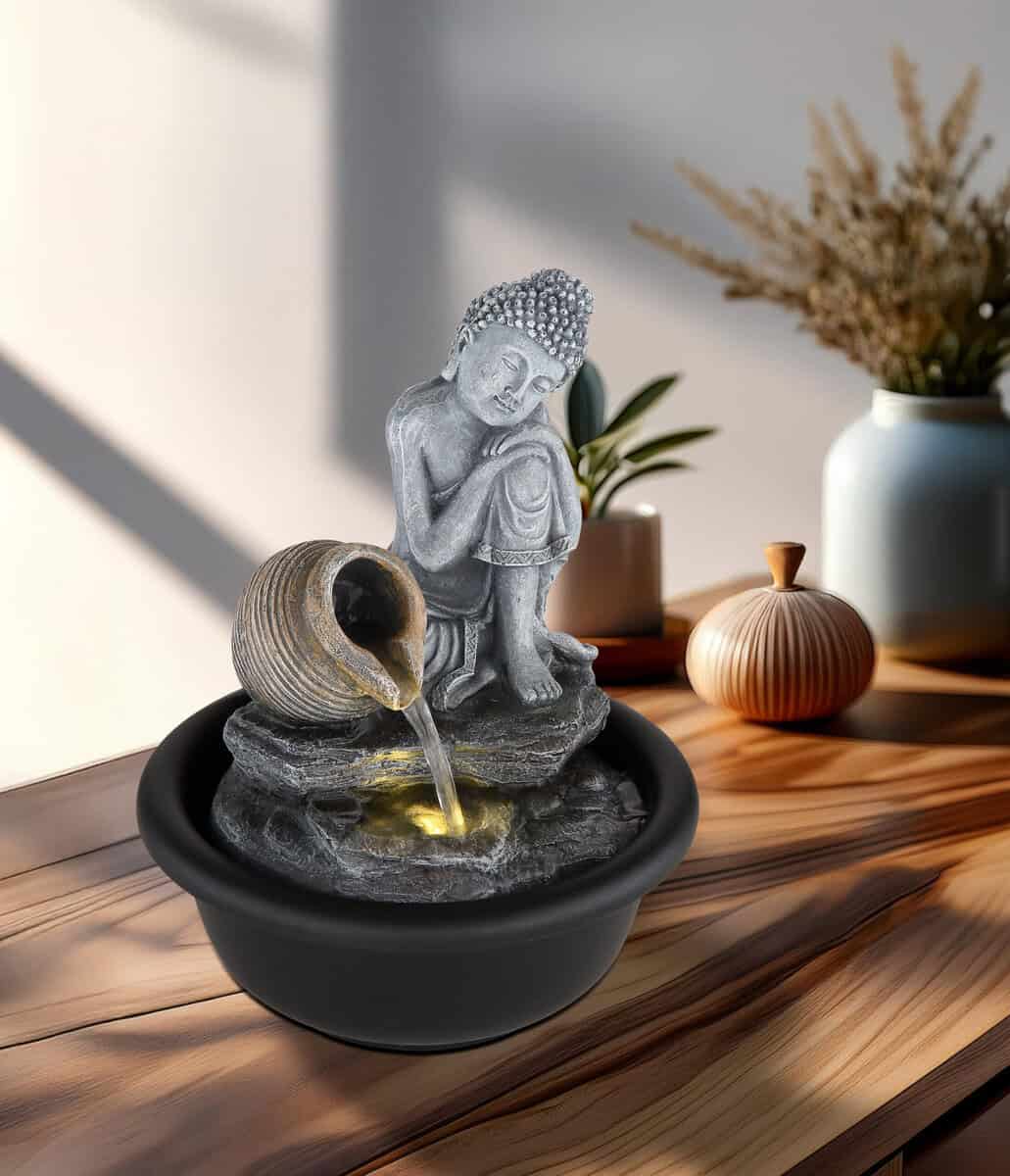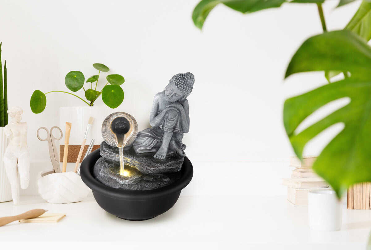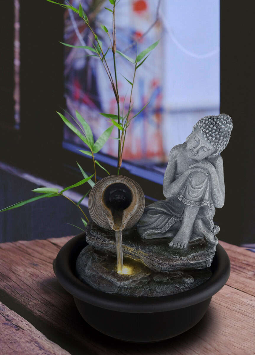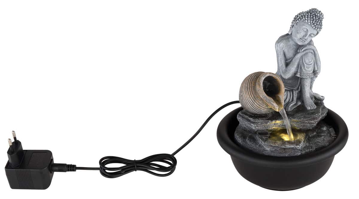 Unutrašnja fontana FONTANA je mali i organski dizajniran dodatak za vaš dom. Svojom figurom Bude i blagim pljuskanjem vode stvara opuštajuću atmosferu i poziva vas da se zadržite i opustite. Tijelo unutrašnje fontane FONTANA izrađeno je od mat crne plastike, dok je sjenilo od sive plastike. Ova kombinacija stvara moderan i bezvremenski dizajn koji se skladno uklapa u različite stilove opremanja. Unutrašnja fontana FONTANA ima prečnik od 160 mm i radi sa pumpom od 12 V, koja stvara prijatno kretanje vode. Toplo svjetlo od 3000K i energetski učinkovito osvjetljenje od 3W stvaraju ugodnu atmosferu. Sa unutrašnjom fontanom FONTANA ne dobijate samo vizuelni vrhunac, već i izvor opuštanja u vašem domu. Umirujući zvuk vode i prisustvo figura Bude djeluju harmonizirajuće i unose mir u vaš svakodnevni život. Pustite da vas očara ova mala unutrašnja fontana i pronađite trenutke opuštanja i unutrašnje ravnoteže.
