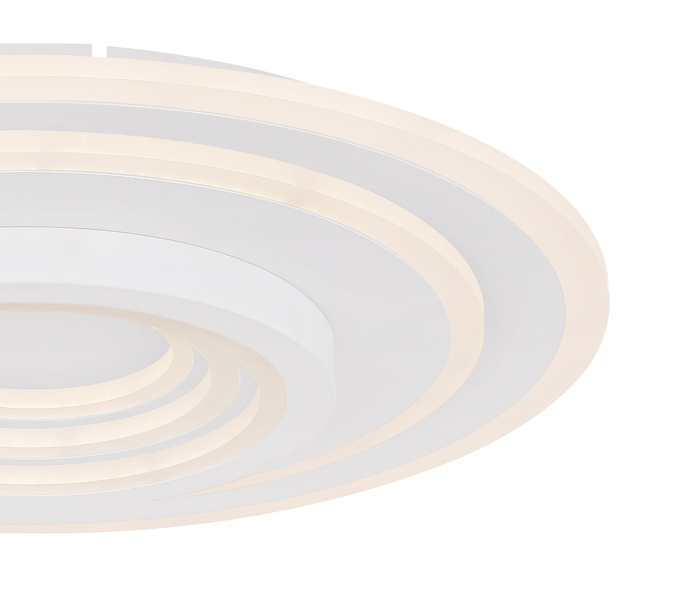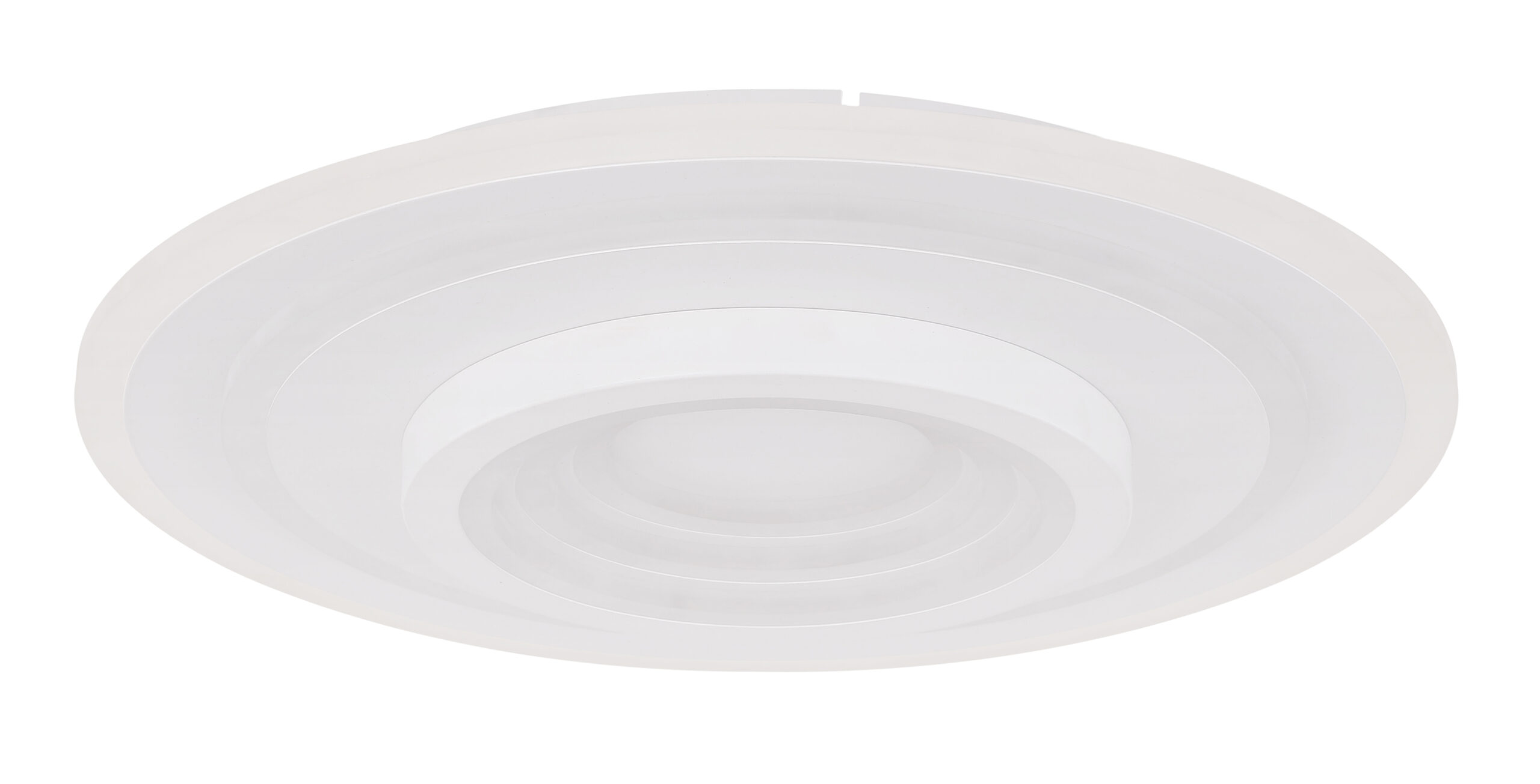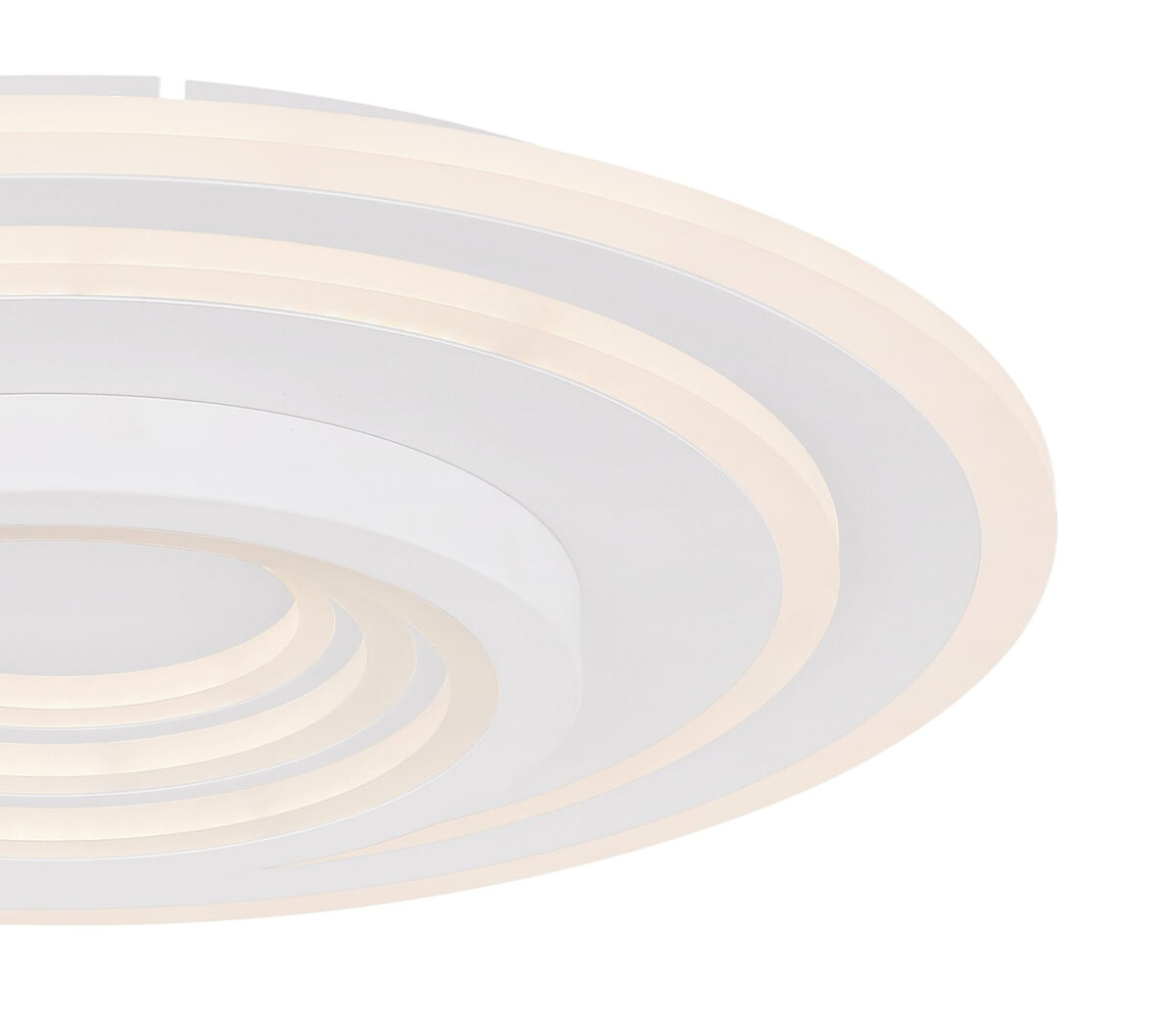 Moderna plafonska lampa BAFUR Ø 49,5 cm) izrađena je od bijelog metala i akrilnog stakla. Ovim unutrašnjim svjetlom koje se može prigušiti može se upravljati daljinskim upravljačem. Svjetlosni prstenovi različite veličine ove lampe sijaju u različitim svjetlosnim bojama. Ova elegantna plafonska lampa sa integrisanom LED sijalicom od 50 W pruža maksimalno 2190 lumena jakog svetla. Boja svjetla može se regulirati i fiksirati od prijatne toplo-bijele 3000 Kelvina do hladno bijele 6000 Kelvina. Ova lampa pogodna za spavaću, dječju, dnevnu i blagovaonicu ima memorijsku funkciju.