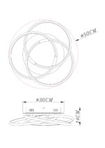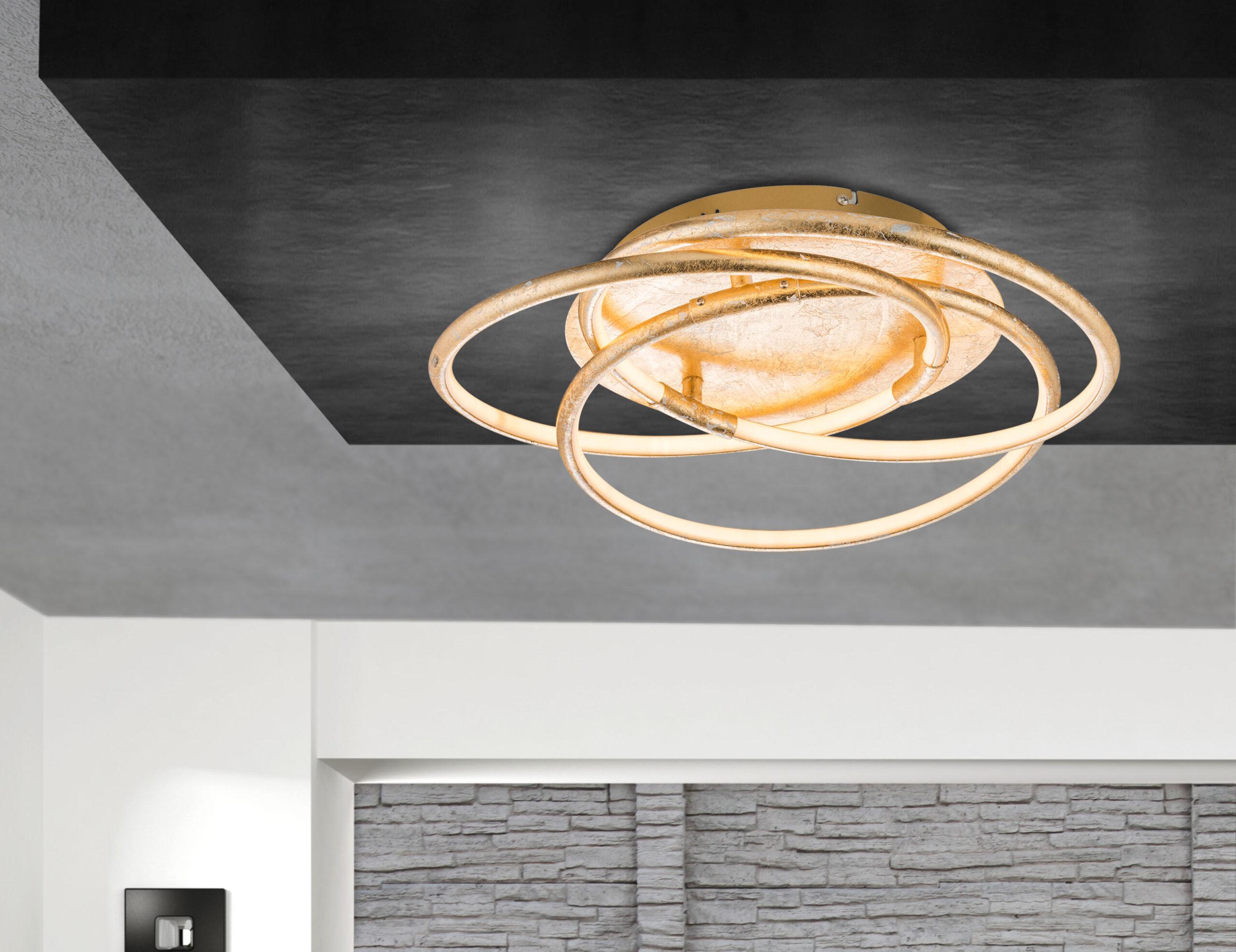 Ova moderna plafonska lampa, iz serije Barna, ubrzava rad srca. Sa tri prepletena prstena, njihov dizajn izgleda vrlo privlačno i savremeno. Za proizvodnju su korišteni aluminij zlatne boje i satinirana plastika. LED žarulja svijetli sa 2100 lumena i tako ne ostavlja mjesta u mraku. Sa svojih 3000K pruža ugodno toplo svjetlo i može se kombinirati sa mnogim drugim modelima iz ove serije.