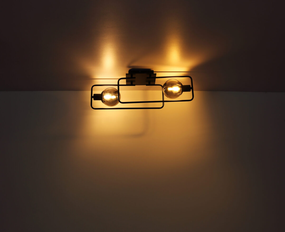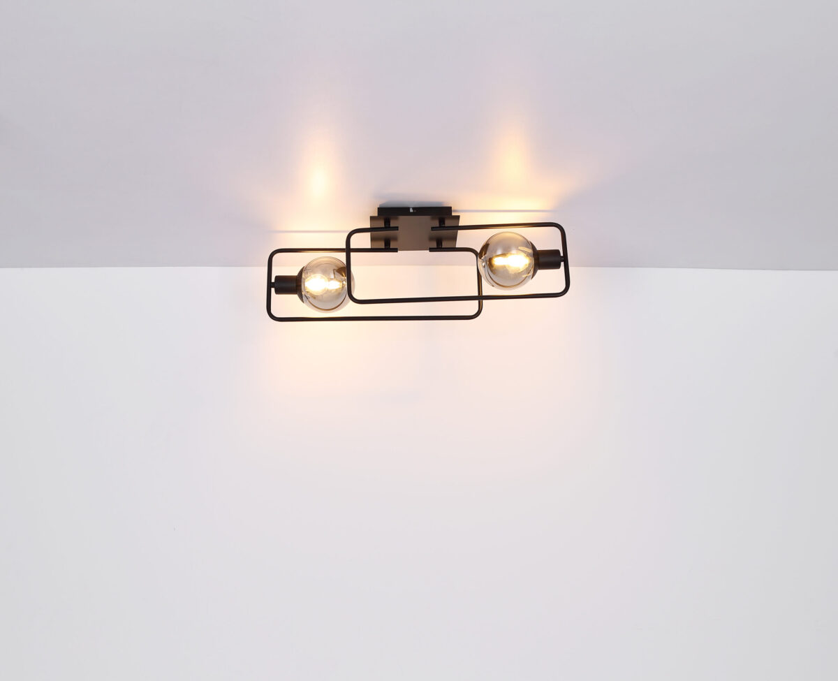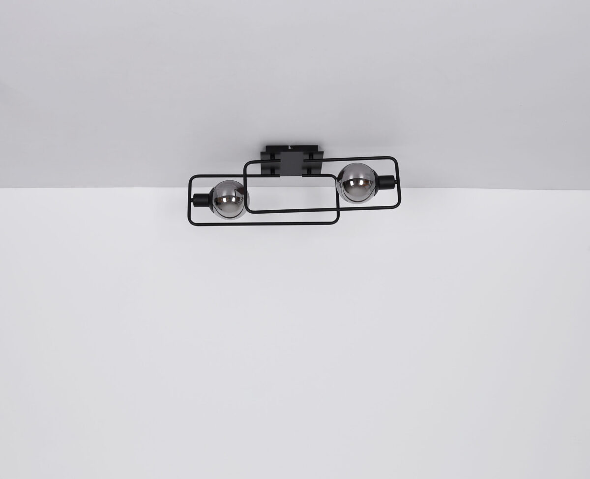 Ova moderna plafonska lampa impresionira svojim jednostavnim dizajnom. Na dvije pravokutne zaobljene metalne šipke (61x23cm) u mat crnoj boji nalazi se utičnica E14, opremljena sjenilom od dimljenog stakla. E14 utičnice vam omogućavaju da sami odredite boju svjetla i svjetlinu do maksimalne snage od 40 vati.