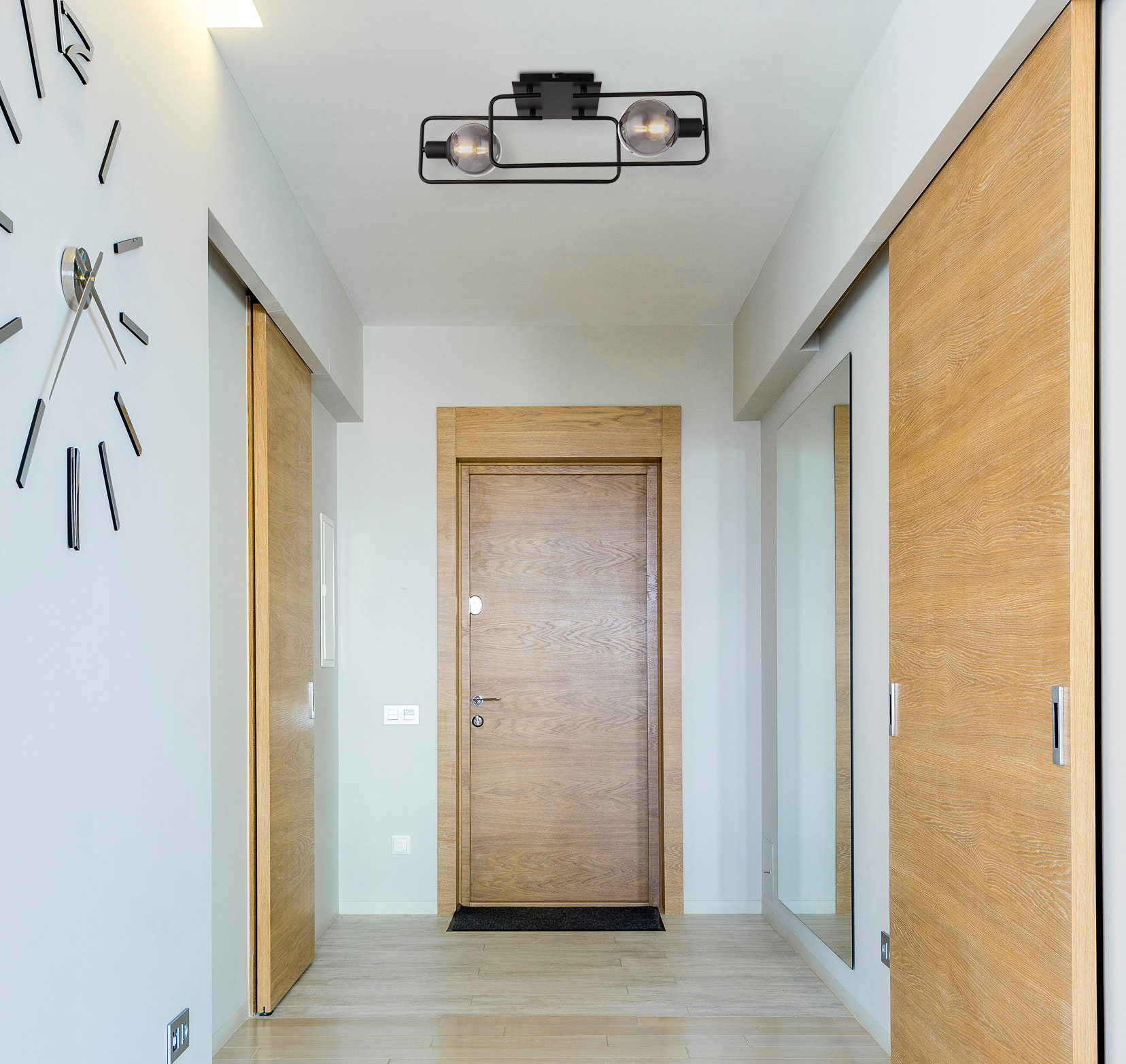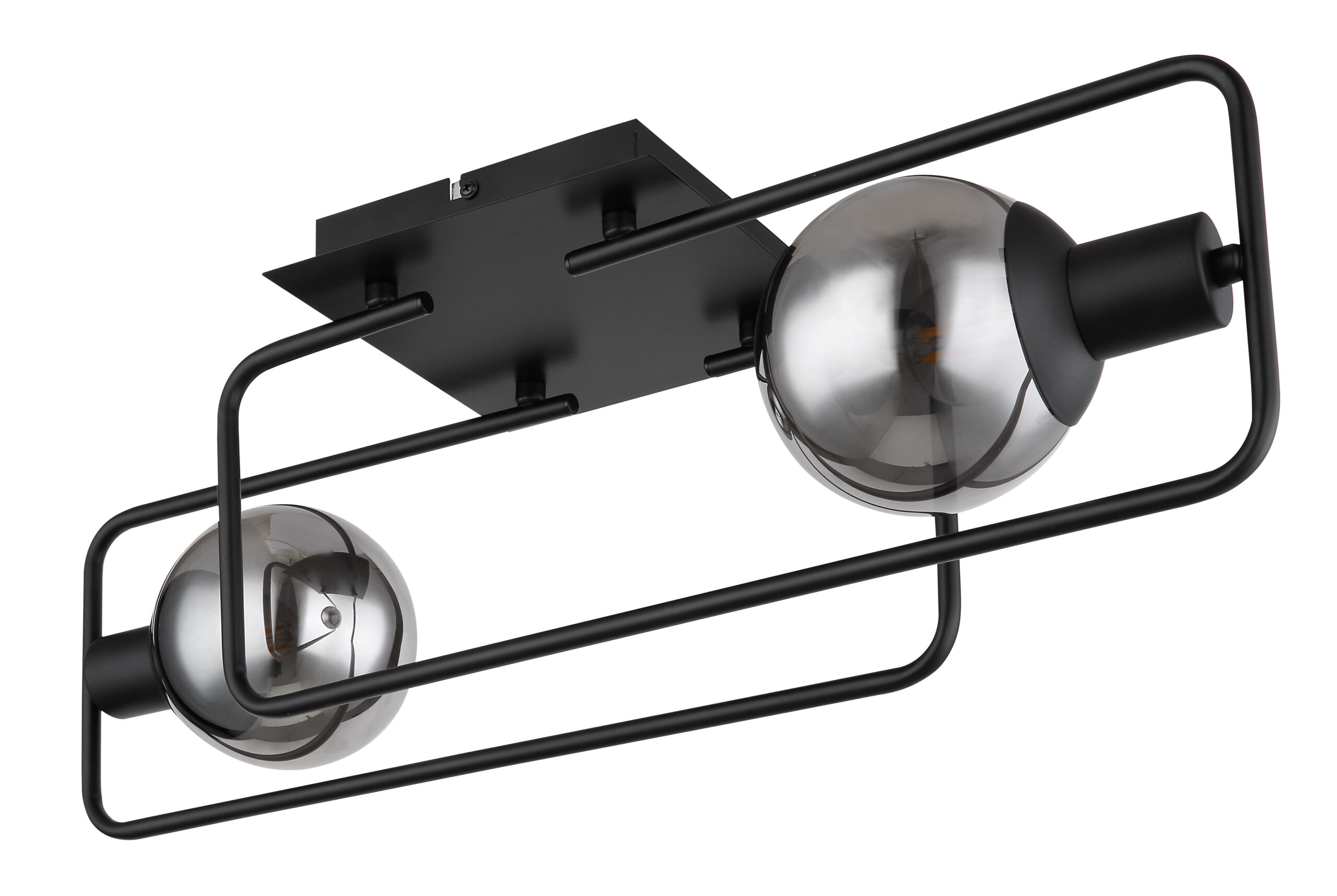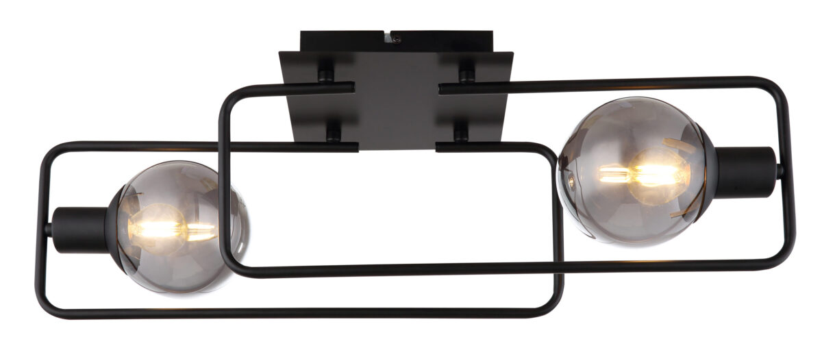 Ova moderna plafonska lampa impresionira svojim jednostavnim dizajnom. Na dvije pravokutne zaobljene metalne šipke (61x23cm) u mat crnoj boji nalazi se utičnica E14, opremljena sjenilom od dimljenog stakla. E14 utičnice vam omogućavaju da sami odredite boju svjetla i svjetlinu do maksimalne snage od 40 vati.