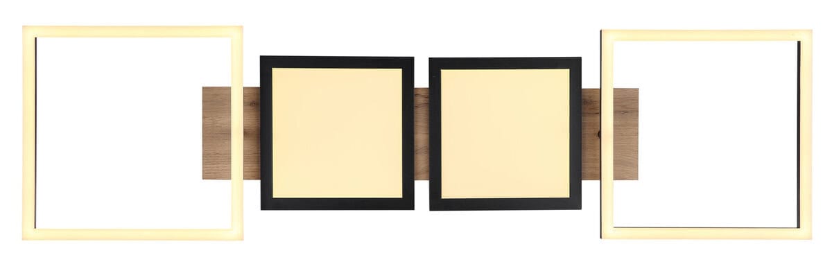 Ova sjajna plafonska lampa prelepog modernog dizajna inspiriše mlade i stare. Na pravougaonom plafonskom nosaču od crnog metala i medijapana u sjajnom izgledu drveta nalaze se dva kvadratna i dva okvirna panela. Integrirani LED paneli pružaju ugodno toplo bijelo svjetlo od 3000 Kelvina i time odličnu atmosferu. Vanjski LED paneli okvira mogu se rotirati u smjeru koji vama odgovara. Funkcija susreće dizajn, postavite nove akcente u svoje prostorije.