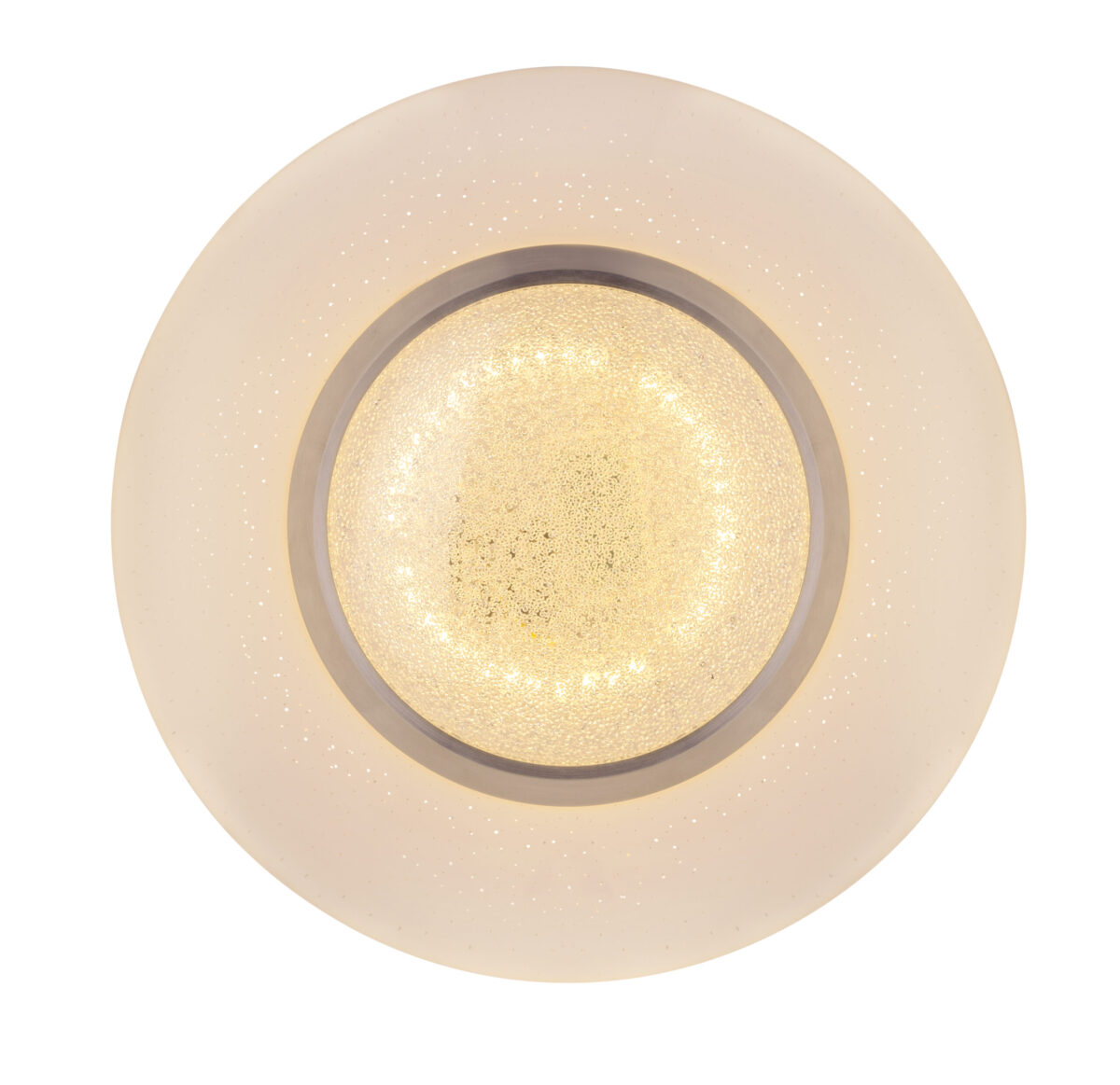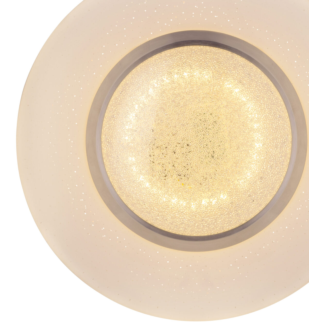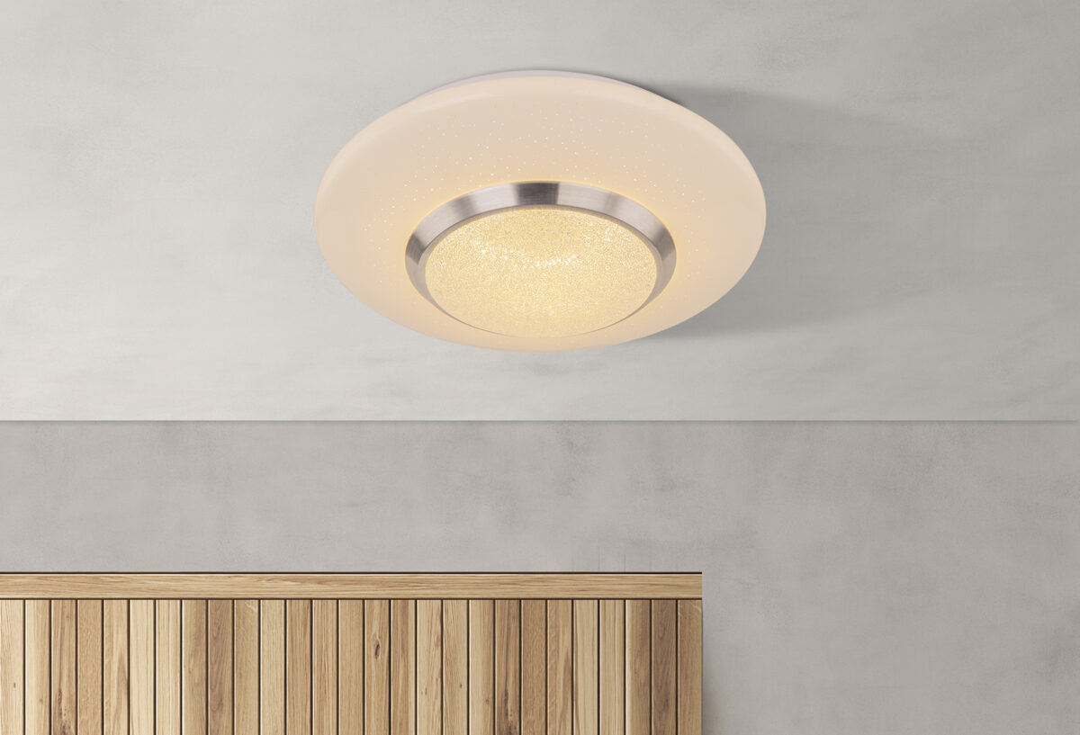 Ova prekrasna, okrugla plafonska lampa (34 cm) CANDIDA postavlja blistave akcente na vaša četiri zida. Unutar lampe se nalaze plastični kristali, koji impresivno odražavaju svjetlost ove bijele plafonske lampe sa opalnim akrilnim staklom uključujući Sparkle dekor. Plafonska lampa izgleda veoma plemenito čak i kada je isključena. Lampa se uklapa u svaki dnevni stil i savršeno se uklapa u spavaću sobu, dnevni boravak, dječju ili blagovaonicu. Svetiljka ima uključenu LED sijalicu od 18 vati i pruža jako svjetlo od 1060 lumena sa ugodno toplom bojom svjetlosti od 3000 Kelvina. Sa ostalim modelima ove serije možete dodatno uljepšati sliku svog životnog prostora.
