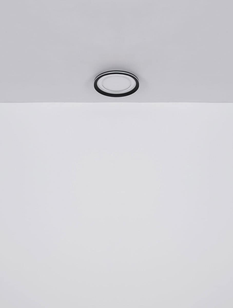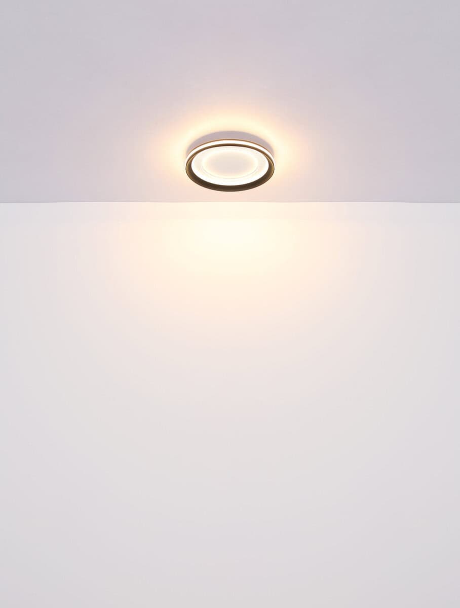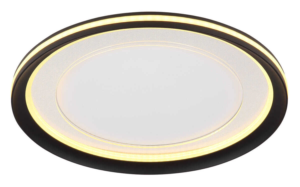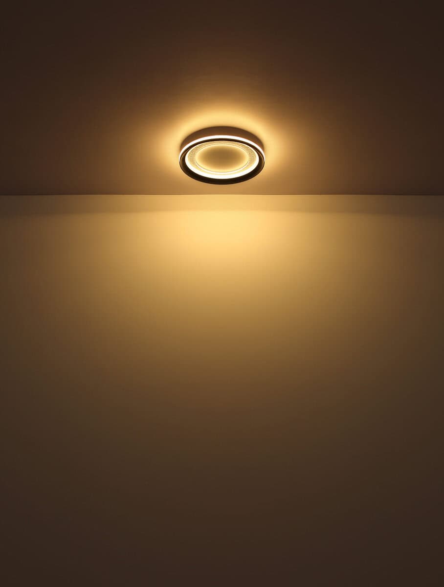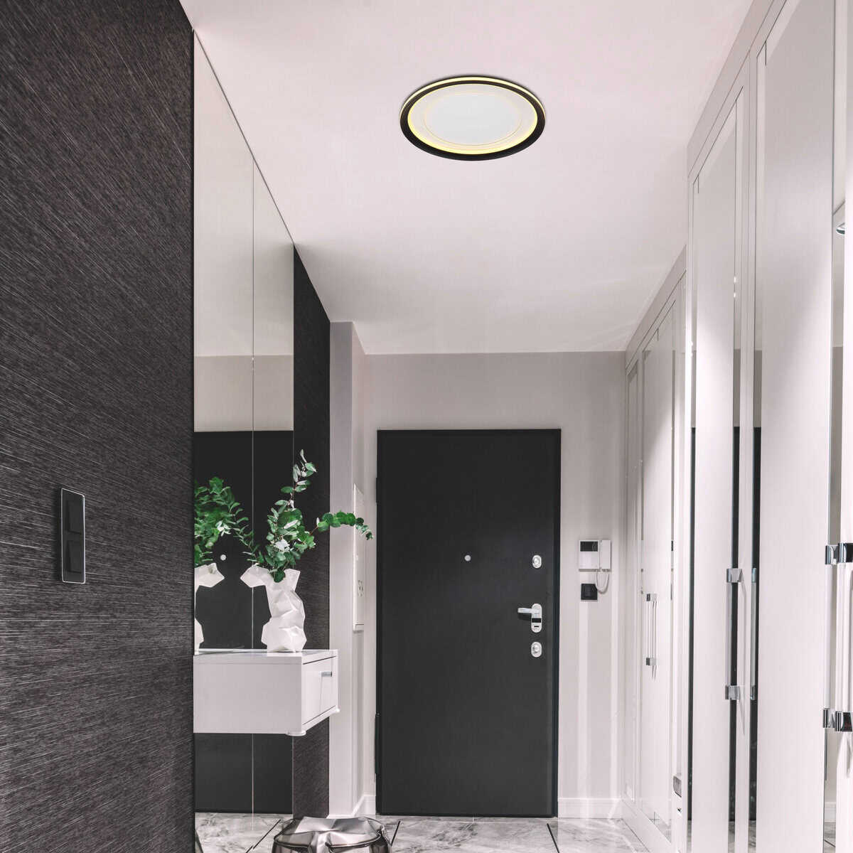 Ova plafonska lampa dojma uvjerava modernim dizajnom i funkcijama. Okrugla plafonska lampa (Ø 41,5 cm), napravljena od mat crnog aluminijuma i zrcalnog akrila, daje svetlost od 2700 Kelvina toplo belo do 6000 Kelvina hladno i može se prigušiti i fiksirati između ovih vrednosti svetlosti pomoću priloženog daljinskog upravljača. Memorijska funkcija vam omogućava da sačuvate posljednje korištene vrijednosti svjetla nakon isključivanja lampe i koristite noćno svjetlo za stvaranje ugodne atmosfere.