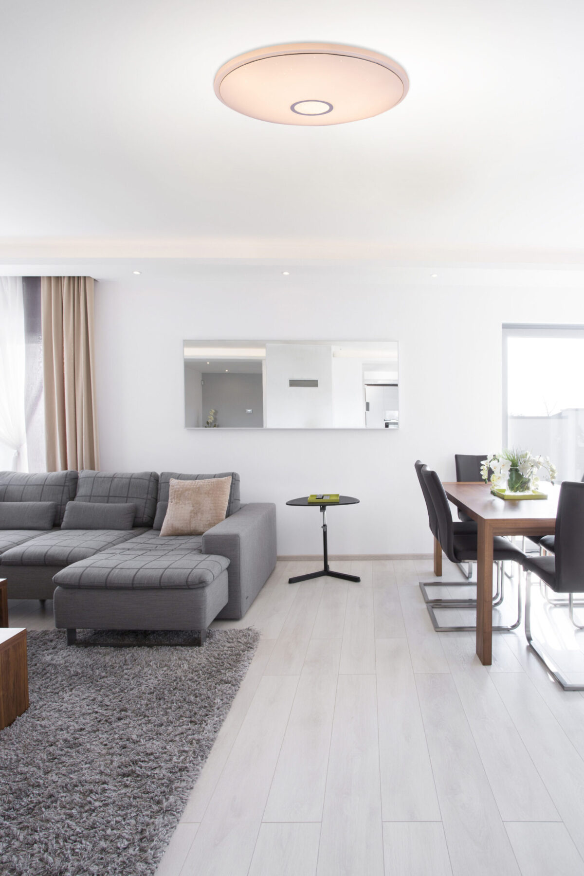 Ova moderna plafonska lampa impresionira svojim elegantnim dizajnom i brojnim funkcijama. Prečnik je 70 cm. Lampa je opremljena LED pločom 1xLED 30W 230V, izvor 2400lm, izlaz 1950lm. Na osnovu priloženog daljinskog upravljača može se podesiti tajmer, boja svjetla (3.000-4.500-6.000 Kelvina) može se mijenjati i svjetiljka zatamniti. Osim toga, proizvod ima funkciju spavanja.
