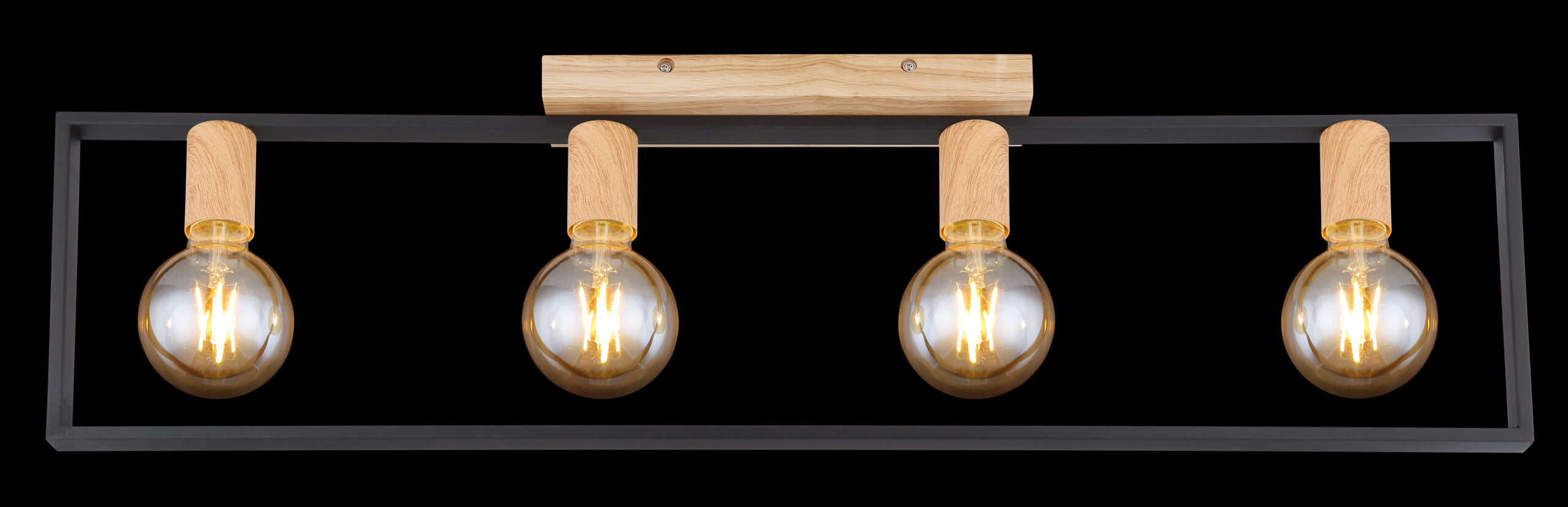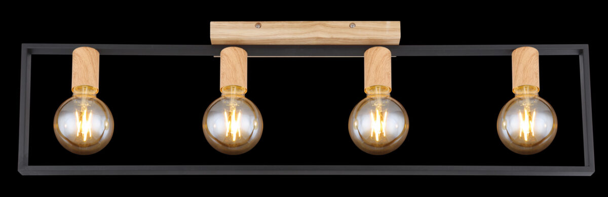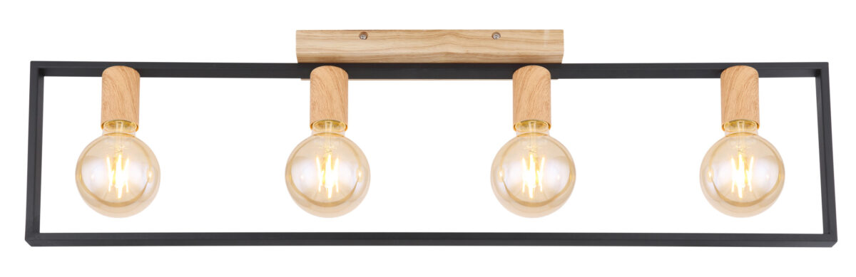 Ova stropna lampa uvjerava svojim elegantnim dizajnom od crno-mat metala i drveta. Plafonska lampa od 26 cm sastoji se od 90 cm dugog, pravougaonog metalnog okvira, koji je pričvršćen na drveni kockasti oblik i ima četiri E27 okvira uokvirena drvetom. Možete ih opremiti odgovarajućim lampama po vašem izboru, što vam daje mogućnost da individualno odredite boju svjetla i svjetlinu. Uz više artikala iz iste serije, možete stvoriti stilski ambijent u svom interijeru i upotpuniti cjelokupnu sliku.
