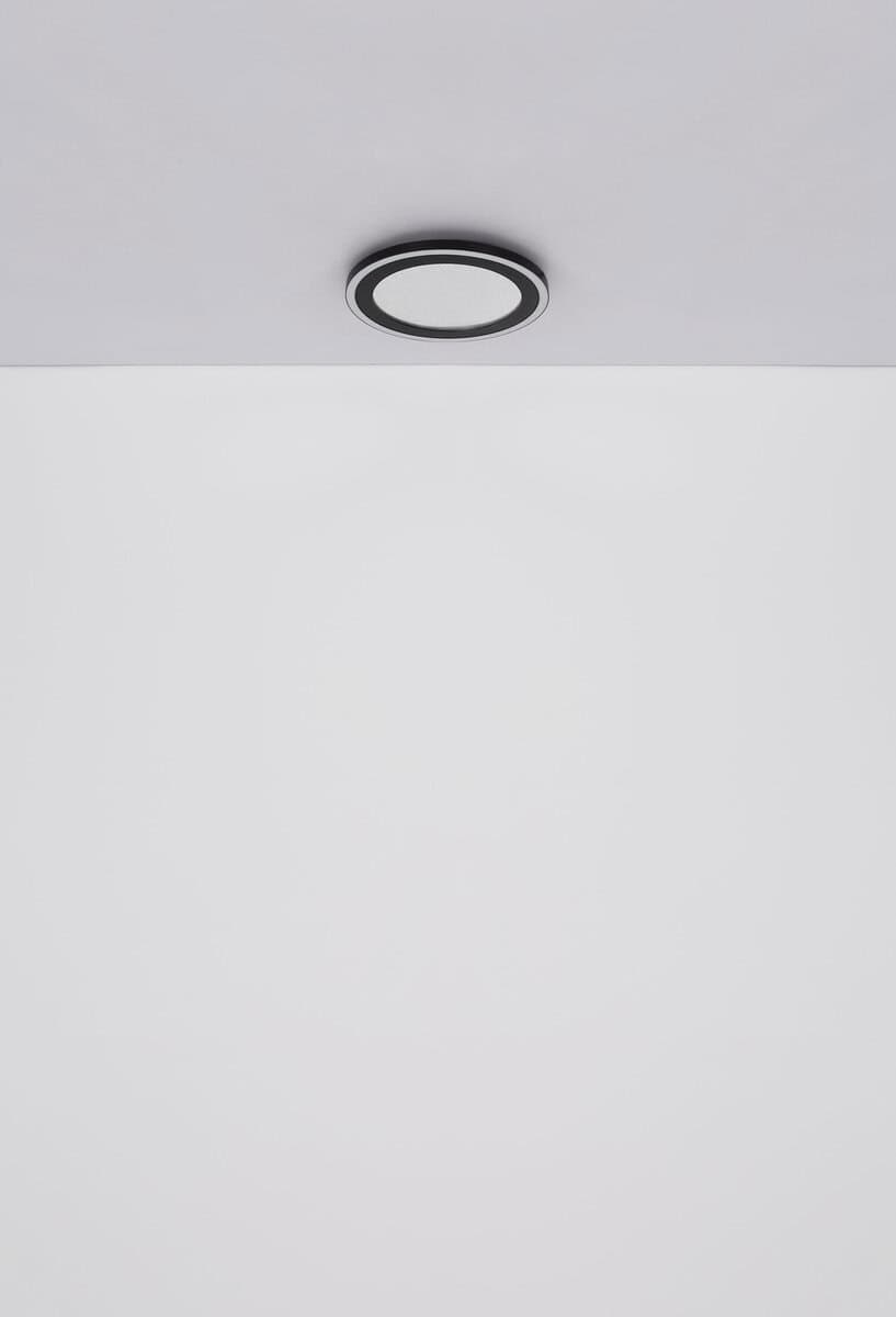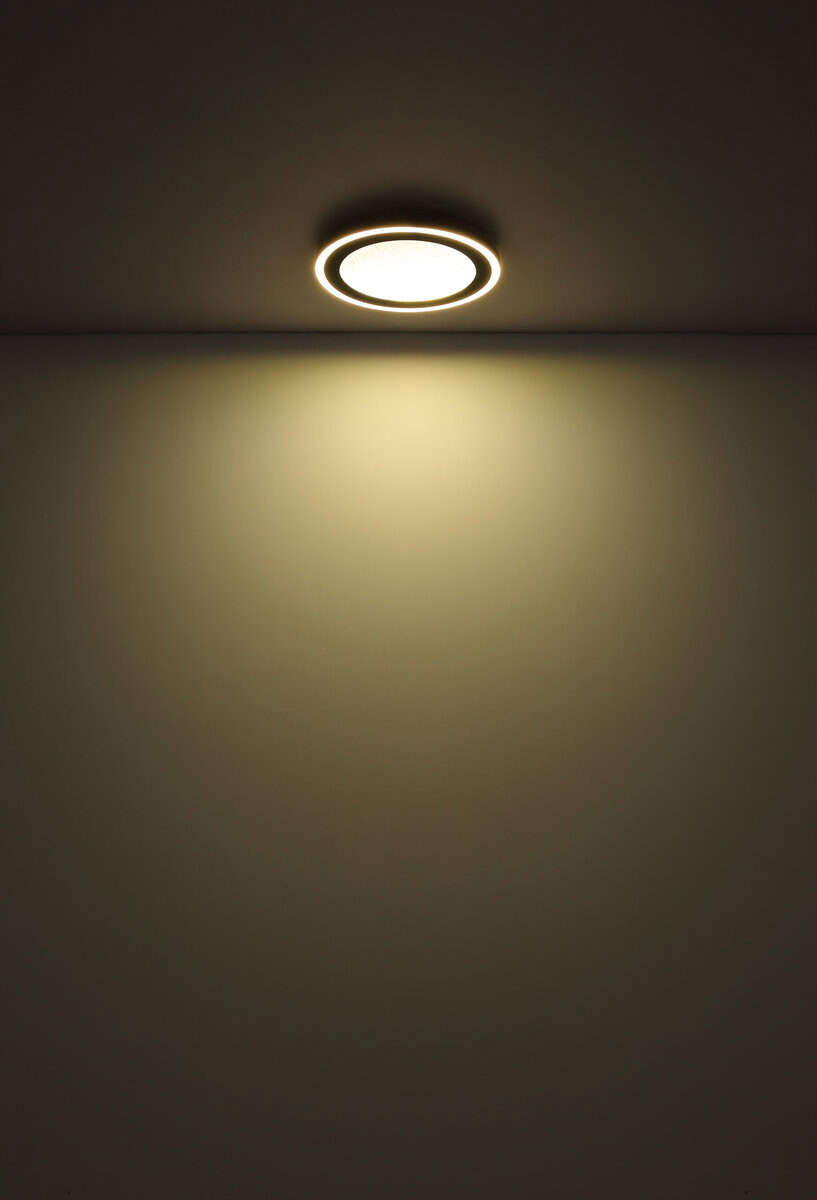 Plafonska lampa DAVIES je moderna i svestrana rasvjeta za svaku prostoriju. Svojim ravnim i okruglim dizajnom neprimjetno se uklapa u svaki interijer i stvara ugodnu svjetlosnu atmosferu. Tijelo DAVIES plafonske lampe je izrađeno od mat crnog metala i daje svjetiljci plemenit izgled. Sjenilo je izrađeno od crne mat plastike i opal plastike koja stvara mekan i difuzni svjetlosni efekat. Memorijska funkcija DAVIES plafonske svjetiljke je posebno praktična. Možete birati između tri različita nivoa osvetljenja: nivo 1 samo sa unutrašnjim svetlom, nivo 2 sa spoljnim prstenastim svetlom i nivo 3 sa oba zajedno. Svjetlo pamti vašu željenu postavku i automatski se vraća na taj nivo kada upalite lampu. Sa prečnikom od 340 mm i snagom od 500 lumena, DAVIES plafonska lampa je pravi vrhunac u svakoj prostoriji. Doživite ugodno osvjetljenje i elegantan dizajn DAVIES plafonske lampe i dajte svom domu posebnu atmosferu.