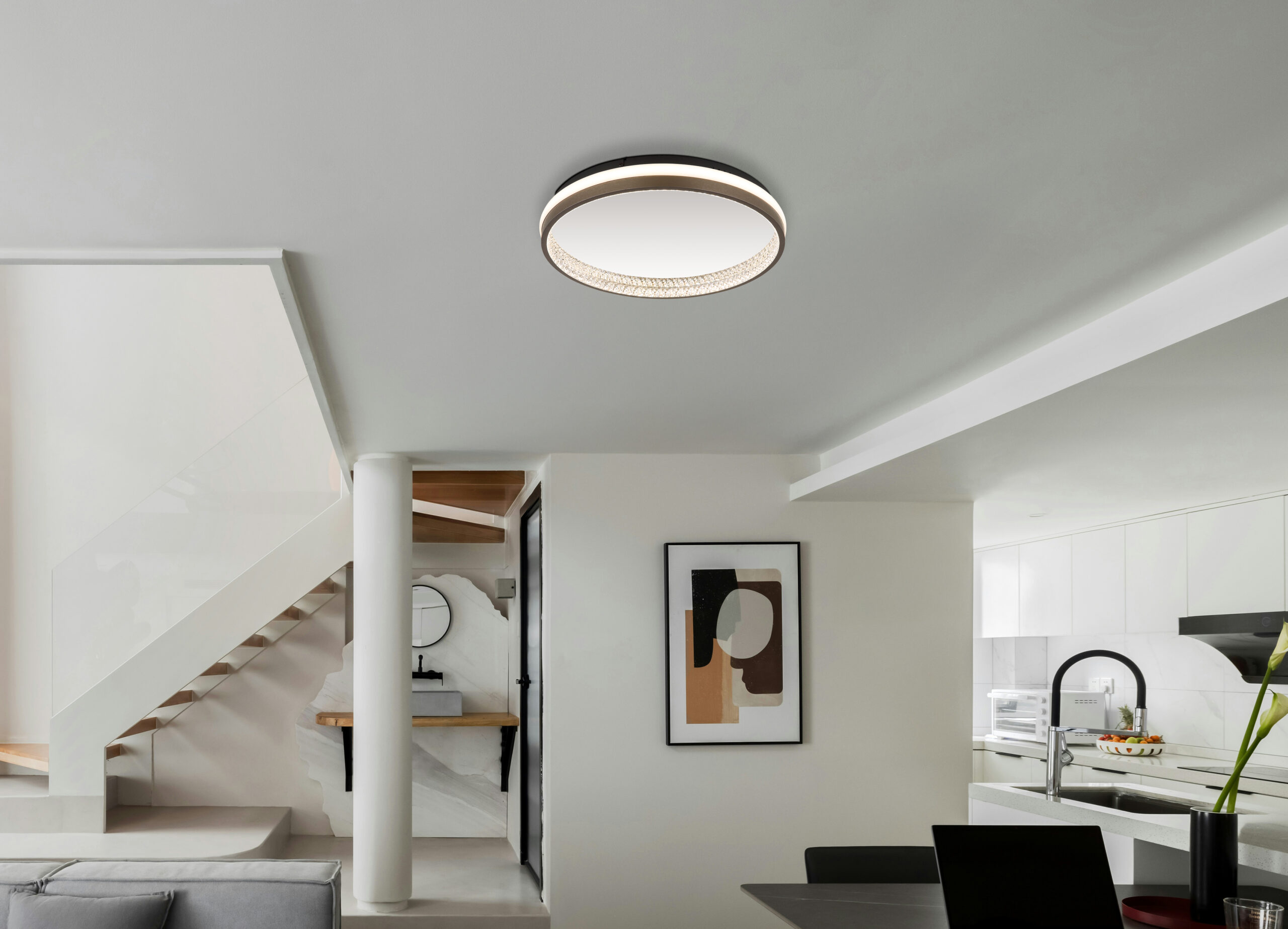 Otkrijte okruglu, ravnu plafonsku lampu DELLA, koja impresionira svojim modernim dizajnom i raznovrsnim funkcijama. Mat crno metalno kućište daje lampi elegantan i bezvremenski dodir. Sjenilo je izrađeno od tamno sivog aluminija, opal plastike i prozirnih plastičnih kristala koji stvaraju fascinantnu igru svjetla. Plafonska lampa DELLA je opremljena LED diodom i nudi CCT funkciju, koja omogućava beskonačno podešavanje temperature boje od 3000 K do 6000 K. Ovo vam omogućava da fiksirate boju svjetla prema vašim potrebama, od tople bijele do dnevne svijetlo bijele. Zahvaljujući ugrađenoj memorijskoj funkciji, svjetlo pohranjuje željena podešavanja, tako da uvijek možete uživati u savršenom svjetlu. Ova plafonska lampa je idealna za dnevne prostore kao što su dnevni boravak, spavaća soba ili hodnik. DELLA plafonska lampa kombinuje moderan dizajn sa visokom funkcionalnošću i donosi elegantne akcente i prijatno svetlo u vaš dom. Unesite savremen šik i raznovrsno osvetljenje u svoje sobe sa ovom elegantnom lampom.