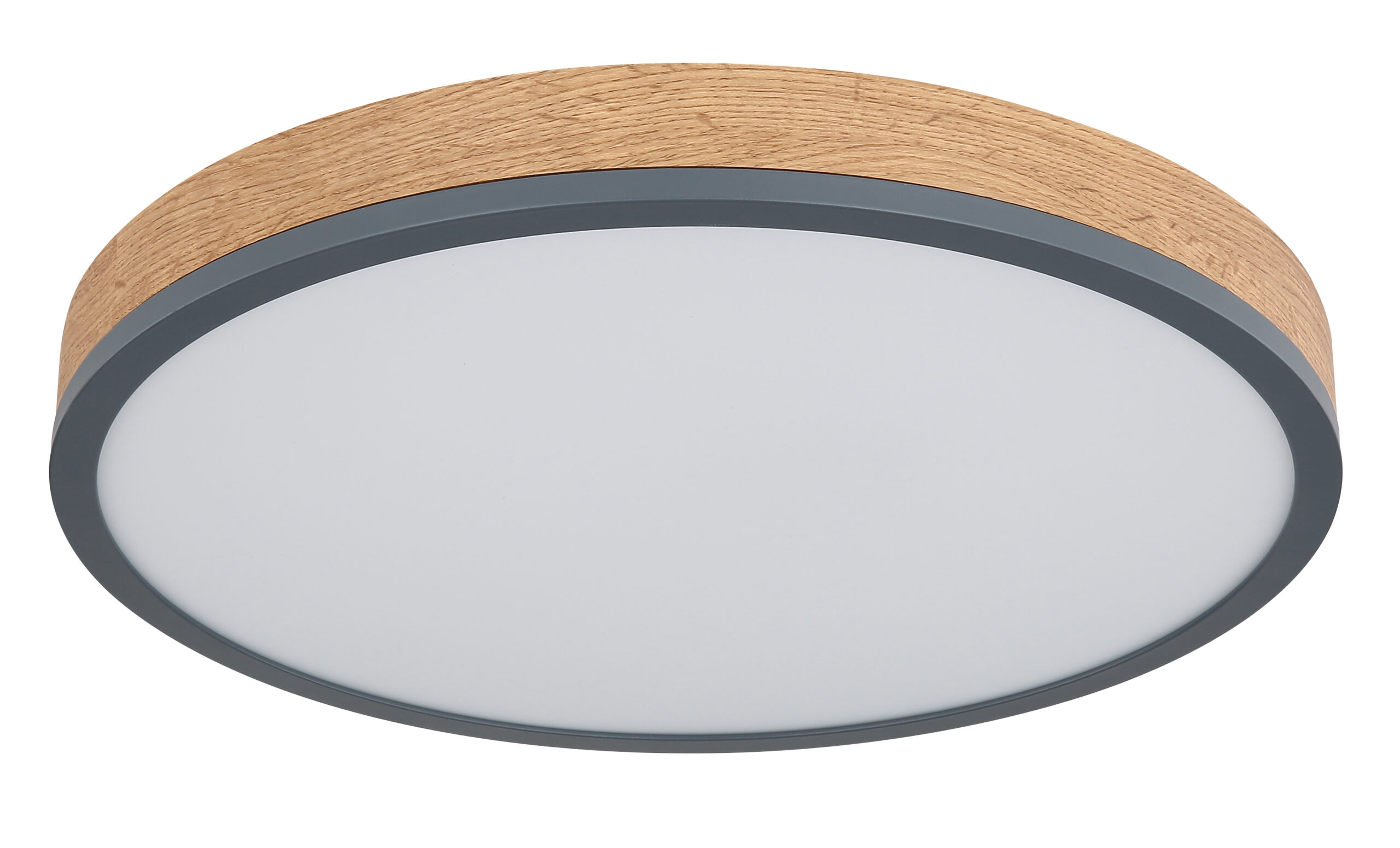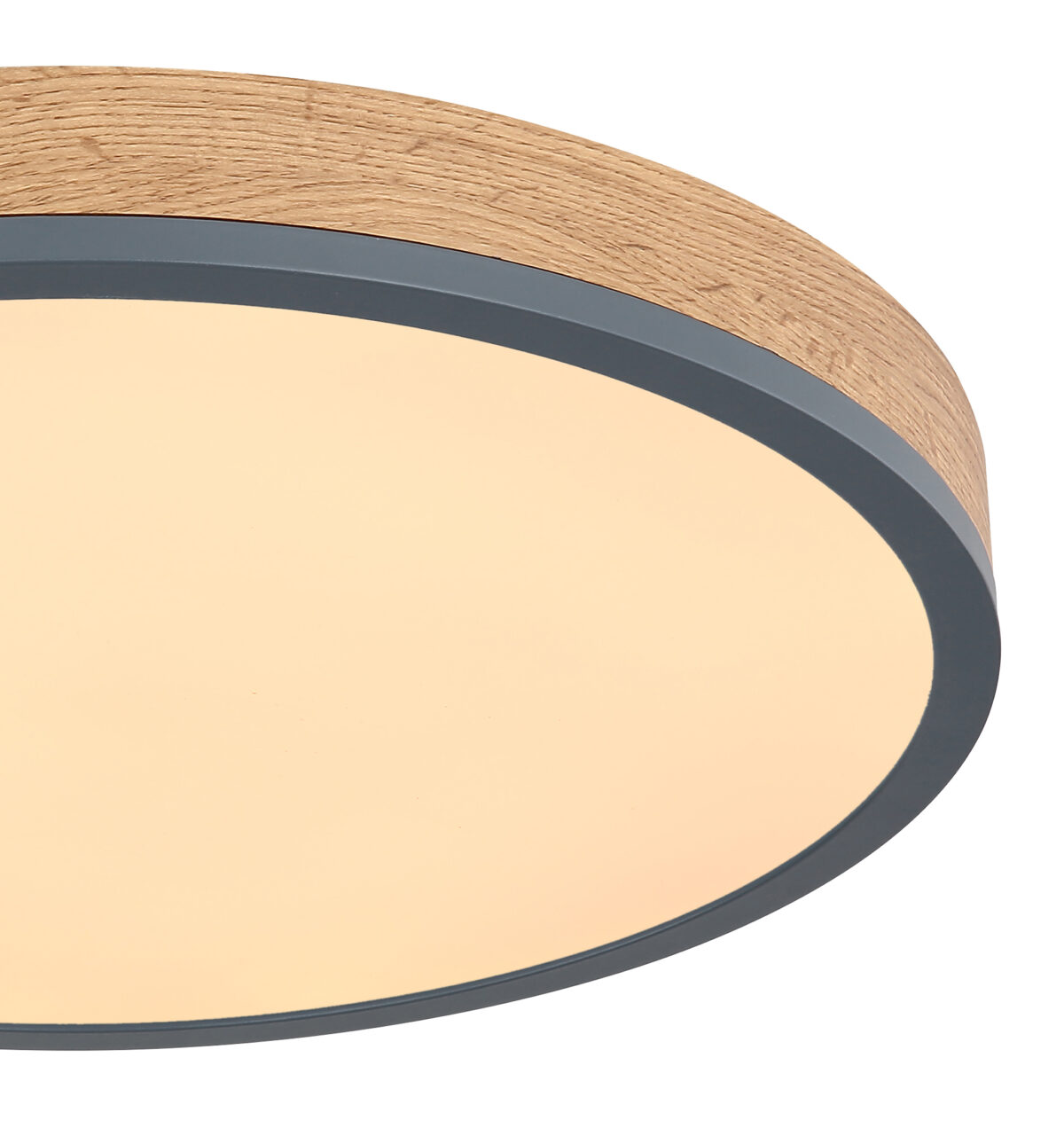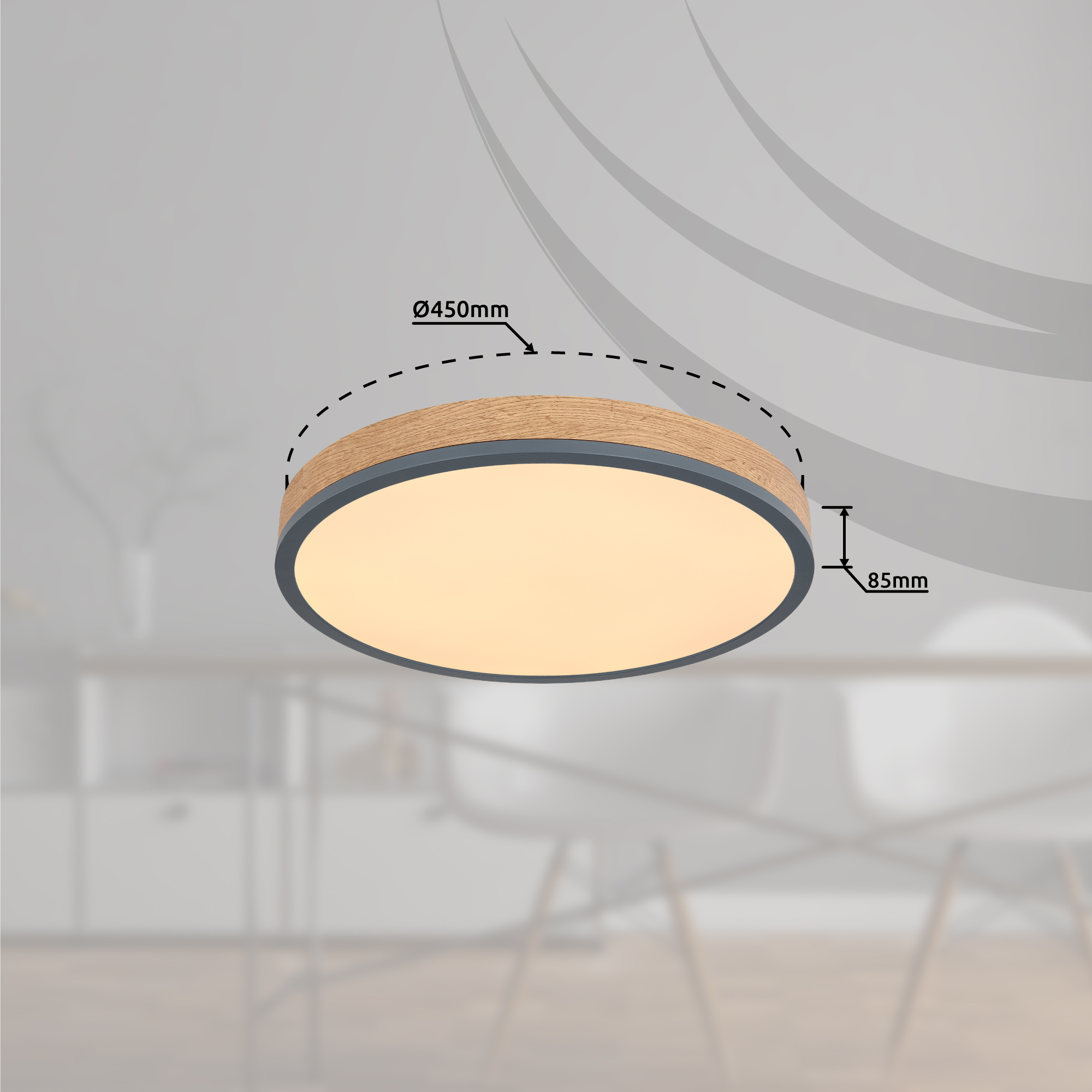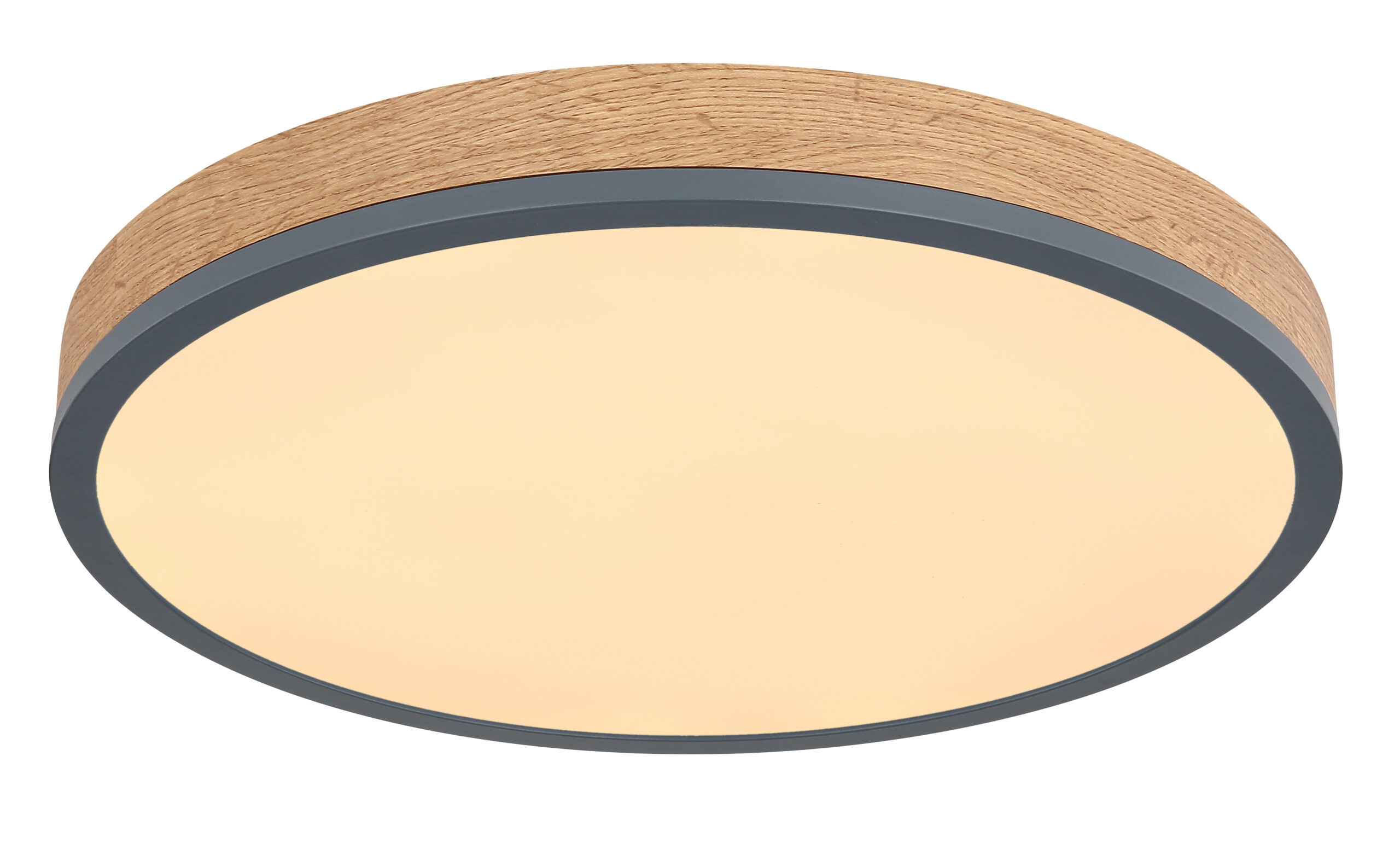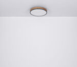 Ova okrugla plafonska lampa inspiriše svojim sjajnim dizajnom. Opal plastika, koja pokriva uključene LED sijalice, zatvorena je okruglim vanjskim kućištem od metala i medijapana u izgledu drveta (Ø45cm). Sa LED sijalicama, ovo daje ugodno toplo bijelo svjetlo od 3000 Kelvina.