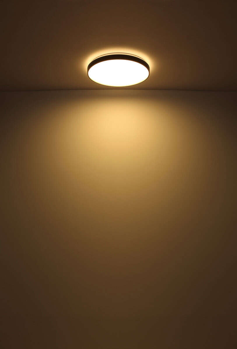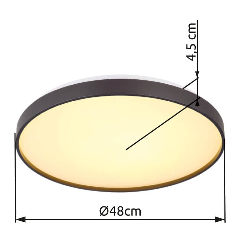 Plafonska lampa je prečnika 480 mm i visine 45 mm. Izrađen je od bijelog metala i opalnog akrilnog stakla. Plafonska rasvjeta je opremljena LED sijalicom snage 24W i napona 230V. Izvor svjetlosti ima svjetlinu od 2500lm izvor i izlaznu svjetlinu od 1400lm sa temperaturom boje od 3000K. Plafonska lampa je moderan i elegantan rasvjetni element, savršen za dnevni boravak, blagovaonicu ili spavaću sobu.