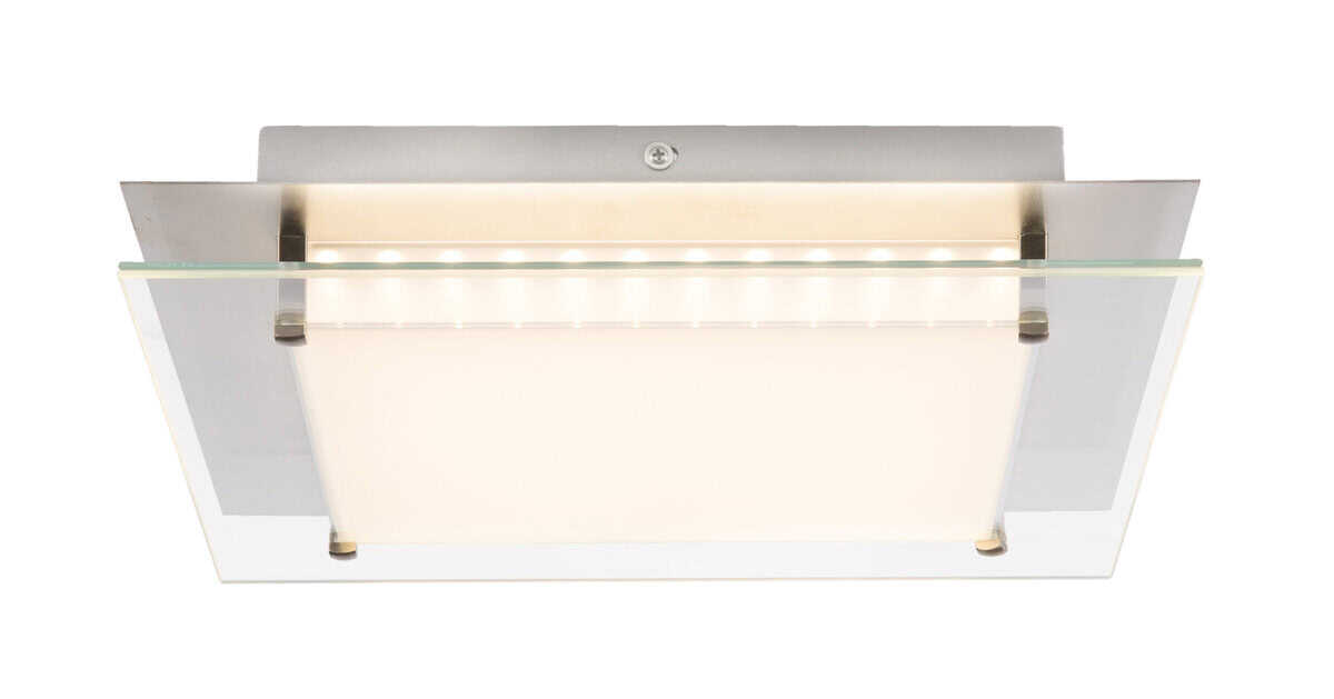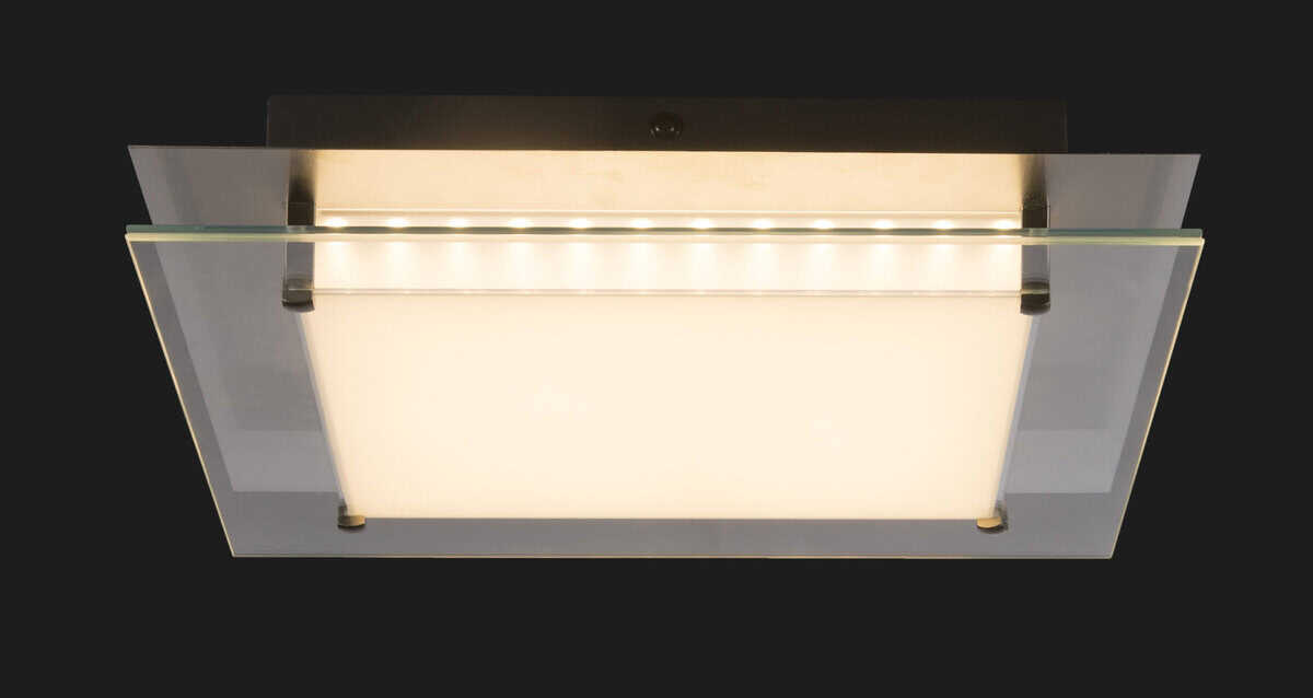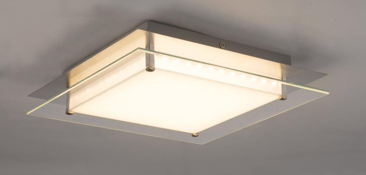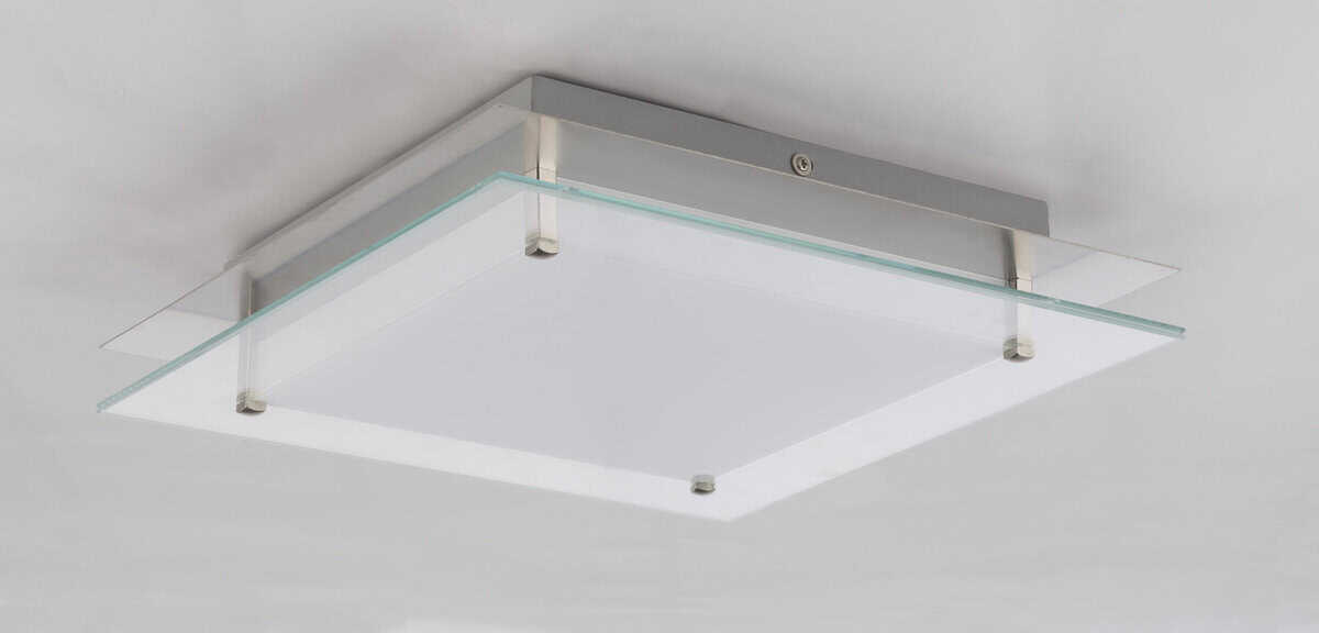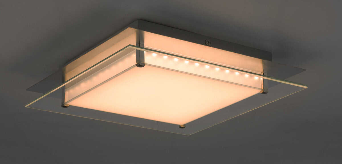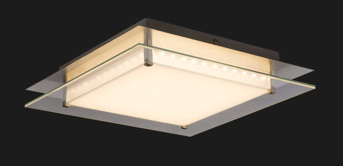 Ova kvadratna plafonska lampa (34 x 34 cm) kombinuje klasični stil i funkcionalnost. Maksimalno jako svjetlo od 1800 lumena (28W LED) ove stropne svjetiljke može se prigušiti. Satenirano, djelomično prozirno staklo pruža pravu atmosferu s ugodnom bojom tople bijele svjetlosti od 3000K. Alternativno, u istoj seriji modela postoje i veće i manje plafonske lampe veće ili manje snage.