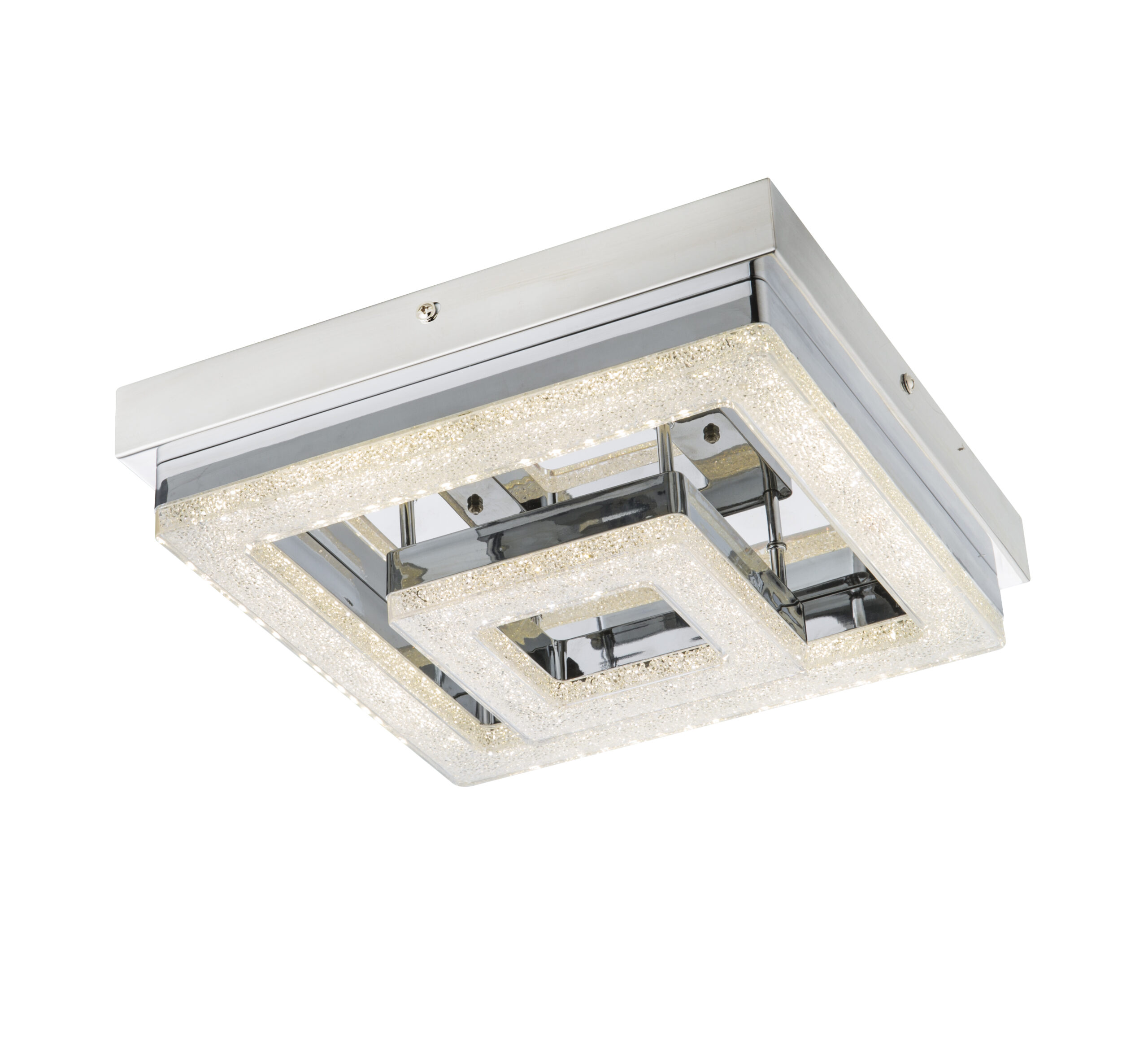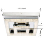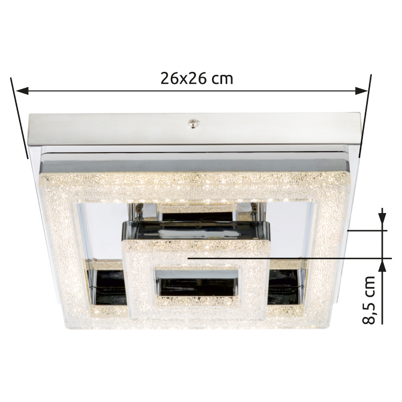 Ova raskošna, kvadratna plafonska lampa (26 x 26 cm), iz Fogo serije, idealna je za prekrasan dizajn enterijera i može se optimalno integrisati u sobe srednje veličine. Glavne komponente ove unutrašnje svjetiljke su dijelovi od nehrđajućeg čelika i akrila optočeni svjetlucavim kristalima K5, koji pružaju magično svjetlo i jedinstvenu atmosferu. Topla bela od 4000 Kelvina i jako svetlo od 950 lumena se doživljava kao prijatna nijansa. Sa ostalim modelima ove serije možete upotpuniti sliku u svojim sobama.