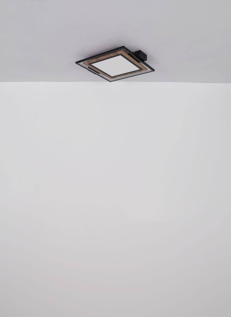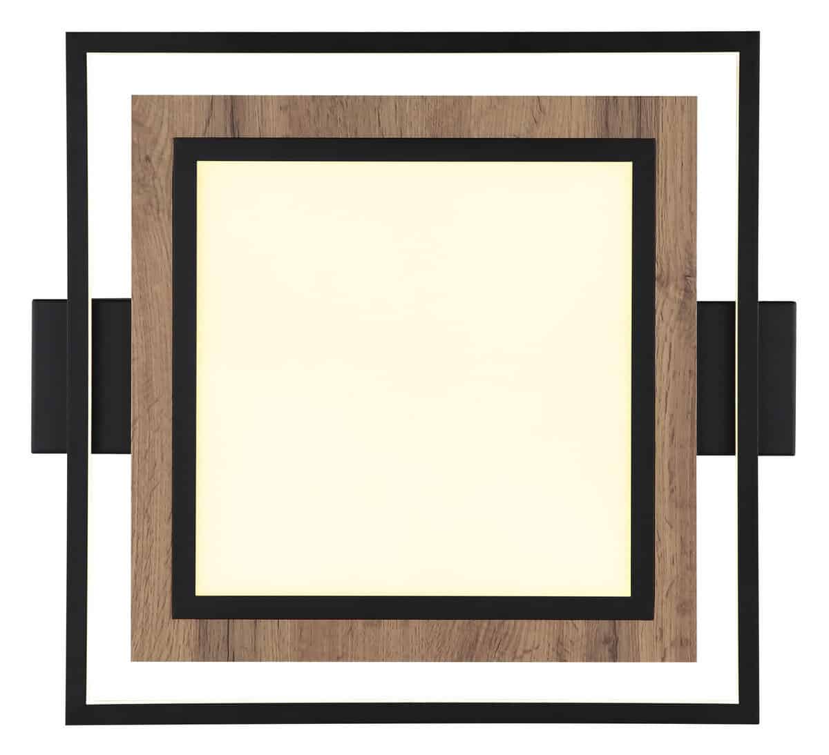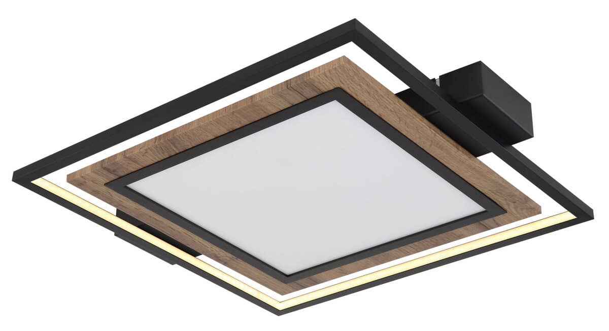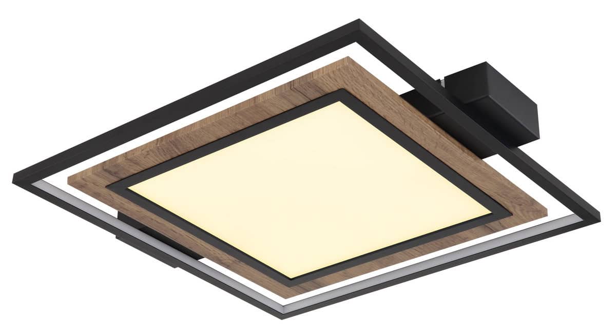 Plafonska lampa Globo Lighting je elegantan i jednostavan izbor za vaš dom. Lampa je izrađena od visokokvalitetnog metala u mat crnoj boji, MDF-a u izgledu tamnog drveta i opal plastike. Svetiljka se može zatamniti na nekoliko nivoa preko zidnog prekidača i ima memorijsku funkciju. U prvoj fazi LED svijetli u panelu, u drugoj fazi u okviru, au trećoj fazi, oba zajedno. S veličinom DxŠxV: 500x450x55mm i snagom od 36W, ova plafonska lampa je prava privlačna za oči u svakoj prostoriji. Za svetiljku je potrebna LED sijalica snage 36W i napona 230V koja je uključena u obim isporuke.