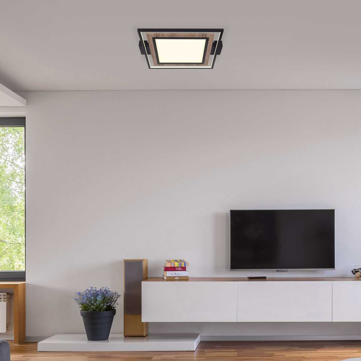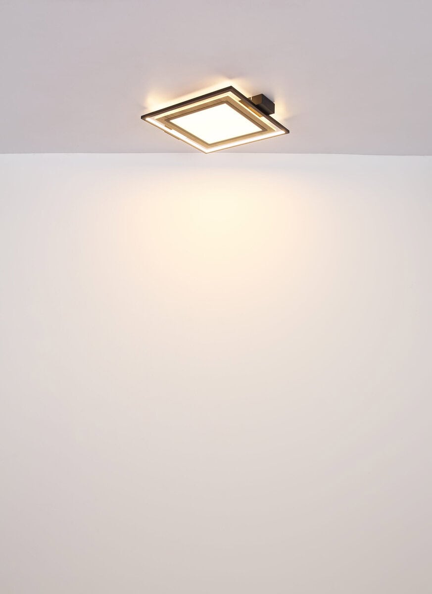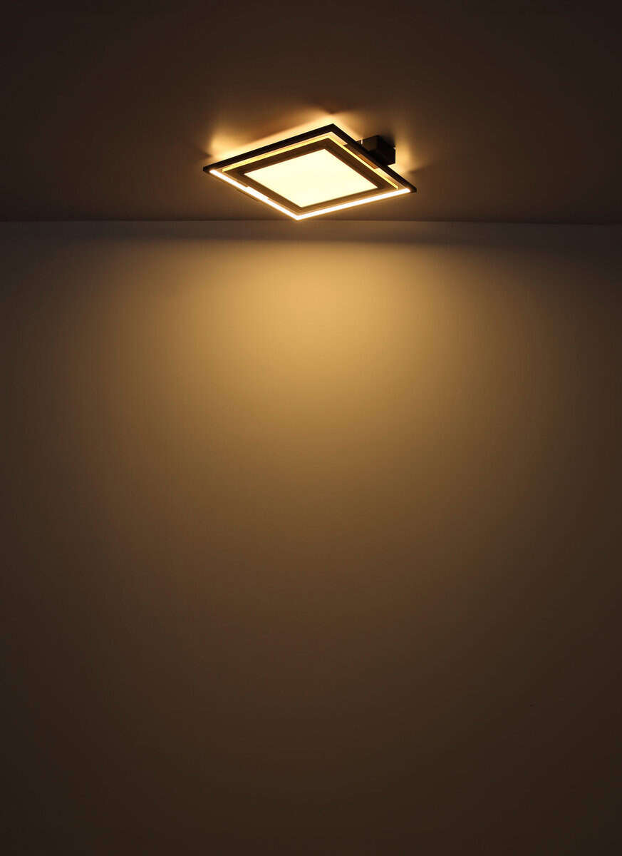 Plafonska lampa Globo Lighting je elegantan i jednostavan izbor za vaš dom. Lampa je izrađena od visokokvalitetnog metala u mat crnoj boji, MDF-a u izgledu tamnog drveta i opal plastike. Svetiljka se može zatamniti na nekoliko nivoa preko zidnog prekidača i ima memorijsku funkciju. U prvoj fazi LED svijetli u panelu, u drugoj fazi u okviru, au trećoj fazi, oba zajedno. S veličinom DxŠxV: 500x450x55mm i snagom od 36W, ova plafonska lampa je prava privlačna za oči u svakoj prostoriji. Za svetiljku je potrebna LED sijalica snage 36W i napona 230V koja je uključena u obim isporuke.