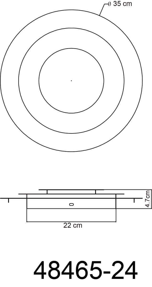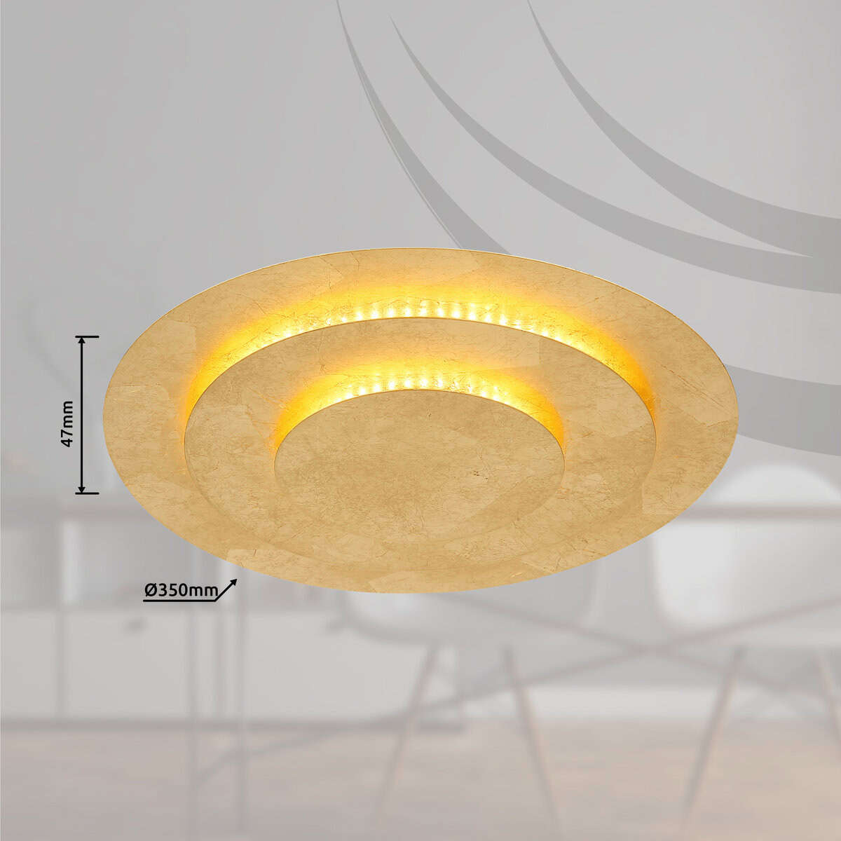 Plafonska lampa zlatne boje ima prečnik od 350 mm i visinu od 47 mm. Izrađena je od metala zlatne boje i opremljena je LED sijalicom snage 24W i naponom od 230V. Izvor svjetlosti ima svjetlinu od 3100lm izvora i izlaznu svjetlinu od 1500lm pri temperaturi boje od 3000K.