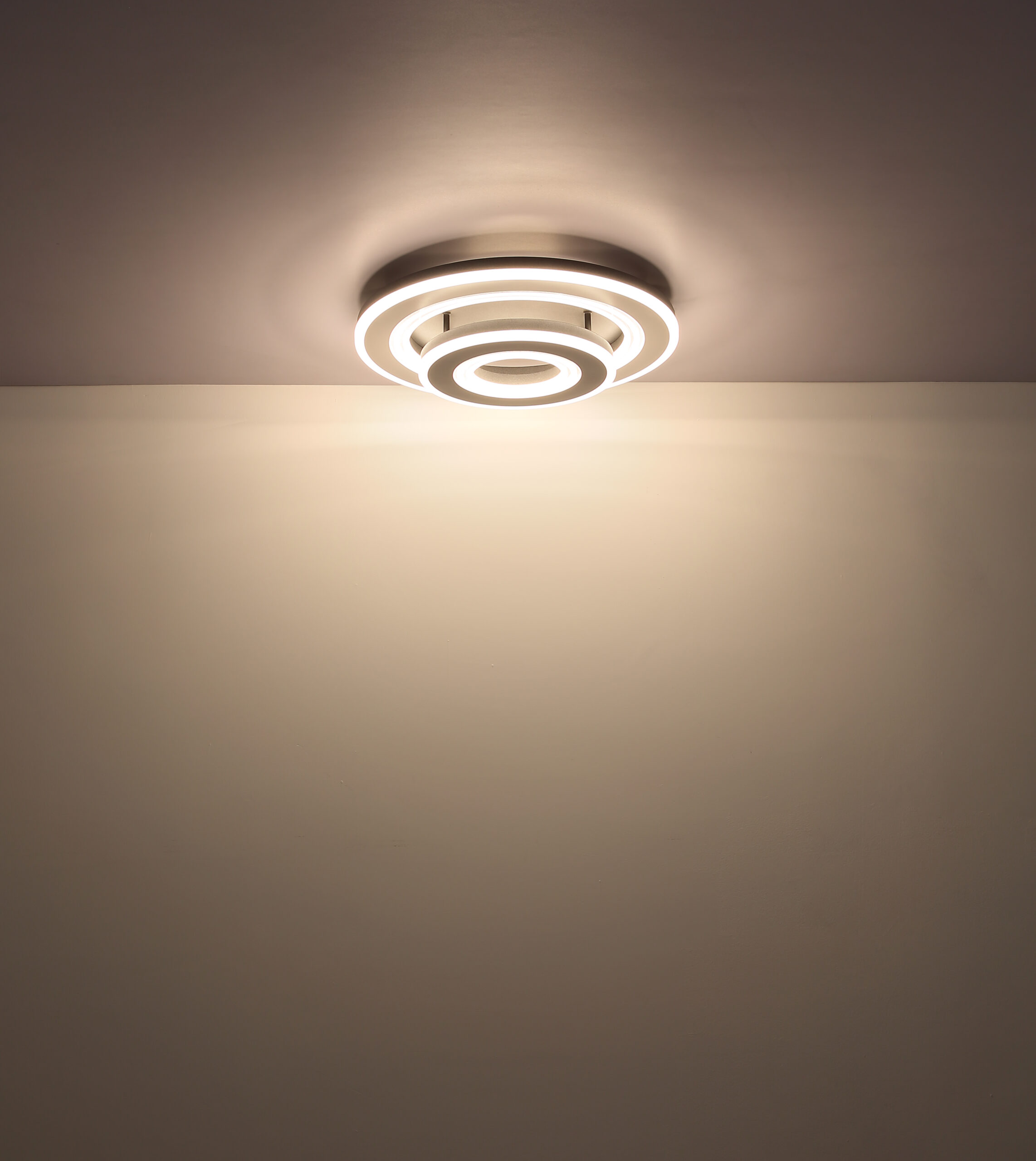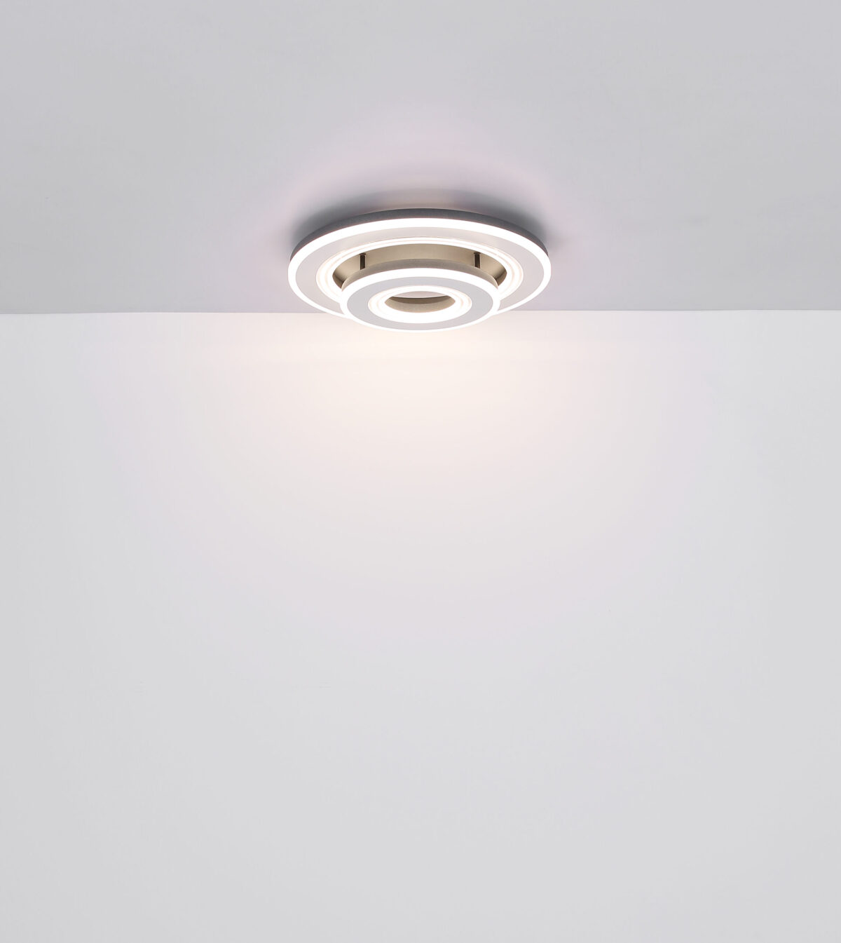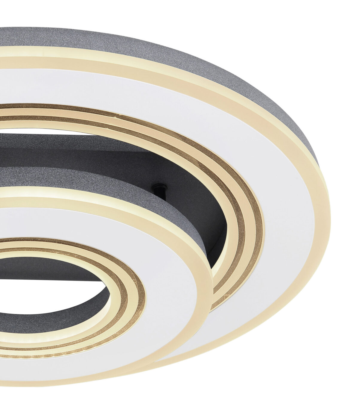 Ova okrugla plafonska lampa iz serije Jack (ø 50 cm) impresionira svojim elegantnim dizajnom crno-belih metalnih prstenova. Sastoji se od nekoliko prstenova koji su opremljeni opalnim akrilom. Uključene LED sijalice pružaju 2080 lumena jakog svjetla, pri čemu možete podesiti boju svjetla u nekoliko faza između tople i hladne bijele (2700 do 6000 Kelvina) pomoću priloženog daljinskog upravljača. Na ovaj način možete prigušiti stropno svjetlo i imati funkciju noćnog svjetla. Sa drugim modelima iste serije možete upotpuniti cjelokupnu sliku u svoja četiri zida i pružiti moderan ambijent.
