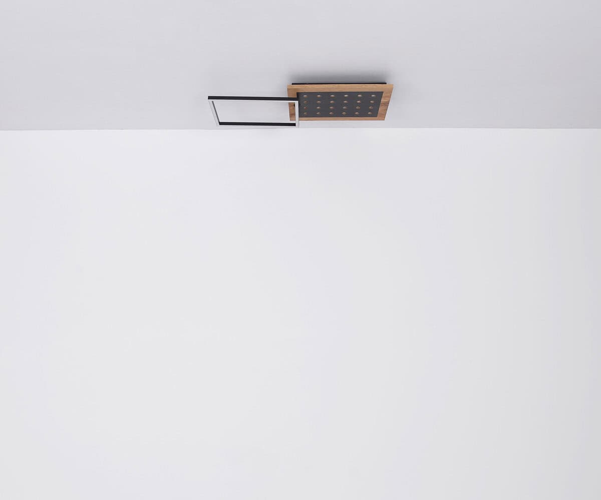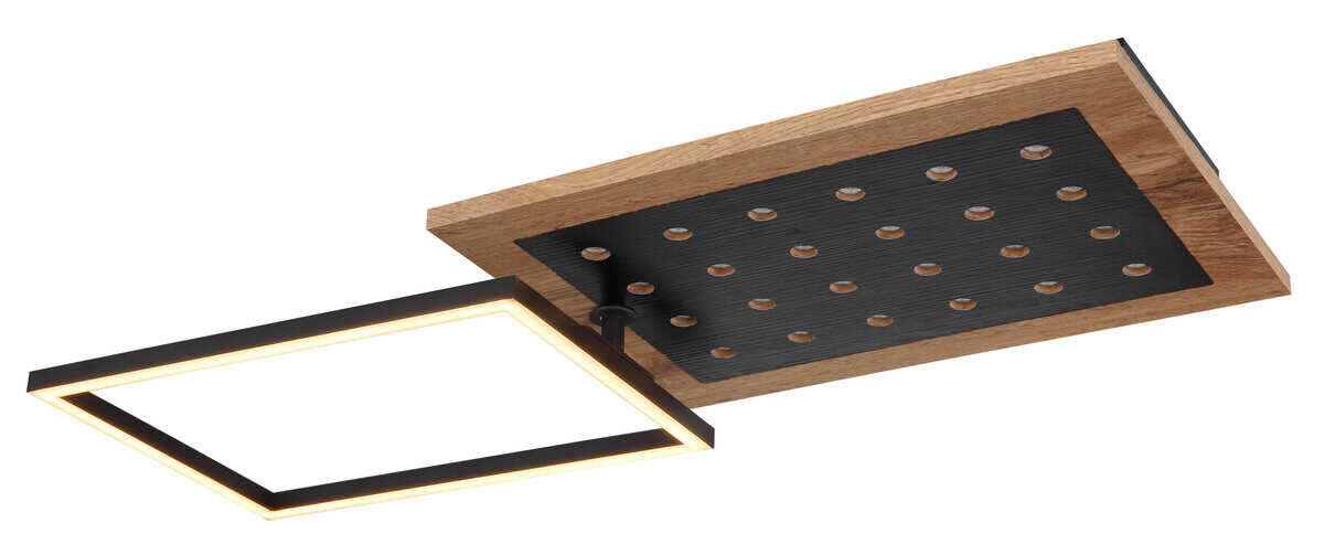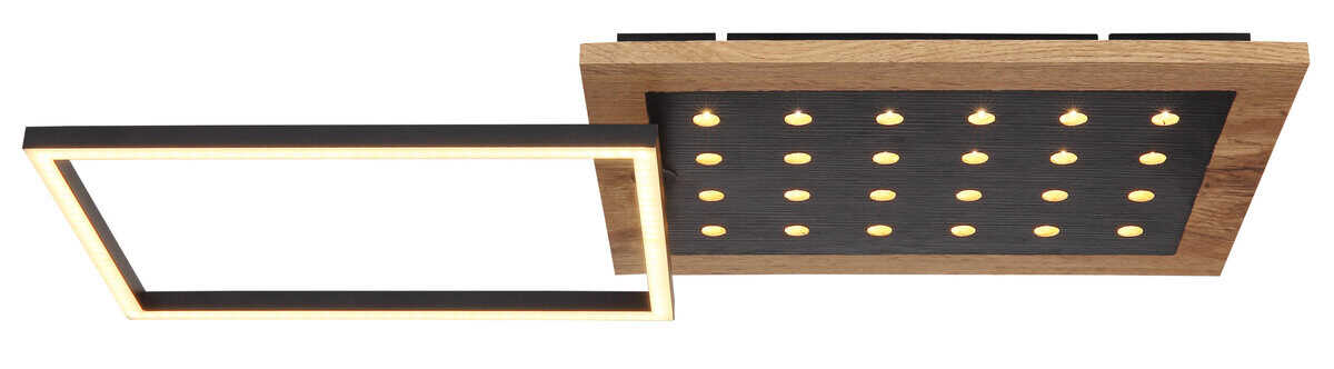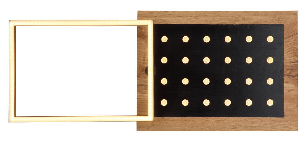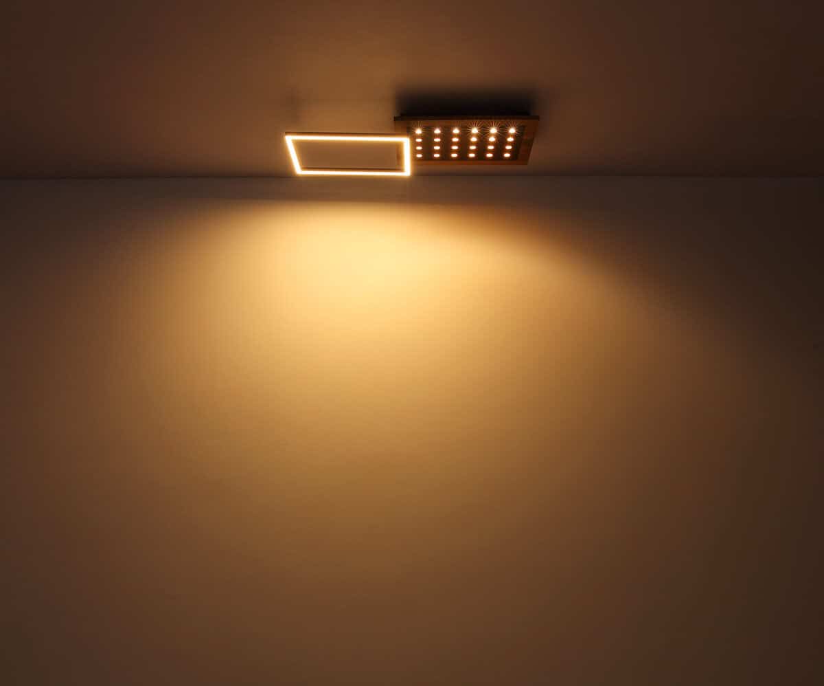 Ova moderna plafonska lampa inspiriše svojim sjajnim izgledom. Sastoji se od okretnog LED okvira i fiksnog MDF panela u izgledu drveta sa dodatnim LED svjetlima maksimalne dužine i širine 63x27cm. Emituju ugodno toplo bijelo svjetlo od 3000 Kelvina u 3 koraka preko zidnog prekidača i imaju memorijsku funkciju koja čuva posljednju korištenu postavku.