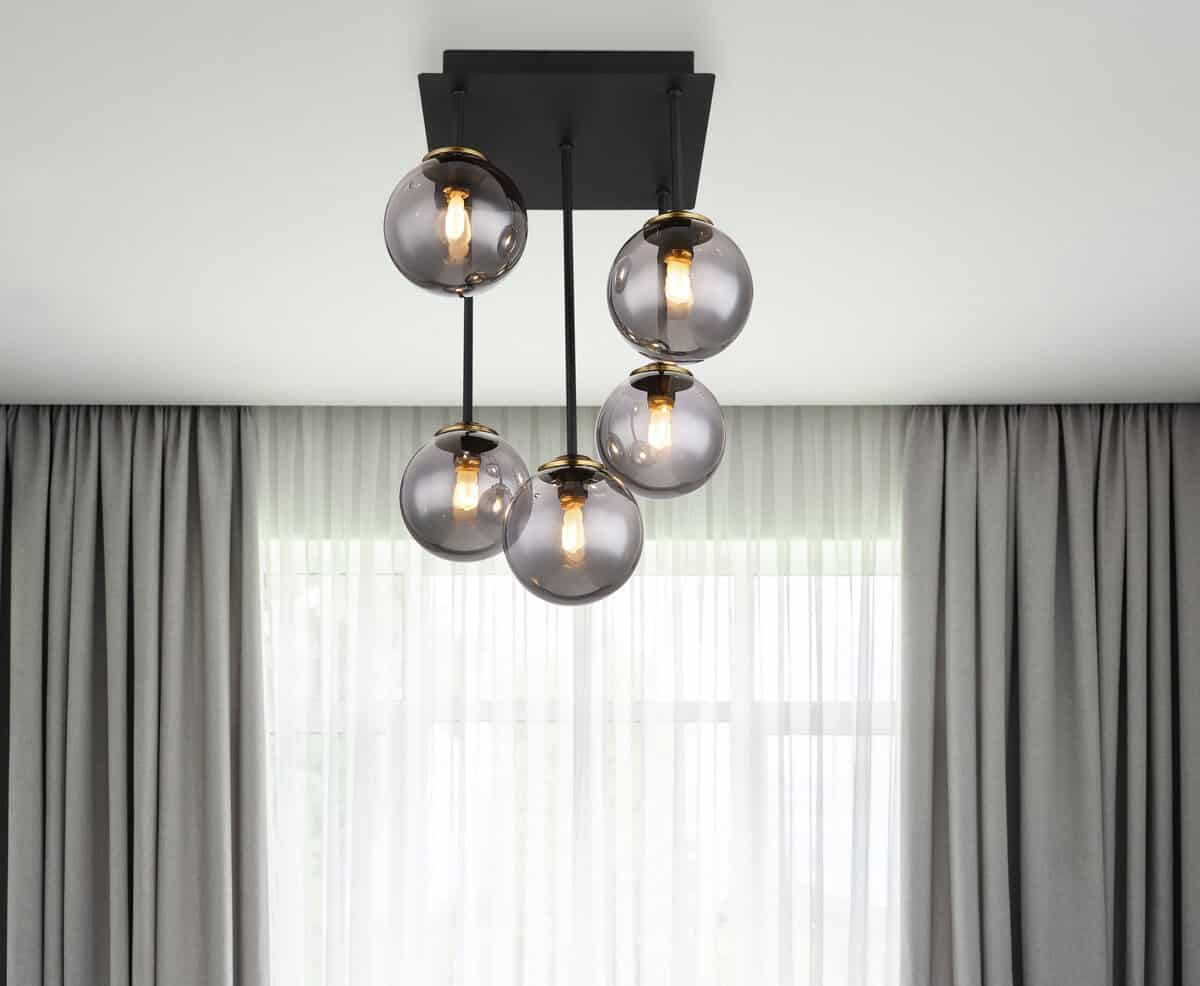 Ova sjajna plafonska lampa inspiriše prelepim dizajnom. Pet prekrasnih staklenih sjenila u dimnim bojama (Ø10cm) visi na crnim mat metalnim šipkama različitih dužina, na pravougaonom plafonskom nosaču (25x25cm) do 38cm naniže. G9 utičnice vam omogućavaju da sami odlučite o boji svjetla i jačini do maksimalne snage od 25 vati.