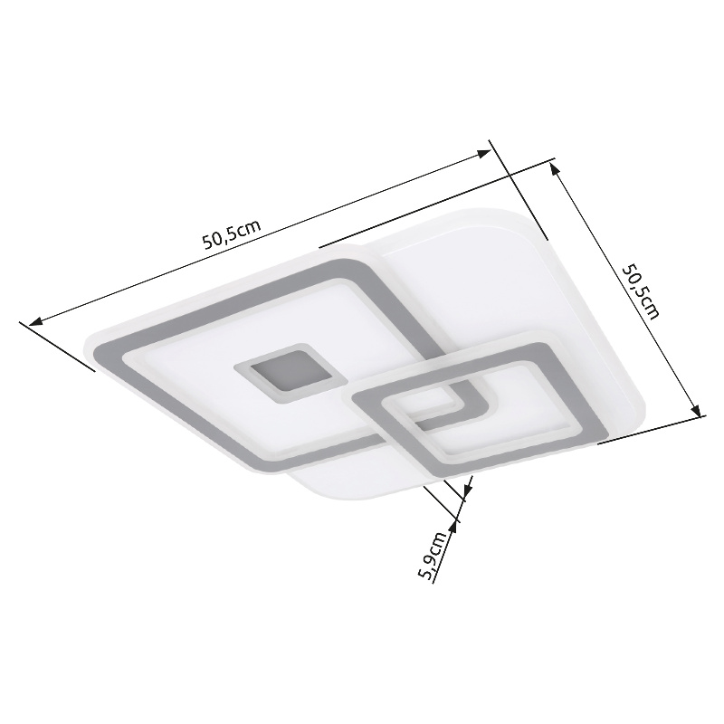 Sa ovom modernom LED plafonskom lampom serije KIQUE (50 x 50 cm) možete unijeti high-tech u svoja četiri zida. Opremljen memorijskom funkcijom, izmjenjivačem boja i daljinskim upravljačem, nijedna želja ne ostaje neispunjena. Vrhunac je, međutim, funkcija Smart Home, svjetiljka je kompatibilna sa Smart Home i Alexa i može se upravljati glasovnim unosom. Nadalje, svjetlosni objekt ima LED ploču od 50 vati sa vijekom trajanja od 20.000 sati. Ovom Smartlight lampom se lako može upravljati pomoću aplikacije Tuya Smart (Android TM/IOS). Ova plafonska lampa se može prigušiti i omogućava da se njena boja svetla podešava daljinskim upravljačem (3000K-6000K).