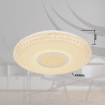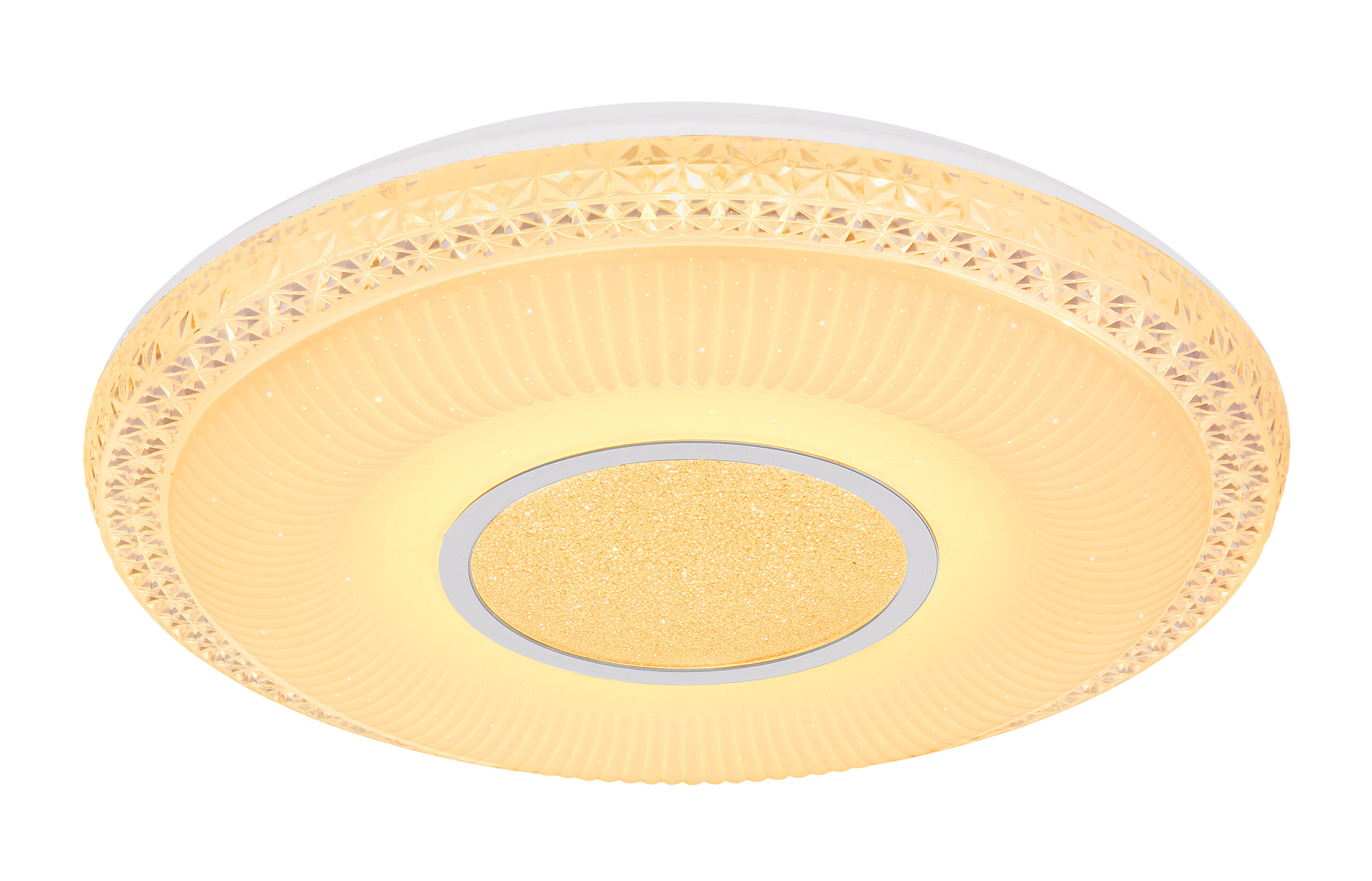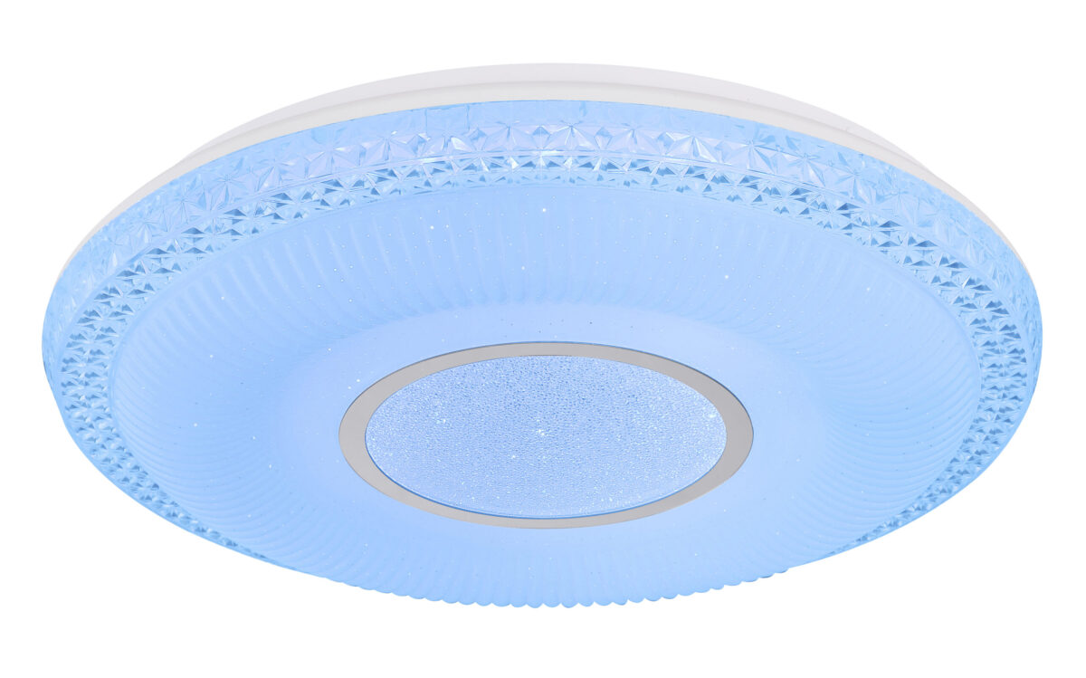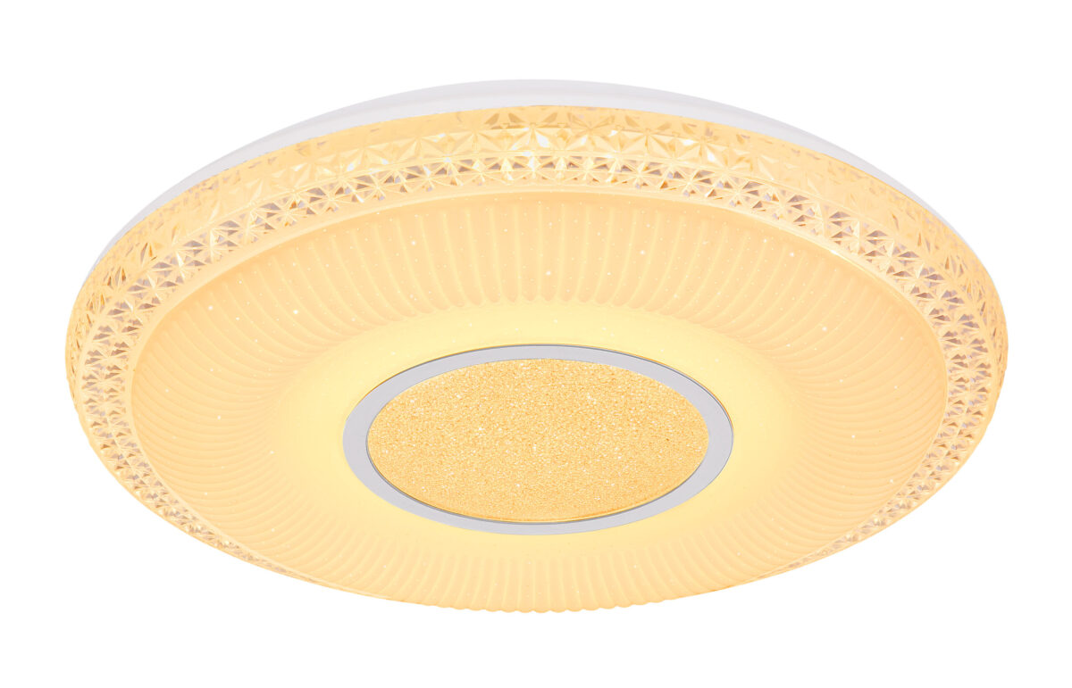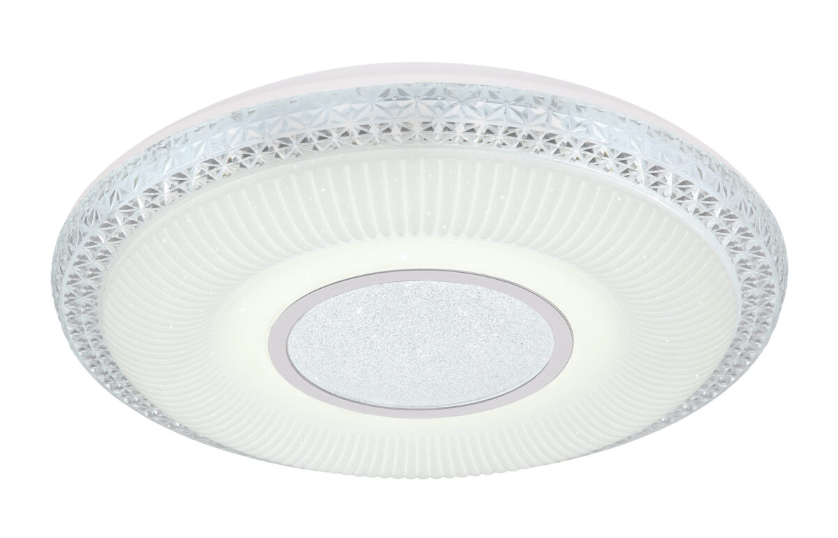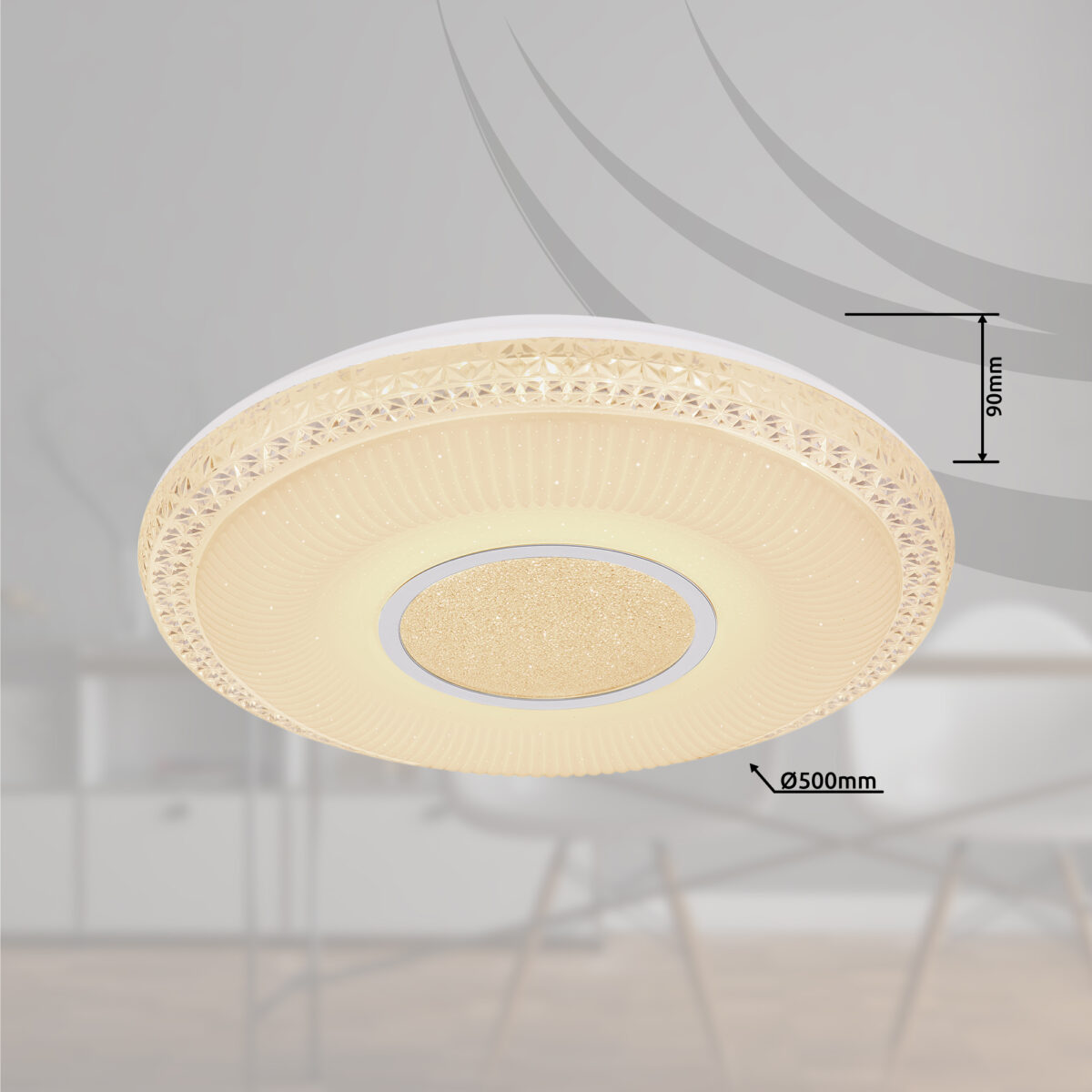 Plafonska lampa KLEMENS oduševljava svojom ljepotom i funkcionalnošću. Okrugla unutrašnja lampa sa mogućnošću zatamnjivanja sa opalnim akrilnim staklom očarava Vašu dnevnu sobu sa Sparkle dekor elementima. Obrađeni hromirani prsten ponovo je začinio dizajn ove lampe. Pomoću priloženog daljinskog upravljača, boja ove lampe se može mijenjati ili fiksirati. Zahvaljujući integrisanoj LED sijalici od 40W, ova plafonska lampa obezbeđuje do 2140 lumena jakog svetla sa svetlom bojom od toplo bele 3000 Kelvina do hladno bele od 6000 Kelvina. Uključena RGB sijalica omogućava da vaša soba sija u različitim bojama. Osim toga, ova lampa ima noćno svjetlo ili funkciju memorije. Ova prekrasna unutrašnja lampa pogodna je za spavaće sobe, dječje, hodnike i dnevne sobe.