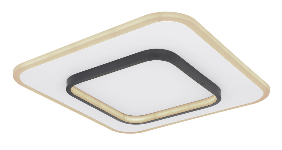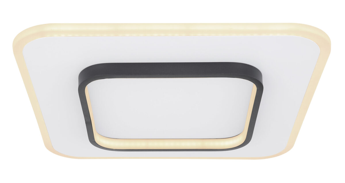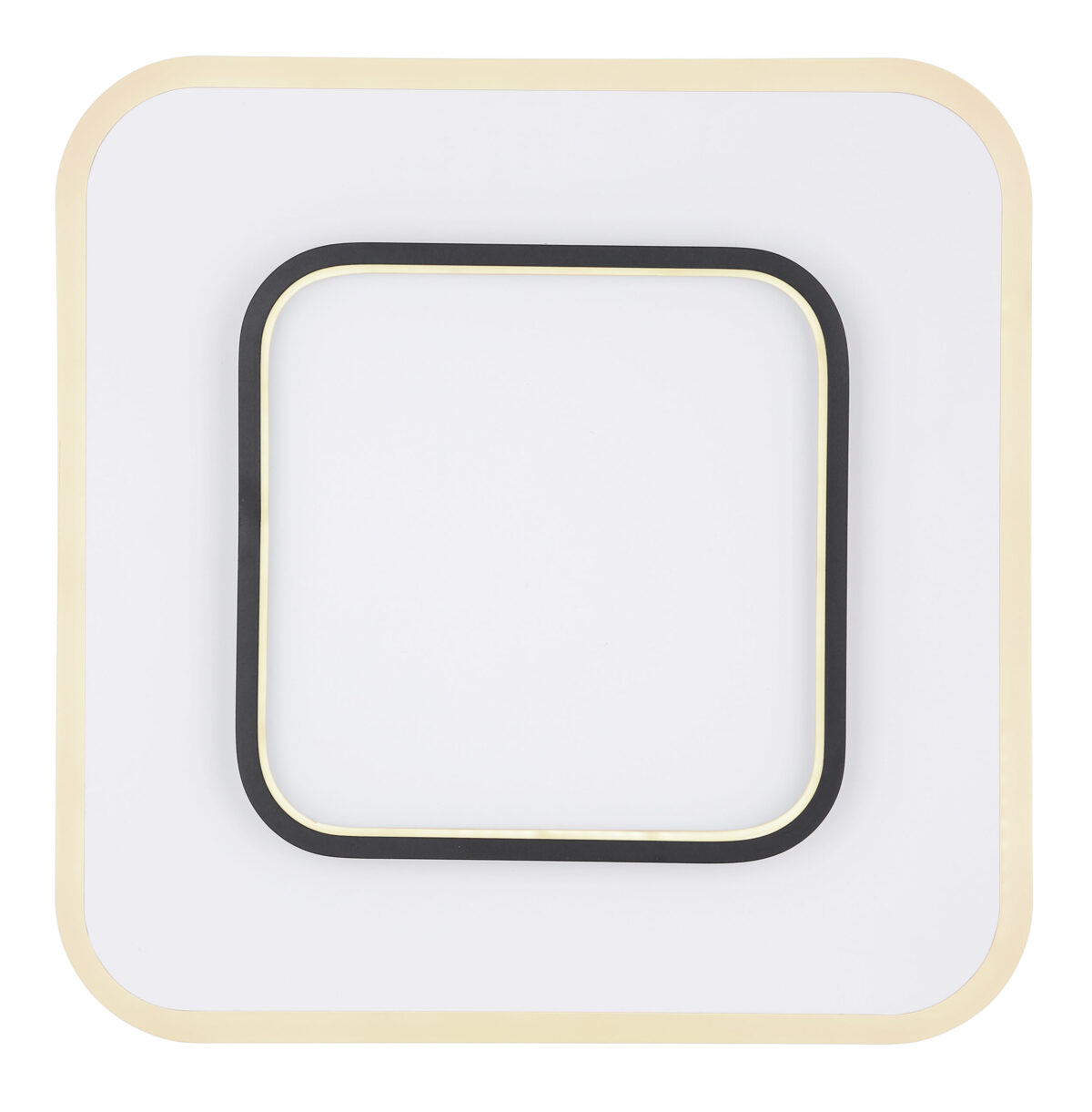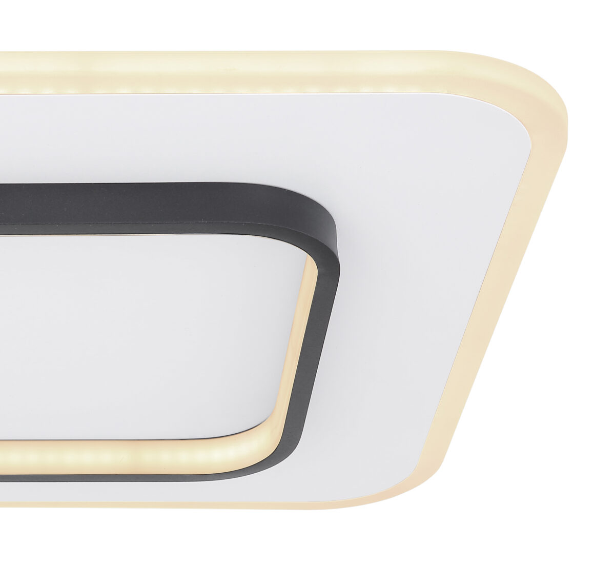 Ova kvadratna plafonska lampa iz serije Lima (45,8×45,8 cm) uvjerava svojim jednostavnim dizajnom od bijelog metala i opalnog akrila. Četvrtasti crni prsten u sredini plafonske lampe je još jedna karakteristika, koja ga čini predivnim za kombinovanje. LED sijalice pružaju 2500 lumena jakog svjetla. Osim toga, priloženi daljinski upravljač ne nudi samo mogućnost da prigušite svjetlo, već i da prilagodite boju svjetla u nekoliko koraka između tople bijele (3000 Kelvina) i hladno bijele (6000 Kelvina) prema vašim željama. Sa ovom plafonskom lampom možete stvoriti moderan ambijent u svom enterijeru.