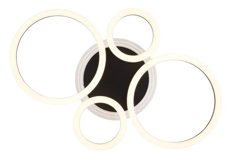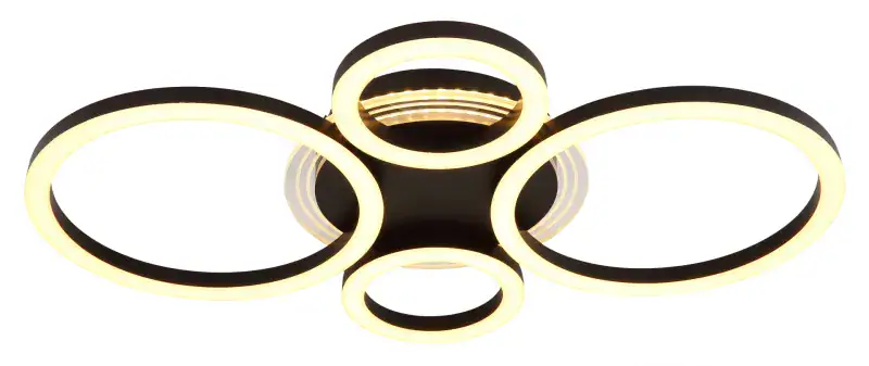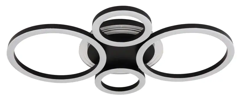 LORETTA plafonska lampa sa četiri pričvršćena prstena nudi moderno, pravougaono rešenje za osvetljenje. Crno metalno tijelo i akrilna nijansa u crnoj, mat i opalnoj boji stvaraju elegantnu atmosferu. Sa svjetlosnom snagom od 2100 lumena i CCT od 3000K do 6500K, možete mijenjati temperaturu svjetlosti. Funkcija zatamnjivanja i funkcija memorije vam omogućavaju da sačuvate i prilagodite željeno raspoloženje osvetljenja.