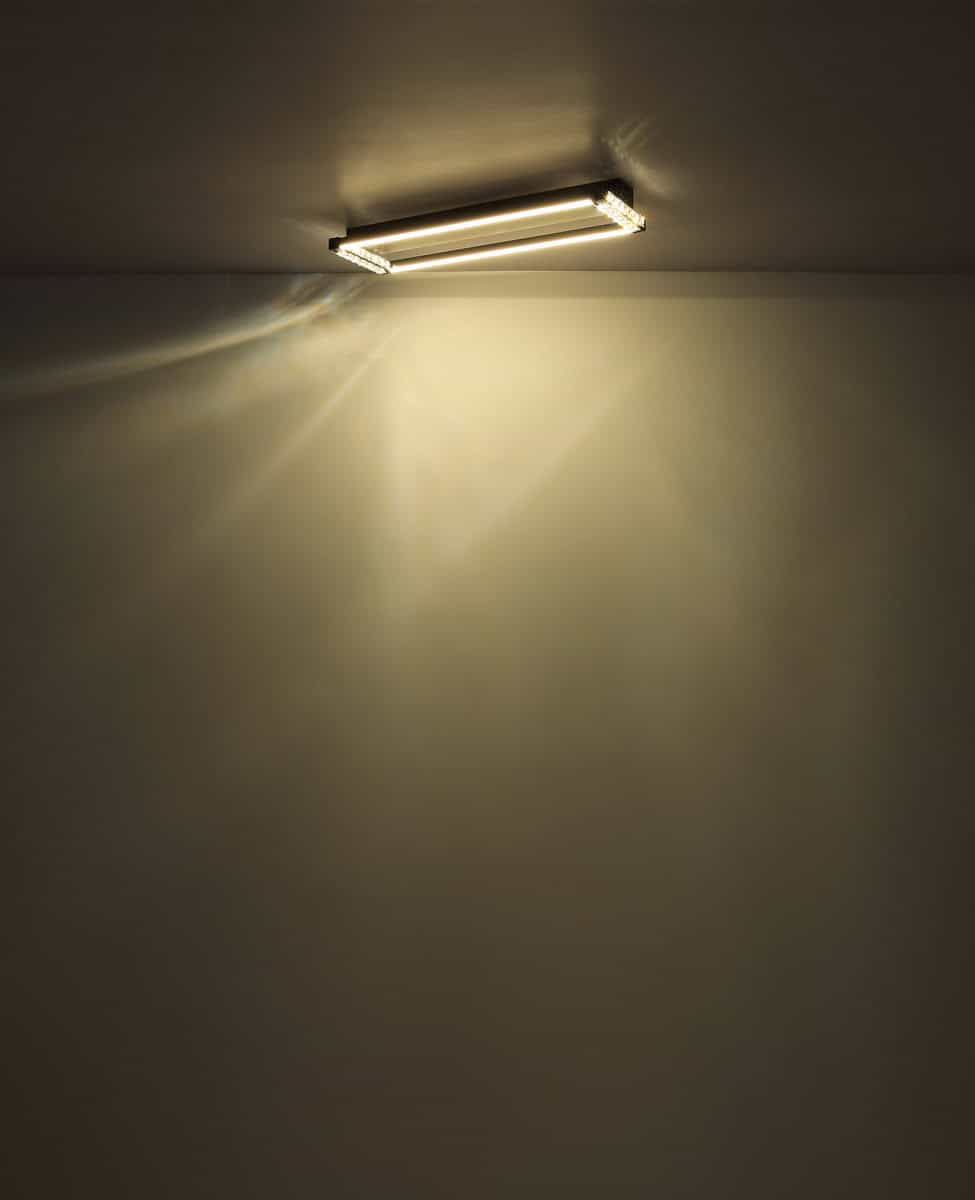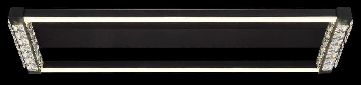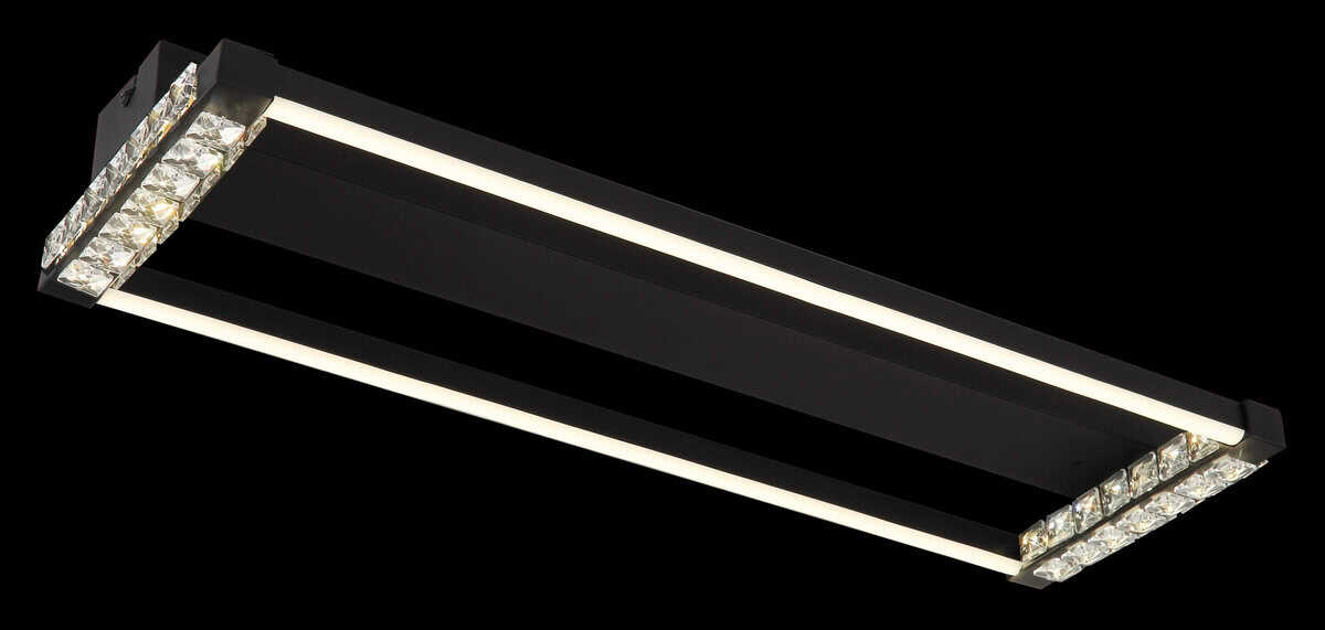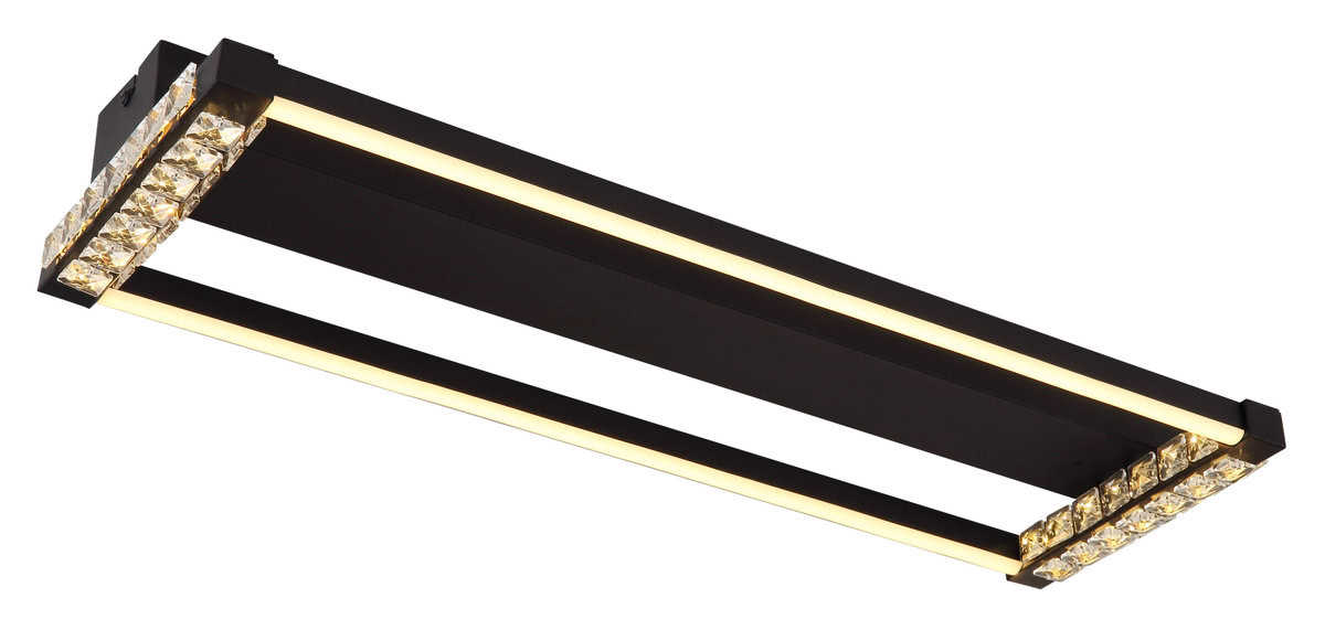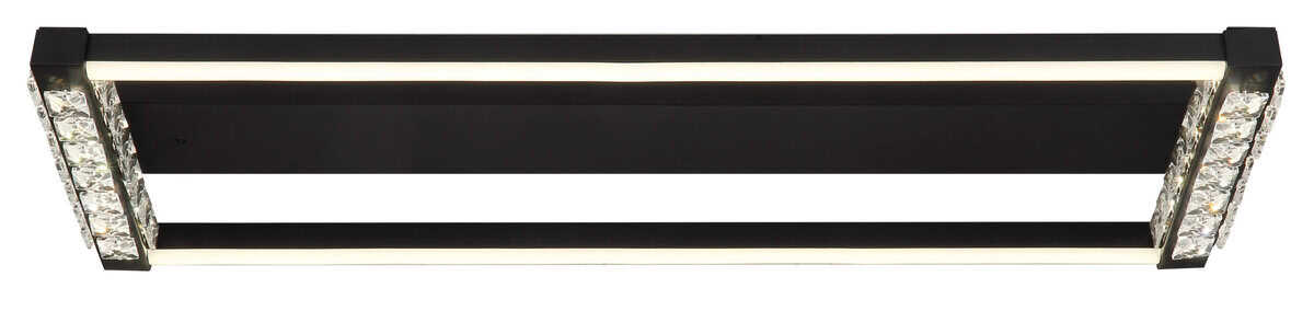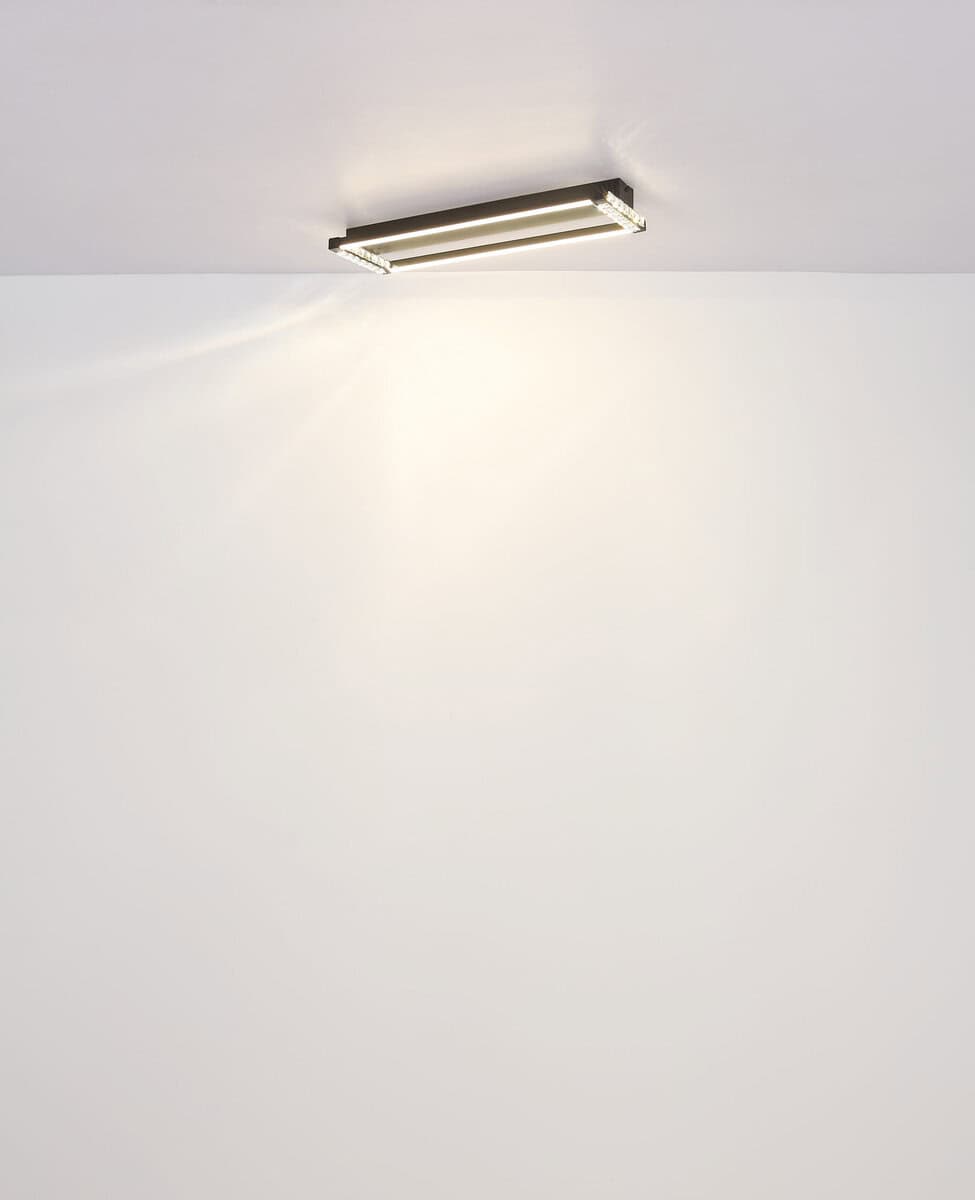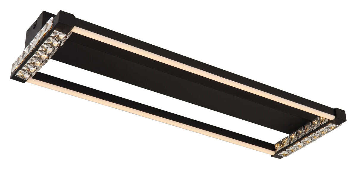 Pravokutna stropna svjetiljka u mat crnoj boji ističe se svojim elegantnim dizajnom s metalnim okvirom i prozirnim akrilnim kristalima. Sjenilo od mat aluminija i silikonskog opala osigurava harmoničnu distribuciju svjetlosti u prostoriji. Plafonsko svjetlo je opremljeno energetski učinkovitom LED diodom i može se prigušiti putem daljinskog upravljača ili više nivoa preko zidnog prekidača. Boje se mogu popraviti, a lampa ima praktičnu memorijsku funkciju kao i integrirano noćno svjetlo. Sa dužinom od 600 mm i širinom od 200 mm, plafonsko svetlo proizvodi svetlosni tok od 700 lumena pri snazi od 24 W. Temperatura boje može se podesiti od 2700K do 6000K kako bi se stvorila željena atmosfera. Moderan i moderan izvor svjetlosti za svaku prostoriju.