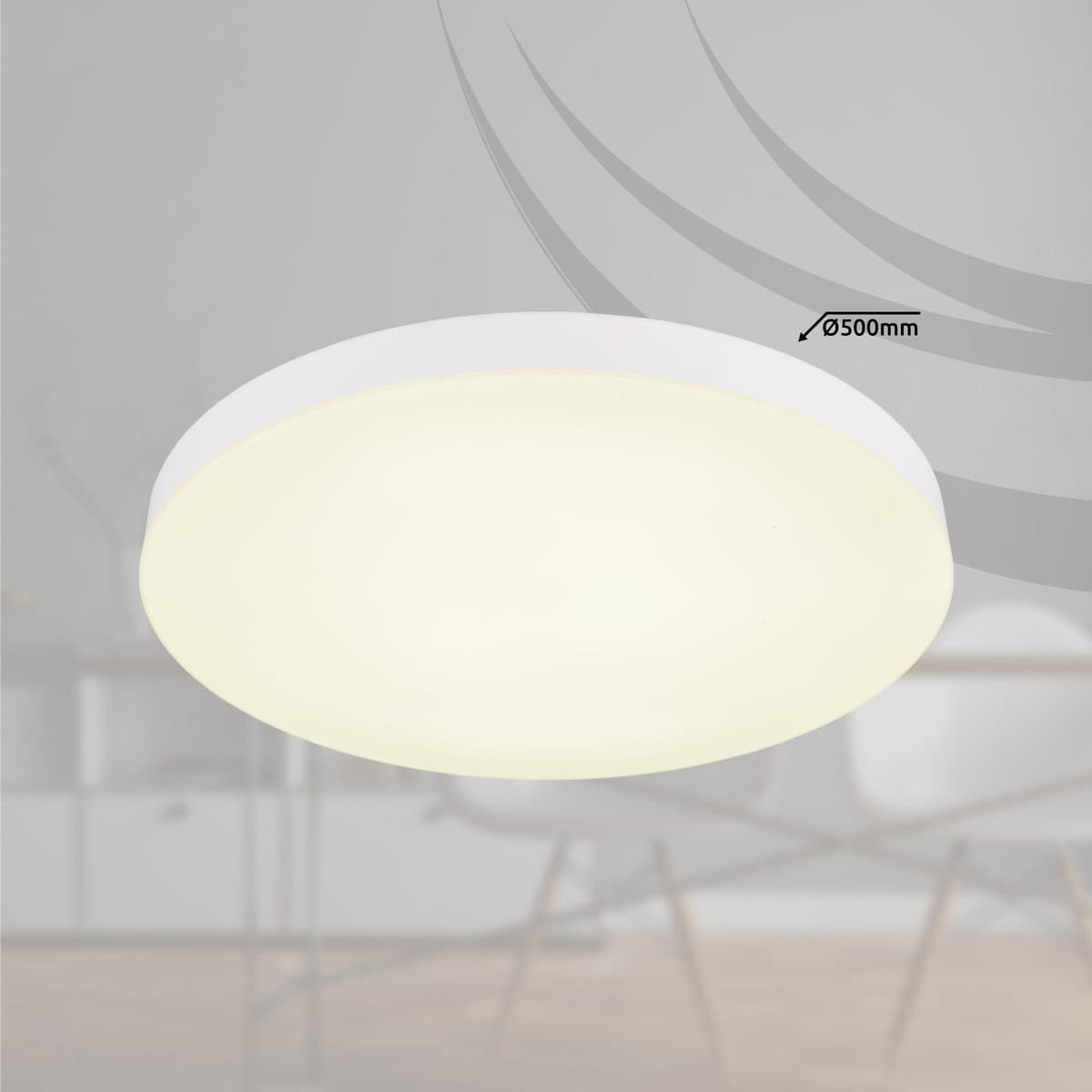 Plafonska lampa CEILING LAMP PLASTIC WHITE impresionira svojim modernim dizajnom i raznovrsnim opcijama osvetljenja. Okruglo i ravno kućište od mat bijele plastike daje ovoj lampi jednostavan i elegantan izgled. Opalno plastično sjenilo osigurava ravnomjernu raspodjelu svjetla i ugodno osvjetljenje. Tehnički vrhunac ove plafonske lampe je prekidač za 3 Kelvina koraka na zadnjoj strani, koji se može koristiti za podešavanje boje svetla od 3000K do 6500K. Sa prečnikom od 500 mm, snagom od 50 W i snagom od 4500 lumena, ova plafonska lampa obezbeđuje dovoljno osvetljenja za prostoriju. Mjenjač slavine omogućava fiksiranje boja i na taj način stvaranje željene atmosfere. Otkrijte mogućnosti individualnog i atmosferskog osvjetljenja uz ovu plafonsku lampu.