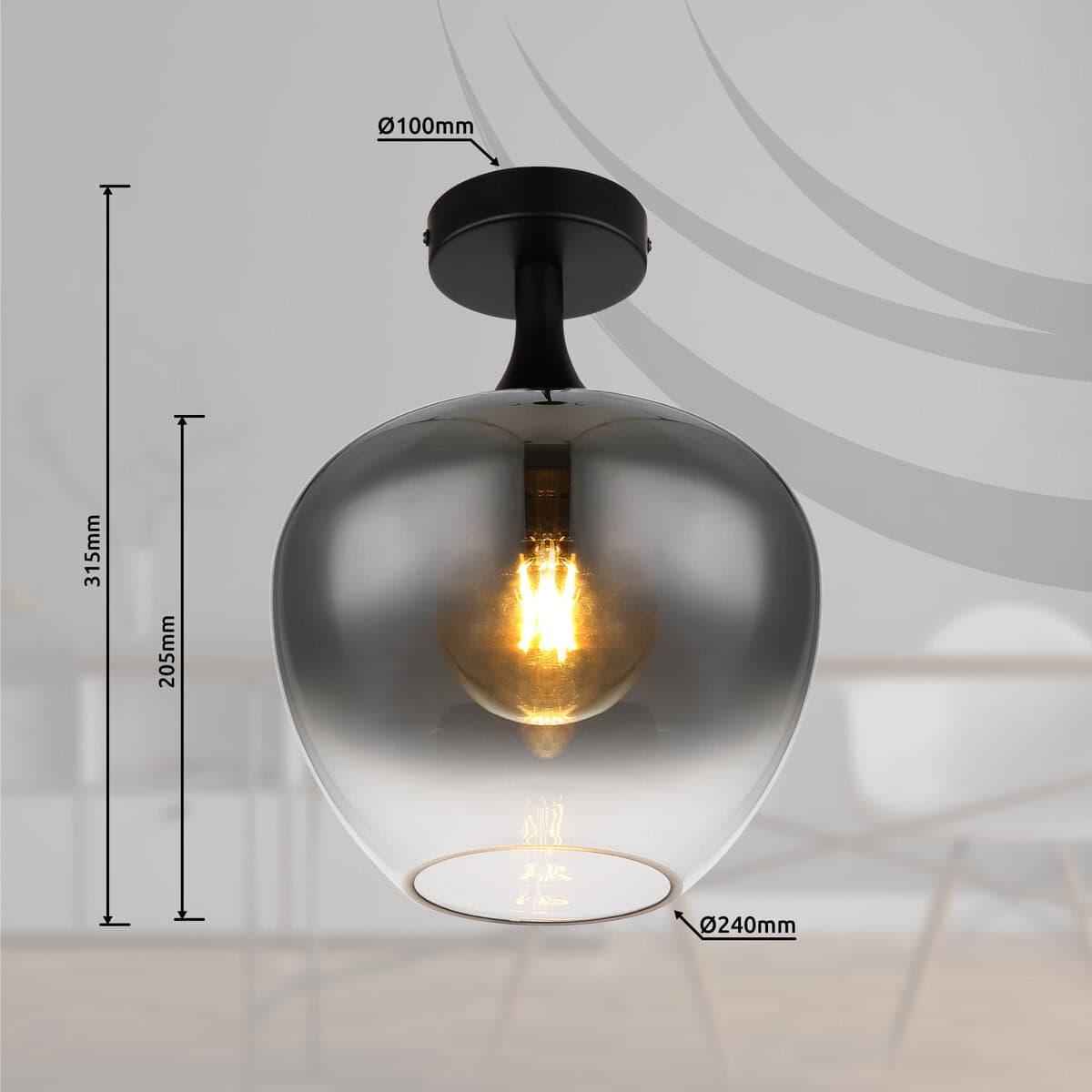 Ova moderna plafonska lampa inspiriše sjajnim dizajnom. Na okruglom crnom mat plafonu nalazi se E27 utičnica sa staklenim abažurom u obliku dima (Ø 24 cm). E27 utičnica vam omogućava da sami odredite boju i svjetlinu do maksimalne snage od 40 vati. Zbog dugovečnosti i uštede energije, preporučujemo LED sijalice.
