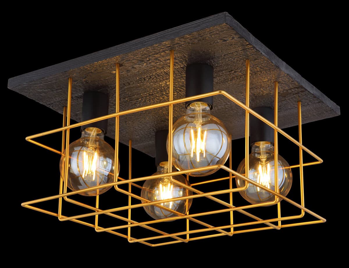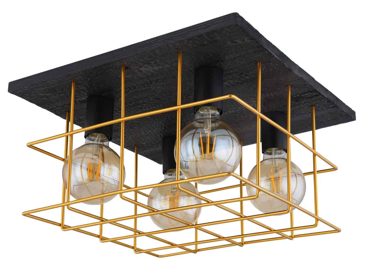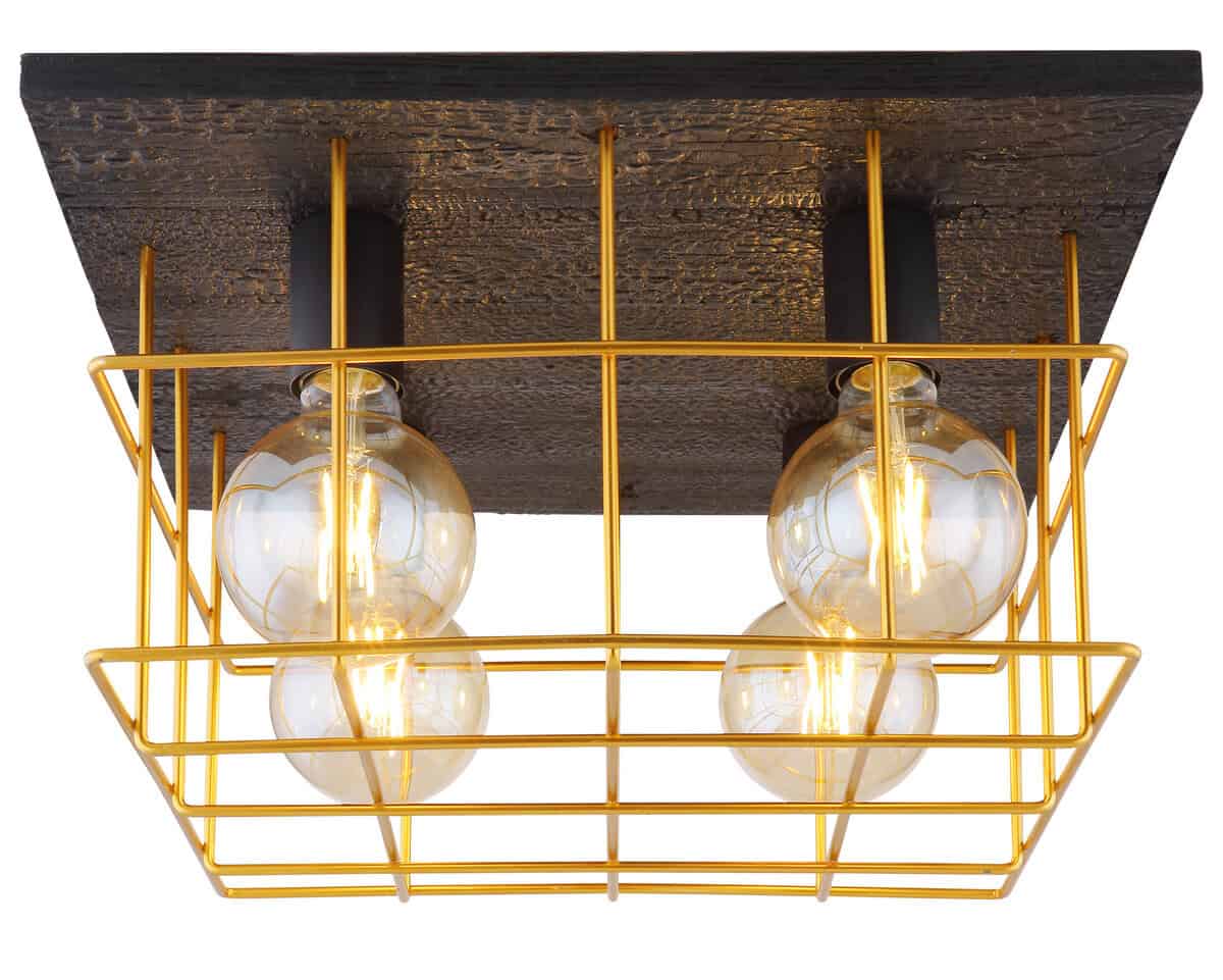 Ova kvadratna plafonska lampa iz serije Merril (40×40 cm) uvjerava svojim elegantnim dizajnom od drveta i metala zlatne boje. Plafonska lampa od 26 cm sastoji se od crne drvene ploče na koju je pričvršćena zlatna metalna rešetka. Ovo pokriva četiri E27 utičnice, koje se mogu opremiti odgovarajućim lampama po vašem izboru, dajući vam mogućnost da individualno odredite boju svjetla i svjetlinu. Uz više artikala iz iste serije, možete upotpuniti cjelokupnu sliku vašeg interijera.