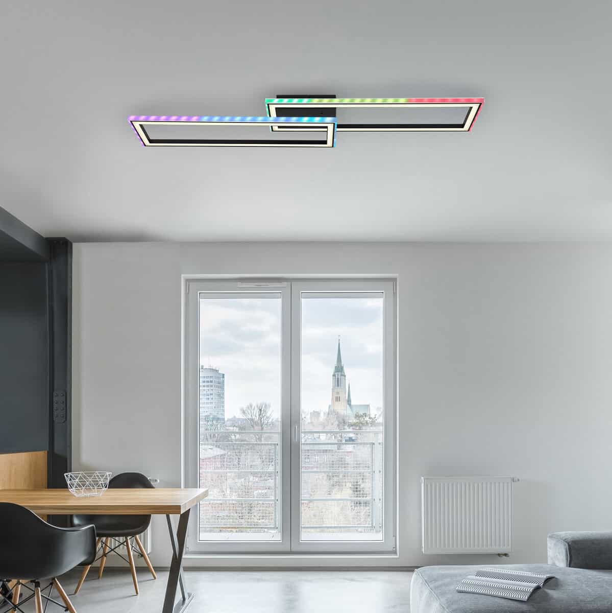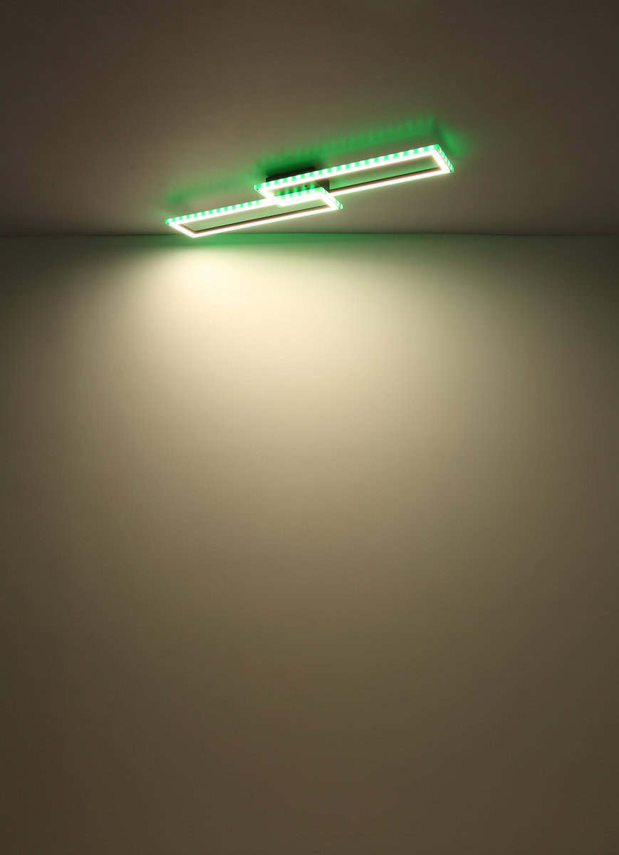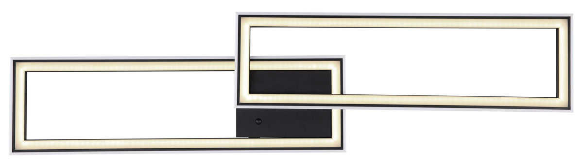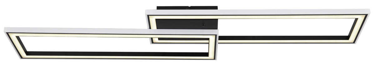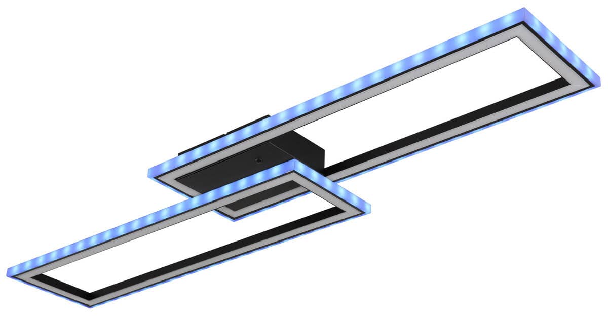 Izdužena plafonska lampa sa dva ofsetna pravougaonika je moderno i elegantno rešenje za osvetljenje svake prostorije. Tijelo plafonske lampe je izrađeno od mat crnog metala i daje joj otmjen izgled. Sjenilo je izrađeno od mat crnog aluminija i opal plastike. Plafonsko svjetlo dolazi s praktičnim daljinskim upravljačem i može se prigušiti, kao i podesiti u nekoliko koraka preko zidnog prekidača. Osim toga, mogu se fiksirati različite boje, a moguća je i promjena RGB boje kao i efekt duge. Lampa ima memorijsku funkciju i može se koristiti i kao noćno svjetlo. Sa dužinom od 945 mm i širinom od 240 mm, plafonsko svetlo nudi dovoljno svetla za prostoriju. Ima snagu od 30W i proizvodi svjetlosnu snagu od 1650 lumena. Boja svjetla je podesiva od 2700K do 6500K, tako da se osvjetljenje može prilagoditi. Ova izdužena plafonska lampa nije samo funkcionalna, već je i dekorativni element koji čini da prostorija blista u različitim svetlosnim varijantama.