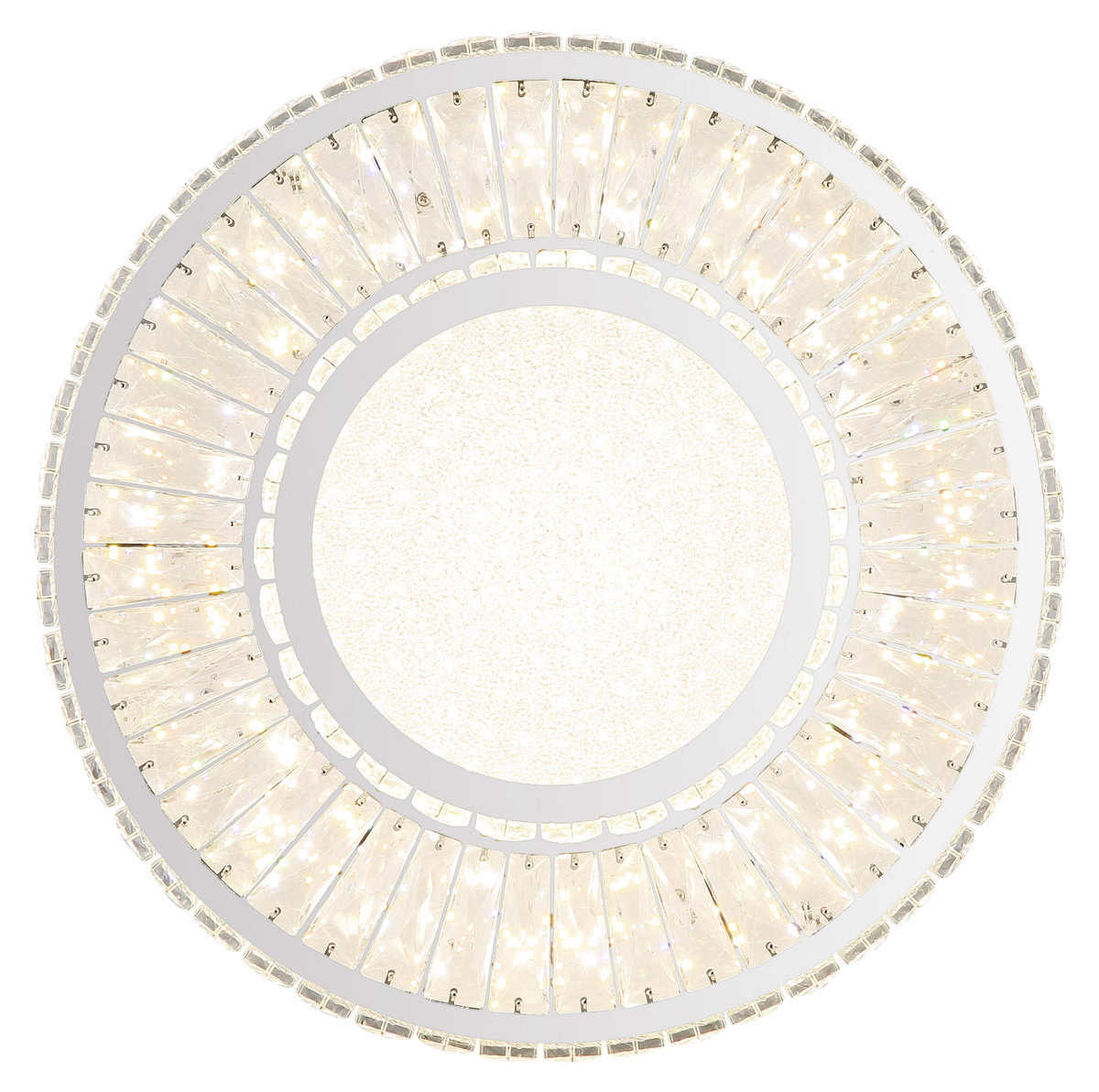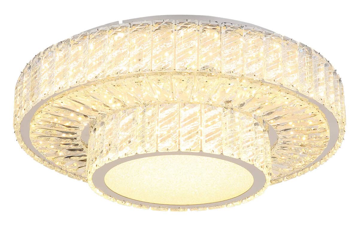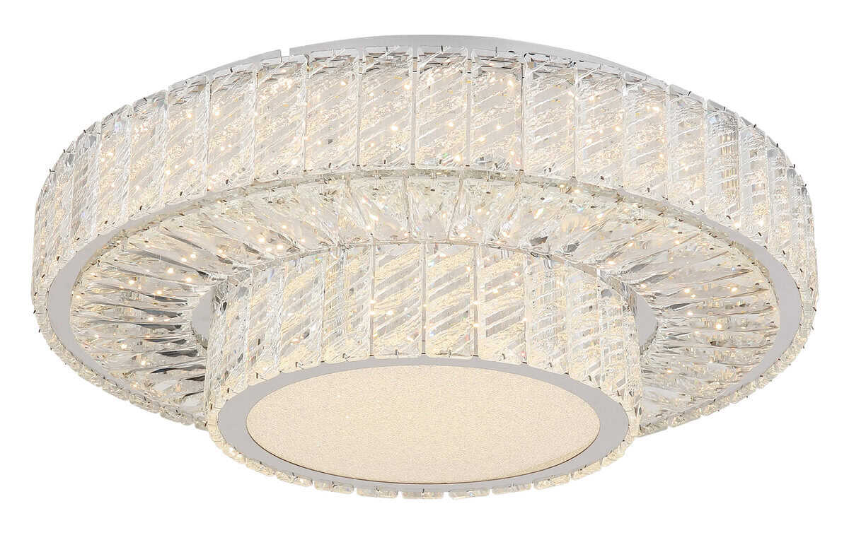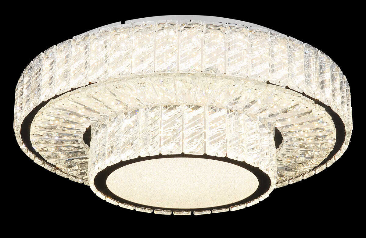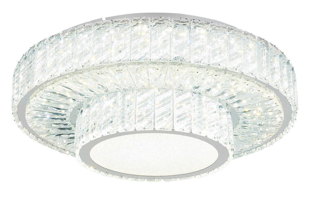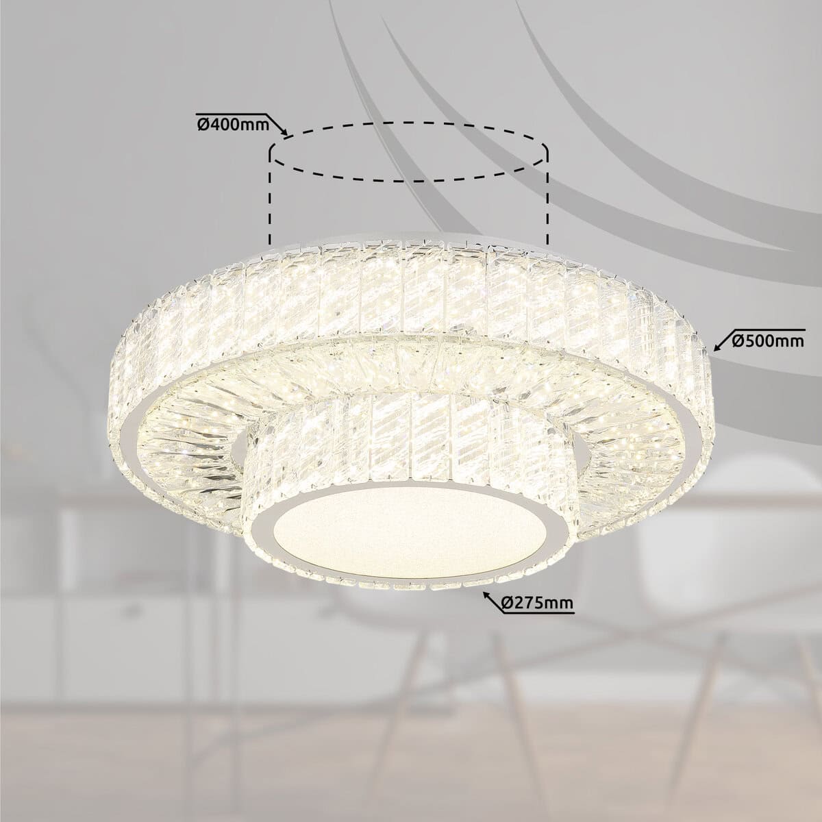 Doživite glamur i eleganciju MUCKY-ja! Naša plafonska lampa sa hromiranim metalom i prozirnim K5 kristalima stvara igru ​​svetlosti koja oduzima dah u vašoj sobi. Hromirani prsten daje dašak sofisticiranosti lampi. Uz funkciju zatamnjivanja, koja se može kontrolisati na nekoliko nivoa preko vašeg zidnog prekidača, imate potpunu kontrolu nad intenzitetom svjetlosti. Boje se mogu fiksirati po vašoj želji, a funkcija ugrađene memorije vam omogućava da zadržite željena podešavanja. Osim toga, plafonska lampa MUCKY nudi noćno svjetlo i dolazi s daljinskim upravljačem. Baterija (2x AAA) je već uključena. Sa prečnikom od 500 mm i visinom od 173 mm, plafonska lampa MUCKY postaje žarište zračenja u svakoj prostoriji. Svetiljka dolazi sa energetski efikasnom LED sijalicom koja nudi snagu od 50W, napon od 230V, svjetlosni tok od 672-5520lm (izvor) i svjetlosnu efikasnost 633-3965lm (izlaz), kao i podesivu temperaturu boje od 2700-6000K (CCT).