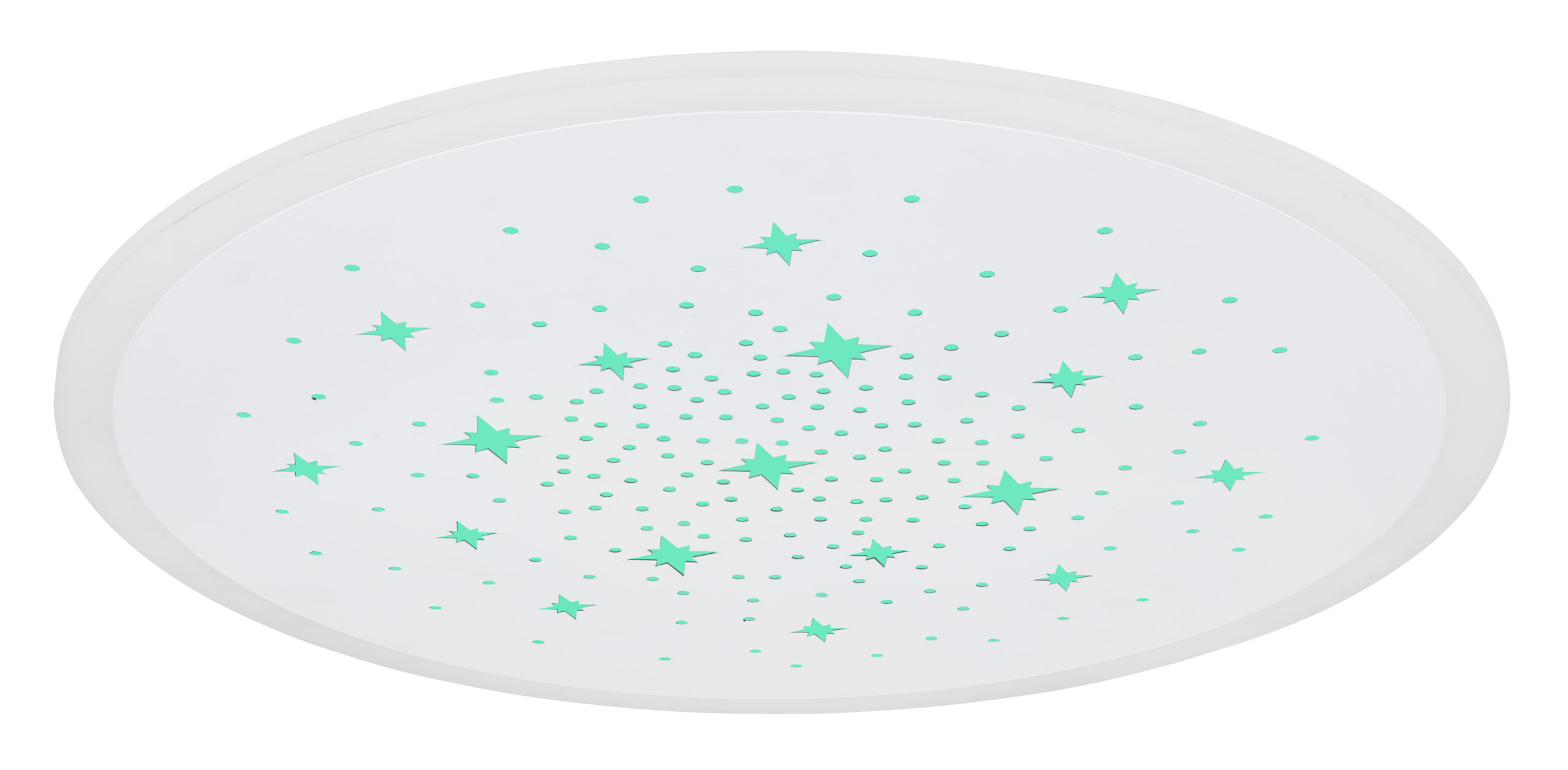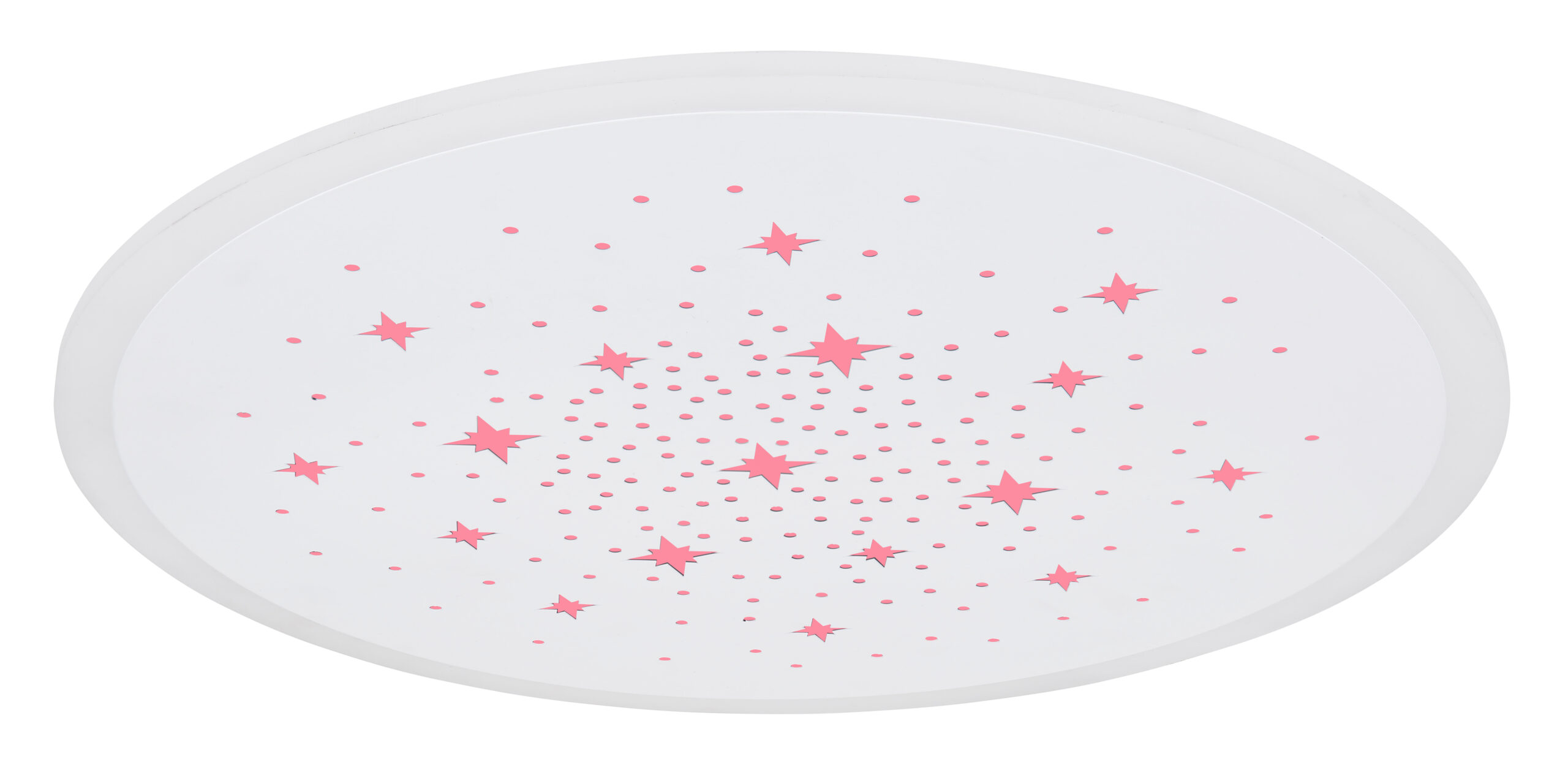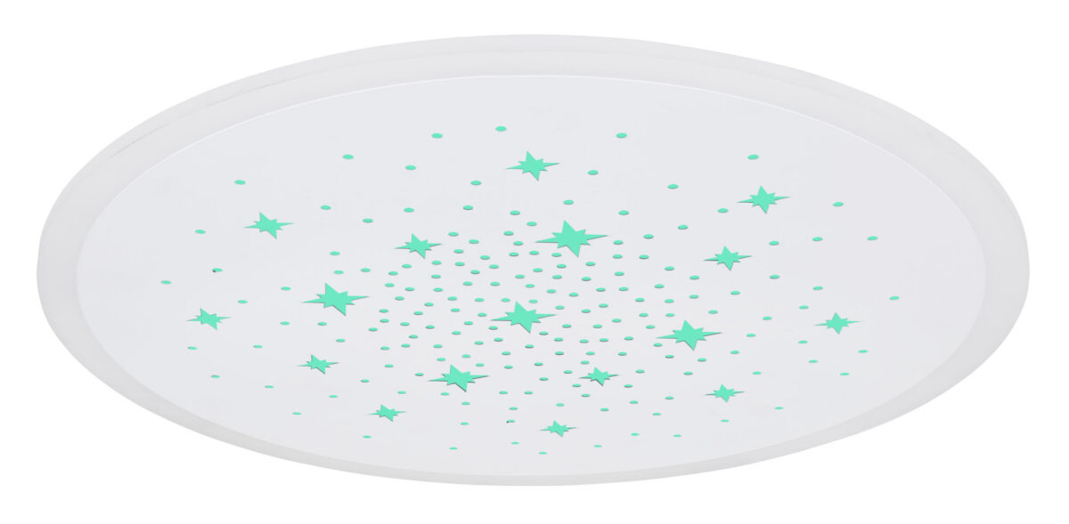 Ova okrugla plafonska lampa serije Murphy (ø 50 cm) odlična je za vaš enterijer. Sastoji se od plastičnog prstena koji zatvara okruglu, bijelu metalnu ploču, koja je opremljena zvjezdastim i okruglim udarcima. One mogu biti osvijetljene u RGB bojama. Sa uključenim LED sijalicama, plafonska lampa daje 2400 lumena jakog svetla. Osim toga, ne samo da ih možete zatamniti uz pomoć priloženog daljinskog upravljača, već i individualno podesiti boju svjetla u nekoliko nivoa između 2700 Kelvina (toplo bijelo) i 6500 Kelvina (hladno bijelo) te imaju funkciju noćnog svjetla. Sa ostalim modelima iste serije možete upotpuniti cjelokupnu sliku u svoja četiri zida.