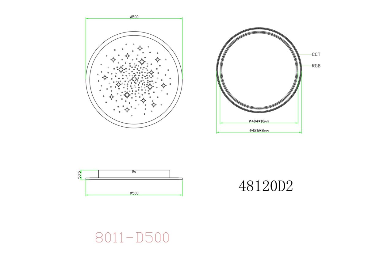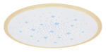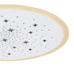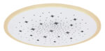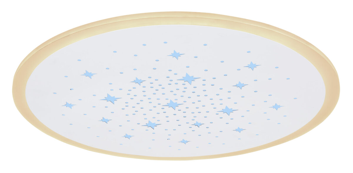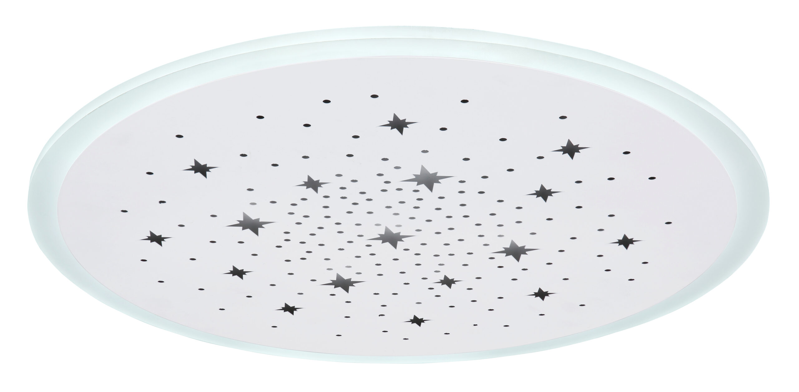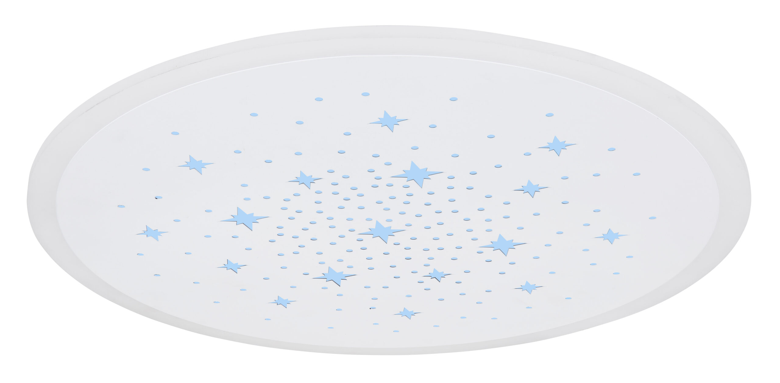 Ova okrugla plafonska lampa serije Murphy (ø 50 cm) odlična je za vaš enterijer. Sastoji se od plastičnog prstena koji zatvara okruglu, bijelu metalnu ploču, koja je opremljena zvjezdastim i okruglim udarcima. One mogu biti osvijetljene u RGB bojama. Sa uključenim LED sijalicama, plafonska lampa daje 2400 lumena jakog svetla. Osim toga, ne samo da ih možete zatamniti uz pomoć priloženog daljinskog upravljača, već i individualno podesiti boju svjetla u nekoliko nivoa između 2700 Kelvina (toplo bijelo) i 6500 Kelvina (hladno bijelo) te imaju funkciju noćnog svjetla. Sa ostalim modelima iste serije možete upotpuniti cjelokupnu sliku u svoja četiri zida.