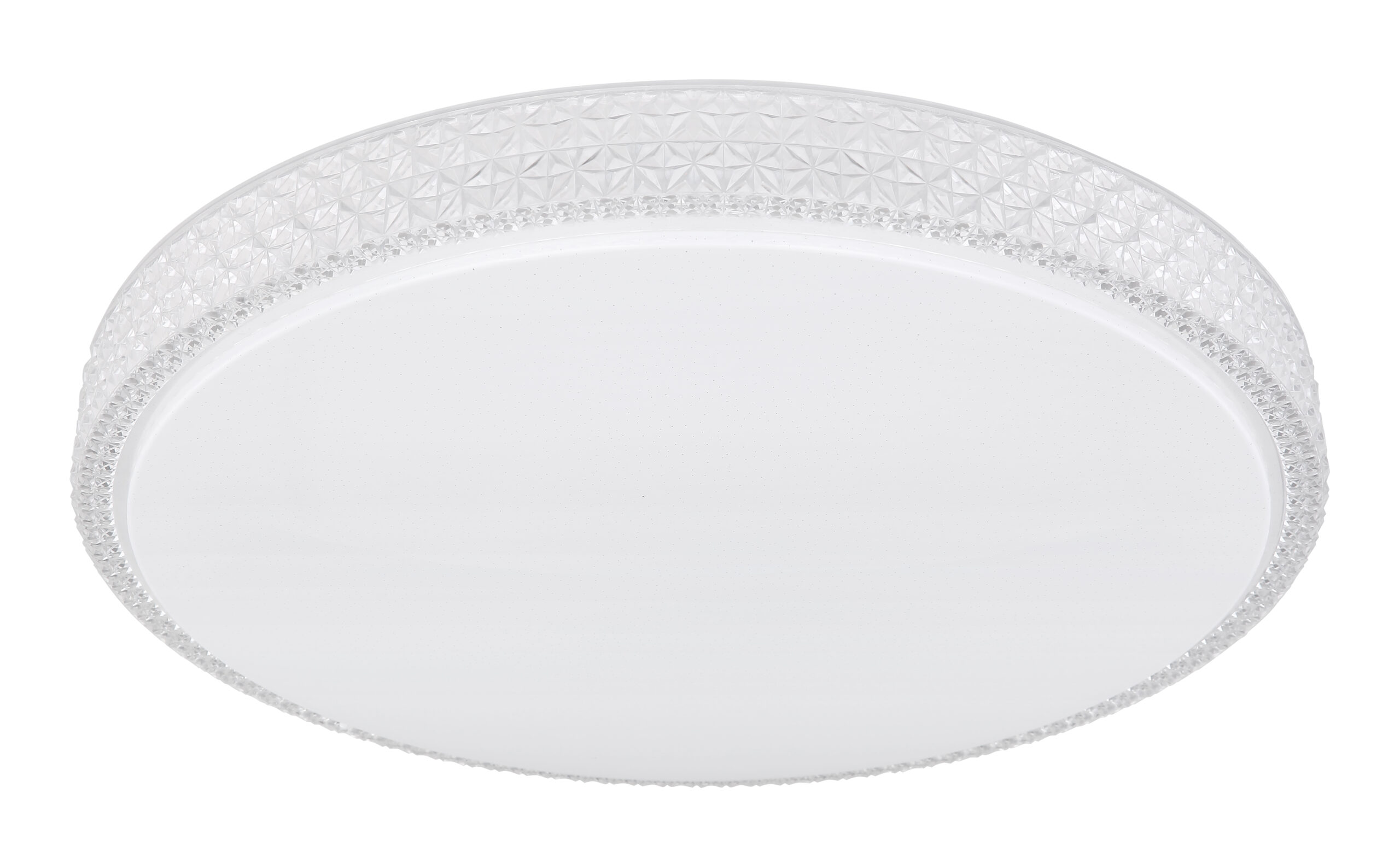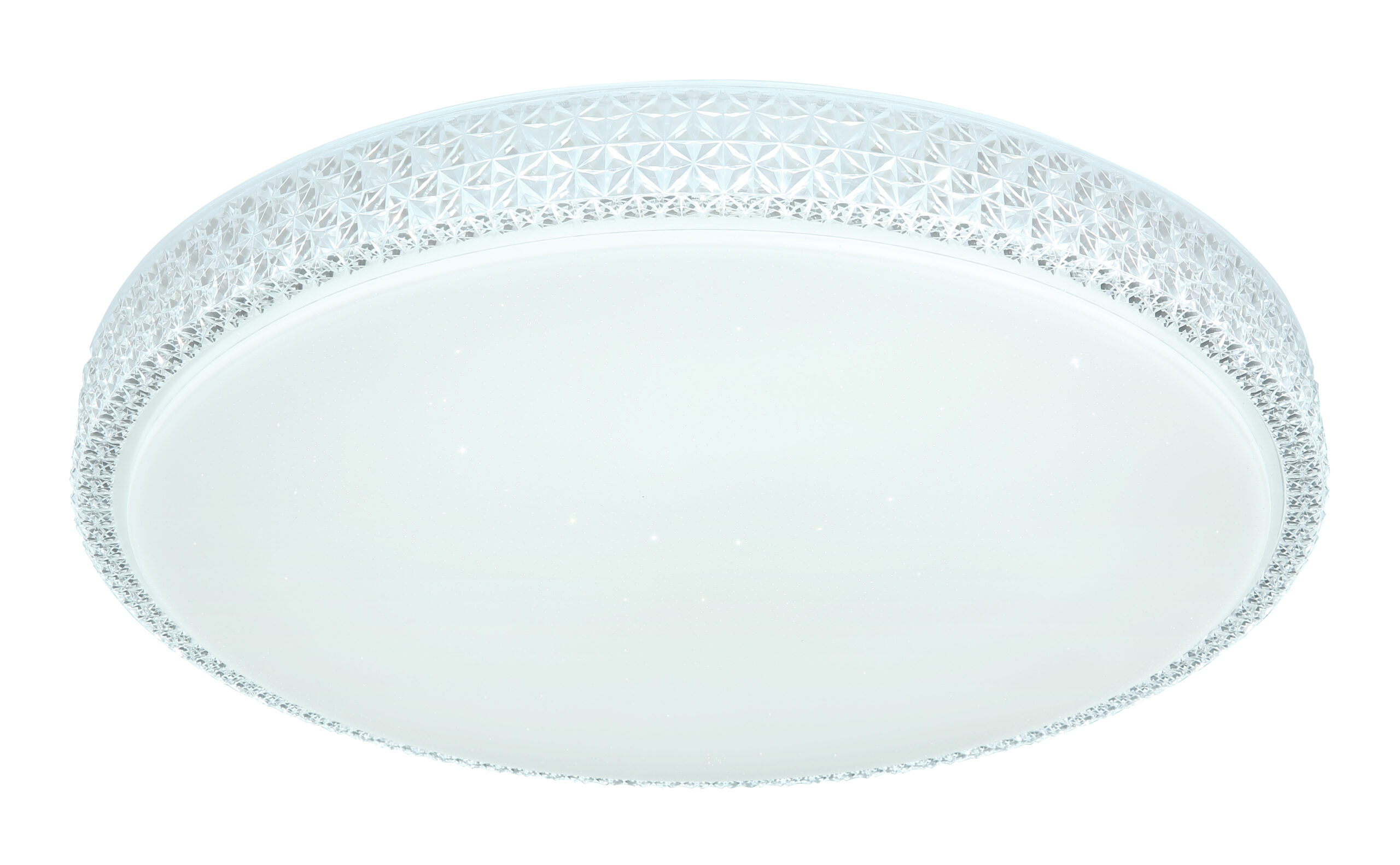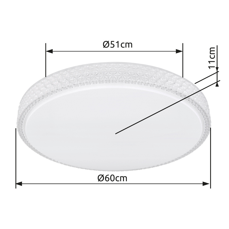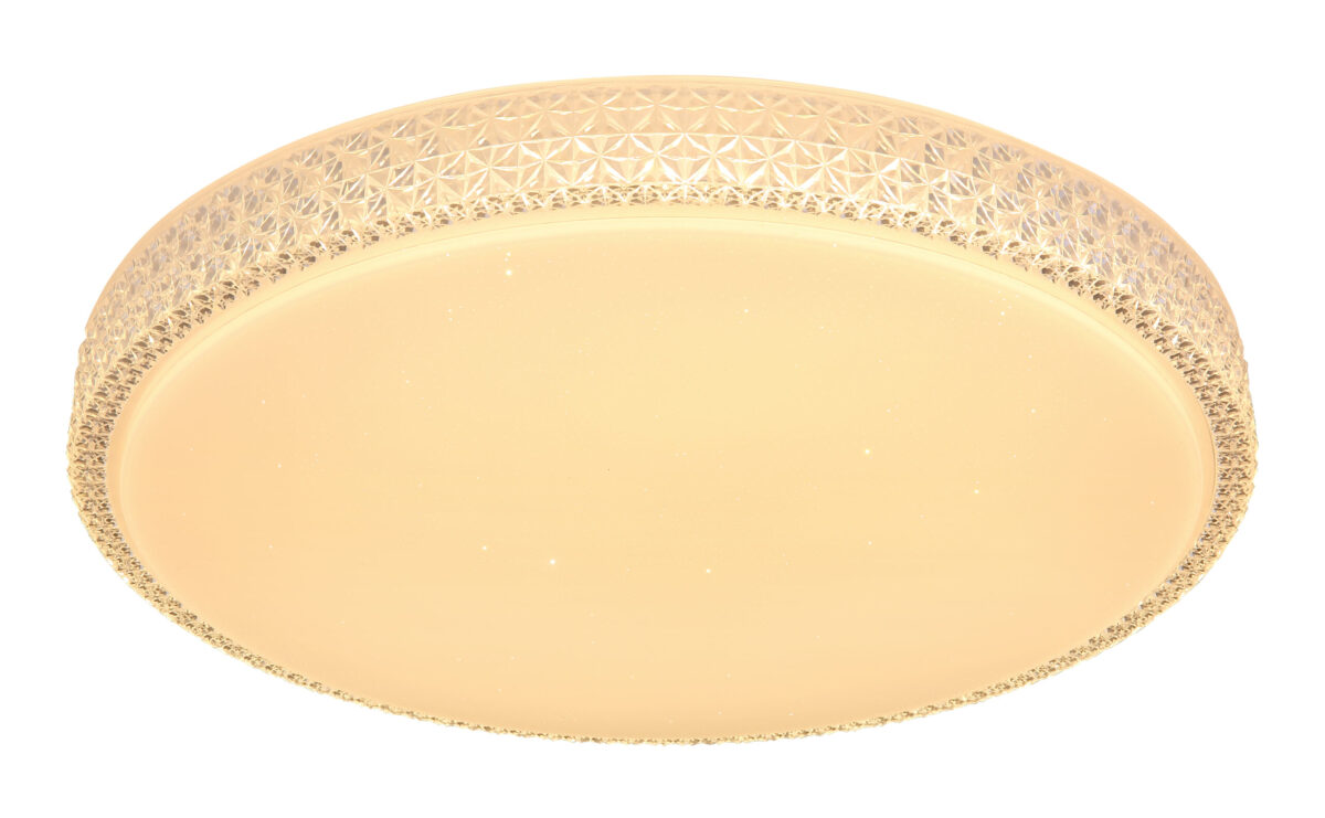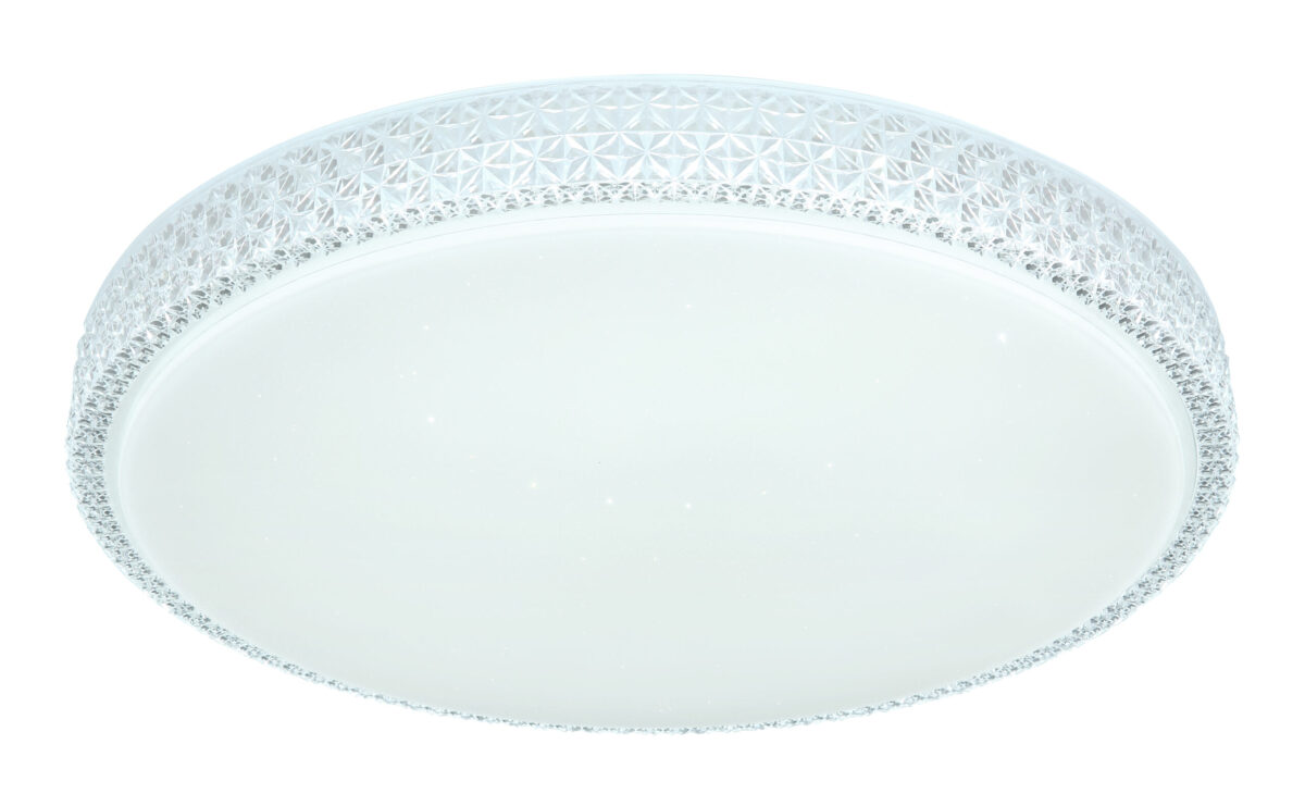Ova okrugla (Ø60cm) LED plafonska lampa ističe se svojom izradom i plemenitim dizajnom. Kombinacija bijelog metala, Sparekle dekora i prozirnih plastičnih kristala definitivno privlači poglede! Osim toga, boja svjetla može se mijenjati u tri faze pomoću zidnog prekidača po želji. (Topla bela 3000K – neutralna bela 4000K – hladna bela 6000K).
