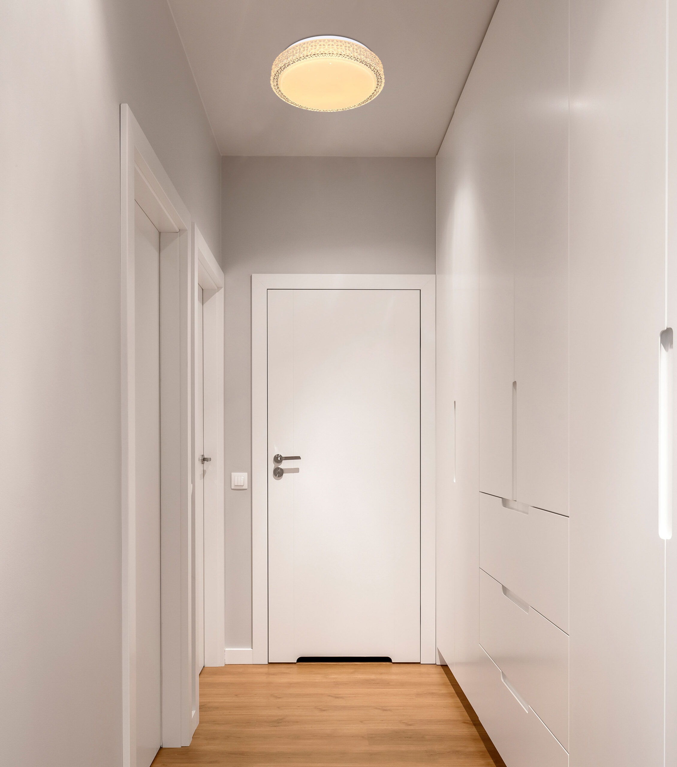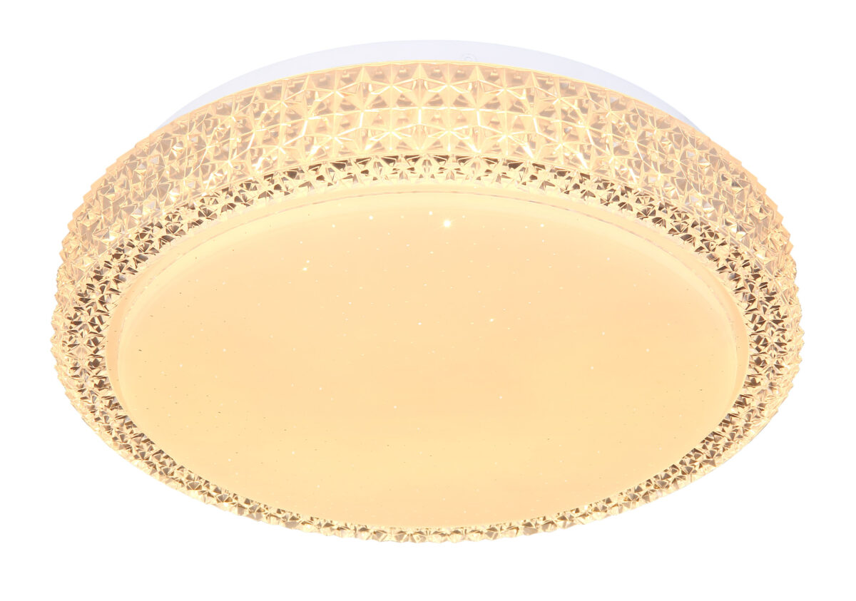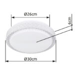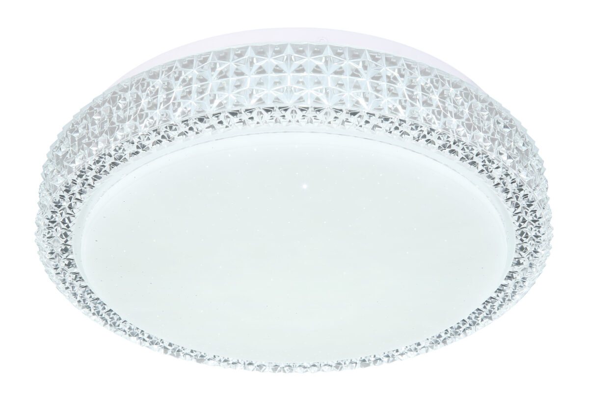 Ova okrugla (Ø30cm) LED plafonska lampa ističe se svojom izradom i plemenitim dizajnom. Kombinacija bijelog metala, Sparekle dekora i prozirnih plastičnih kristala definitivno privlači poglede! Osim toga, boja svjetla može se mijenjati u tri faze pomoću zidnog prekidača po želji. (Topla bela 3000K – neutralna bela 4000K – hladna bela 6000K).