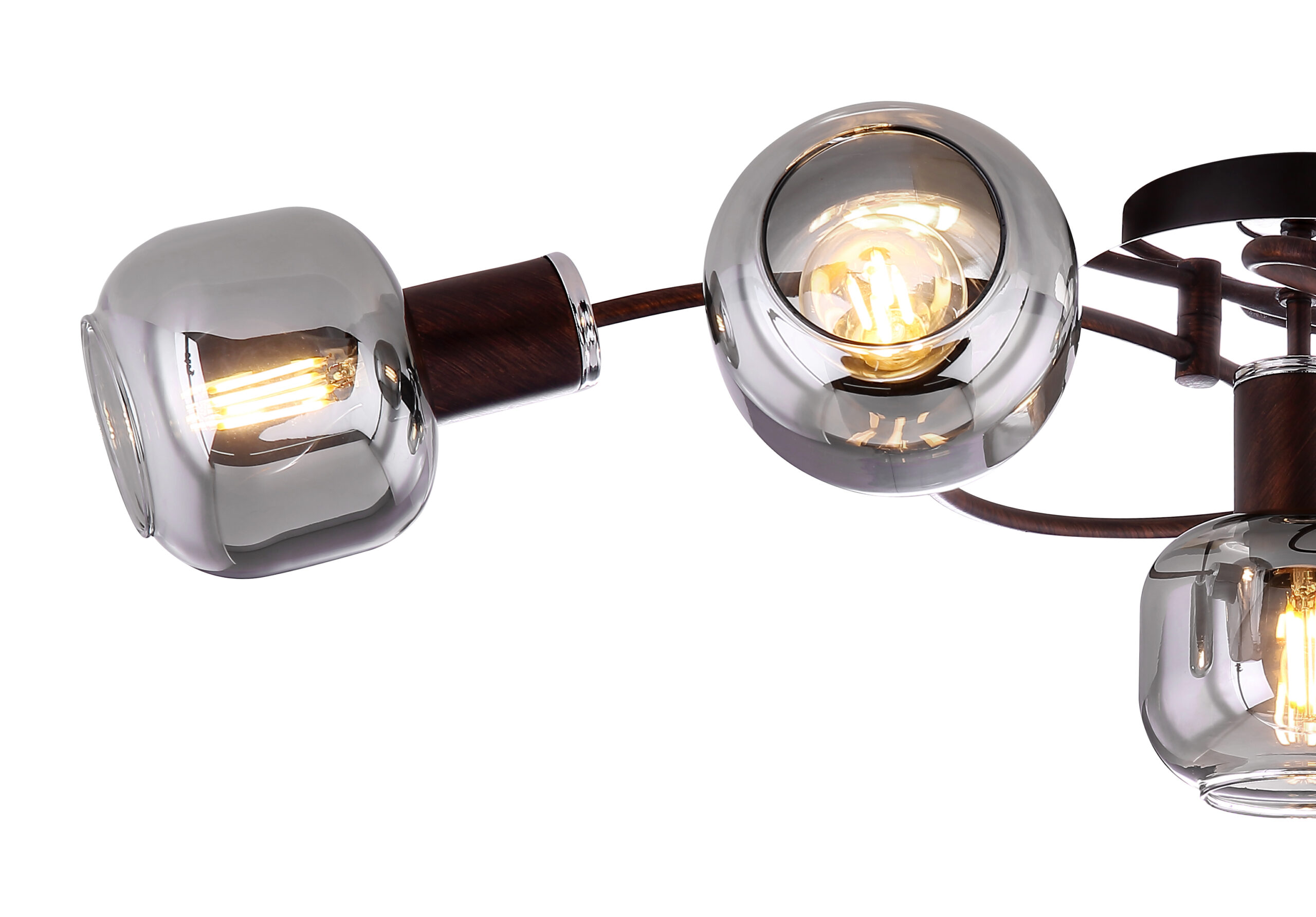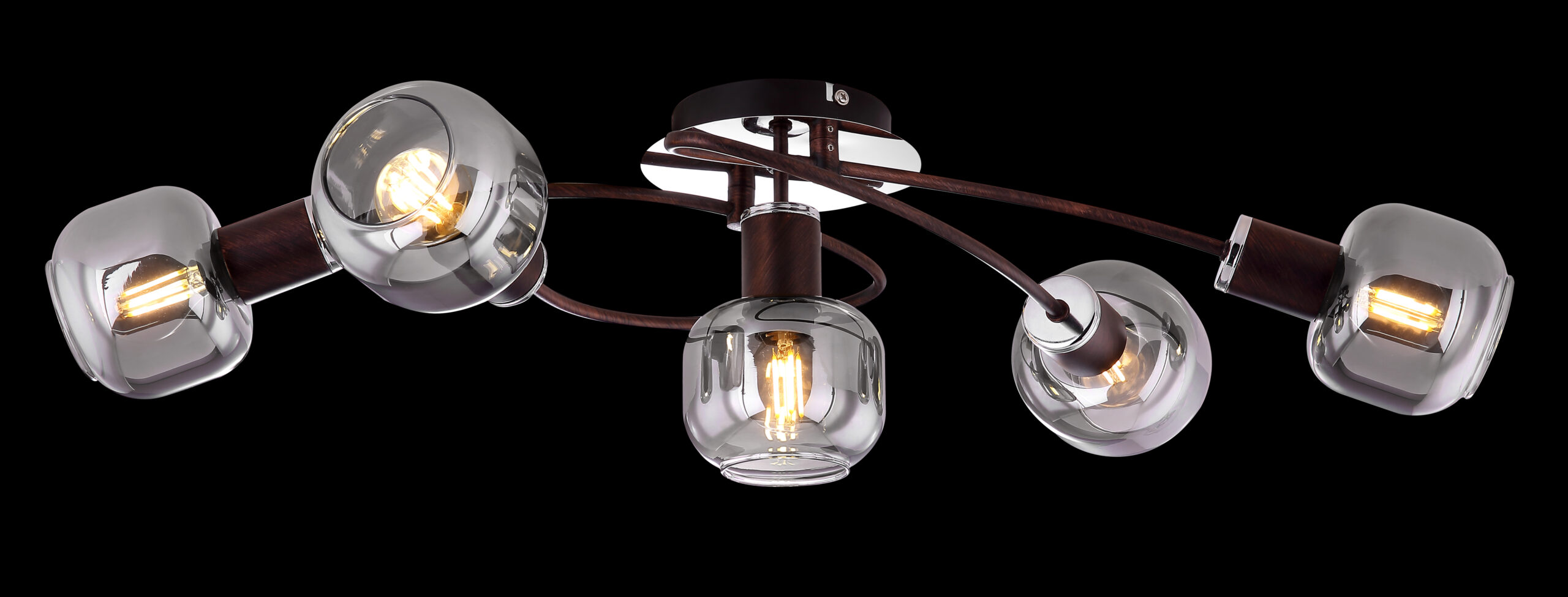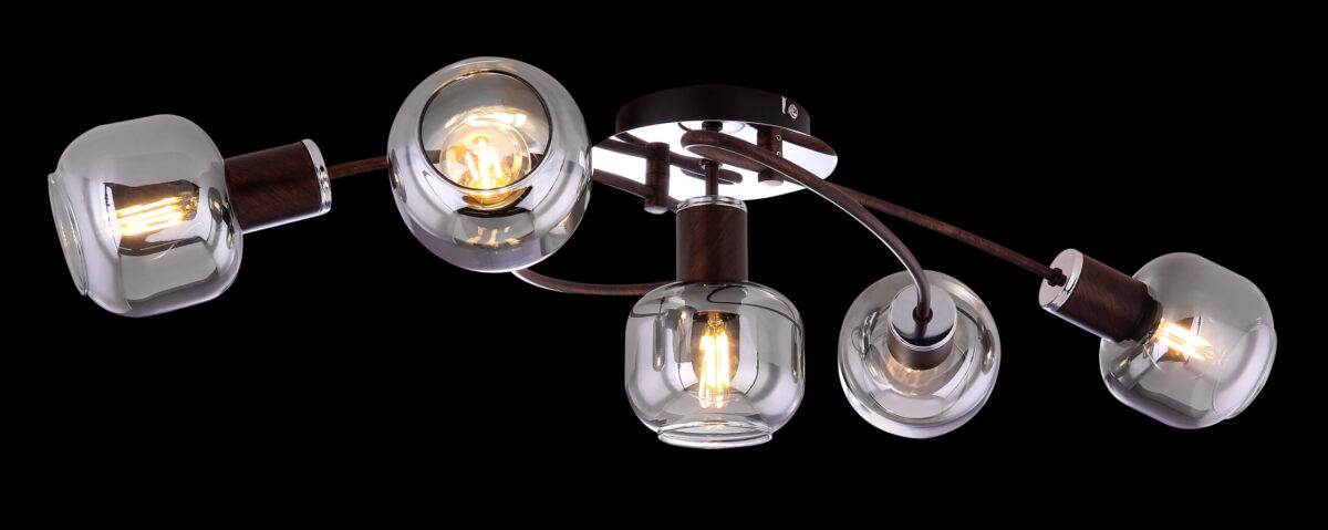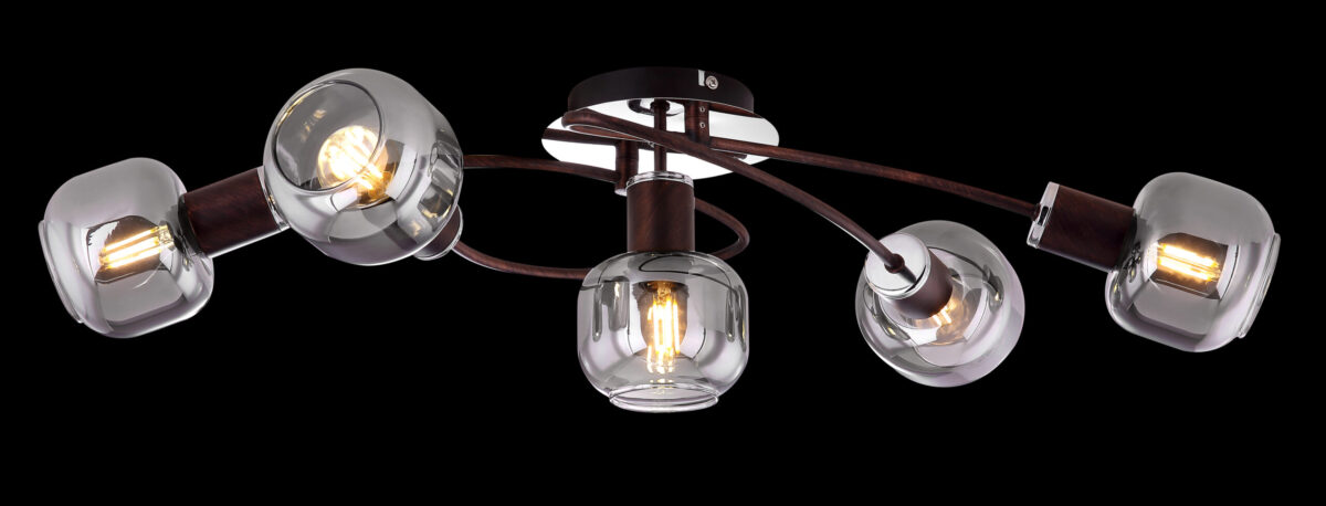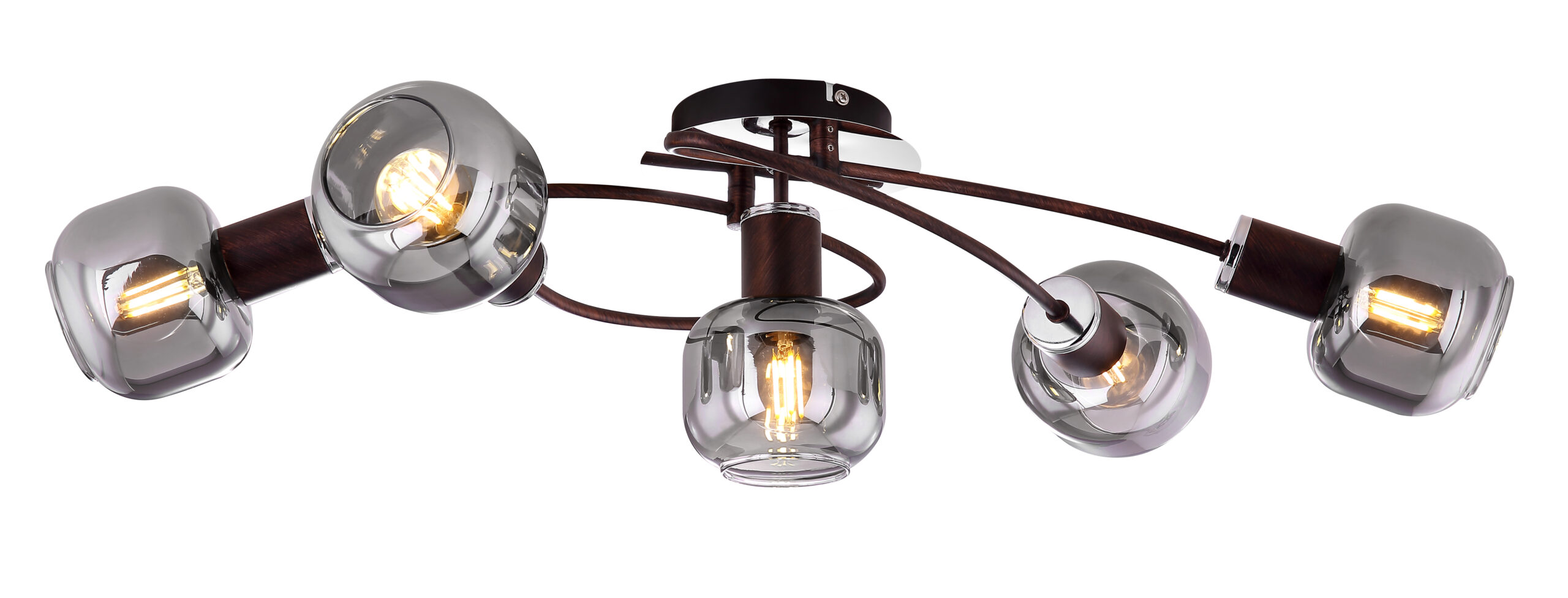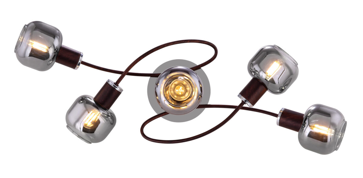 Ovaj reflektor ima dva lijepo zakrivljena kraka na koje su pričvršćene dvije tačke. Peta tačka se nalazi u sredini lampe. Plafonski luster impresionira svojom jednostavnom elegancijom. Optička kombinacija metala bronzane boje sa zadimljenim staklom unosi domaći ambijent u vaše dnevne sobe. Pet tačaka na reflektoru dužine 63 cm i širine 38 cm imaju E14 utičnice, koje vam omogućavaju da sami odredite izvor svetlosti, a samim tim i intenzitet svetlosti i boju svetlosti (maks. 40W). Zbog dugotrajnosti i uštede energije preporučujemo LED lampe.