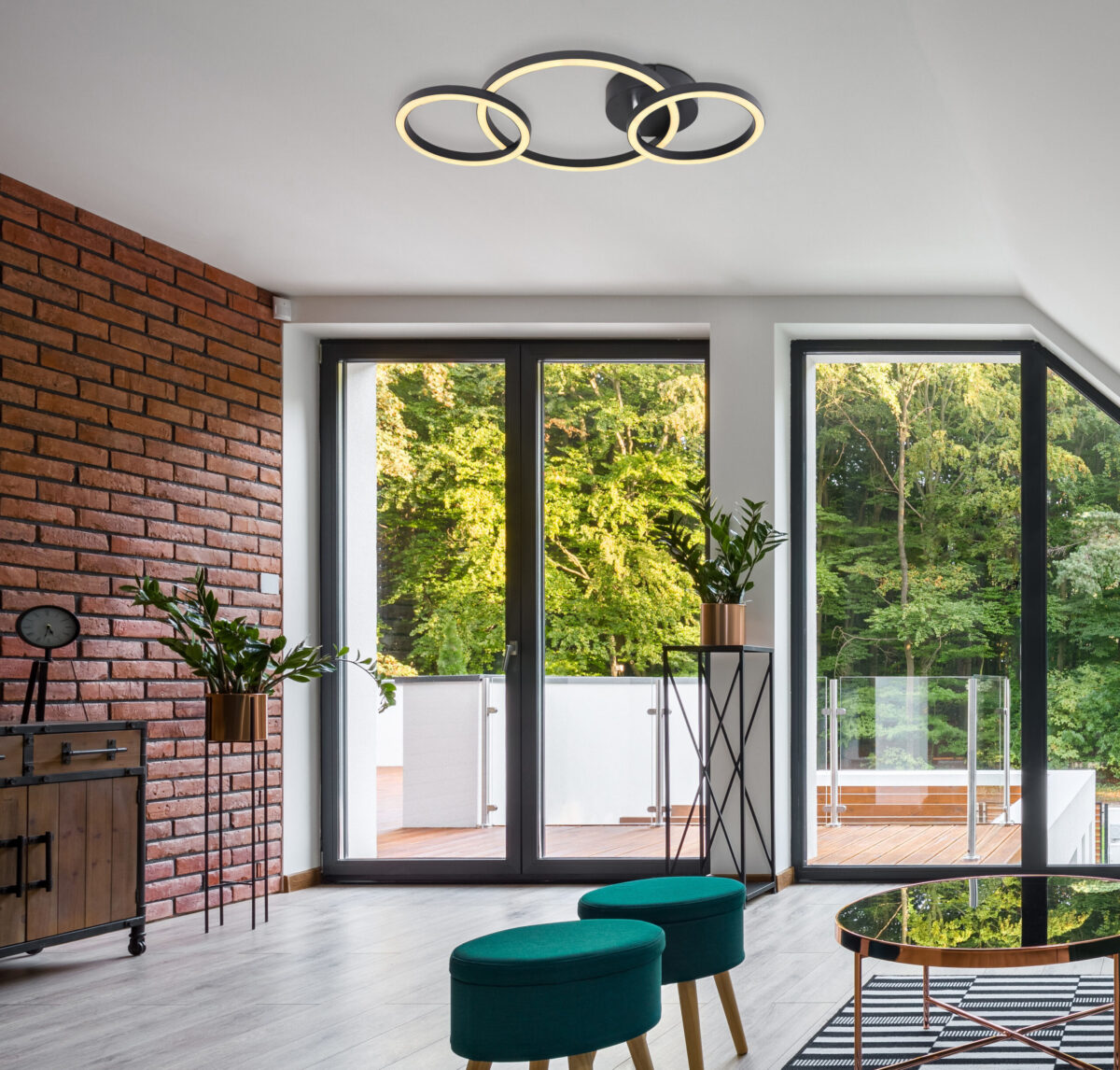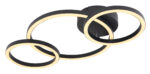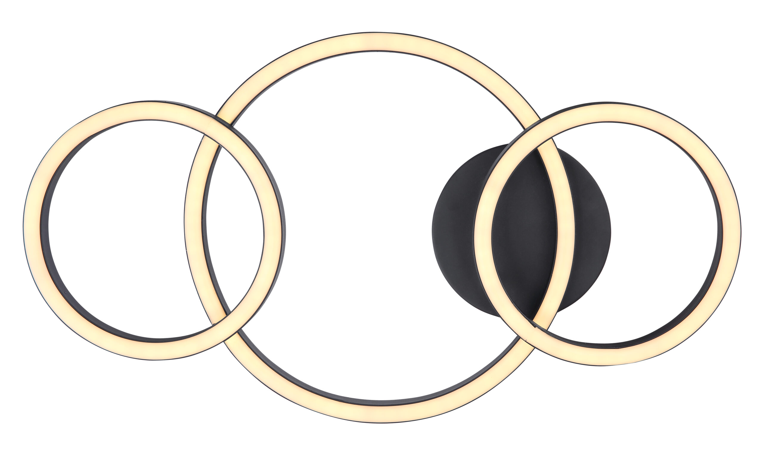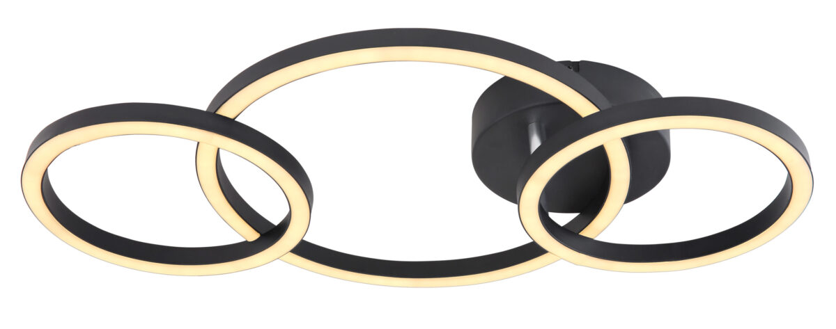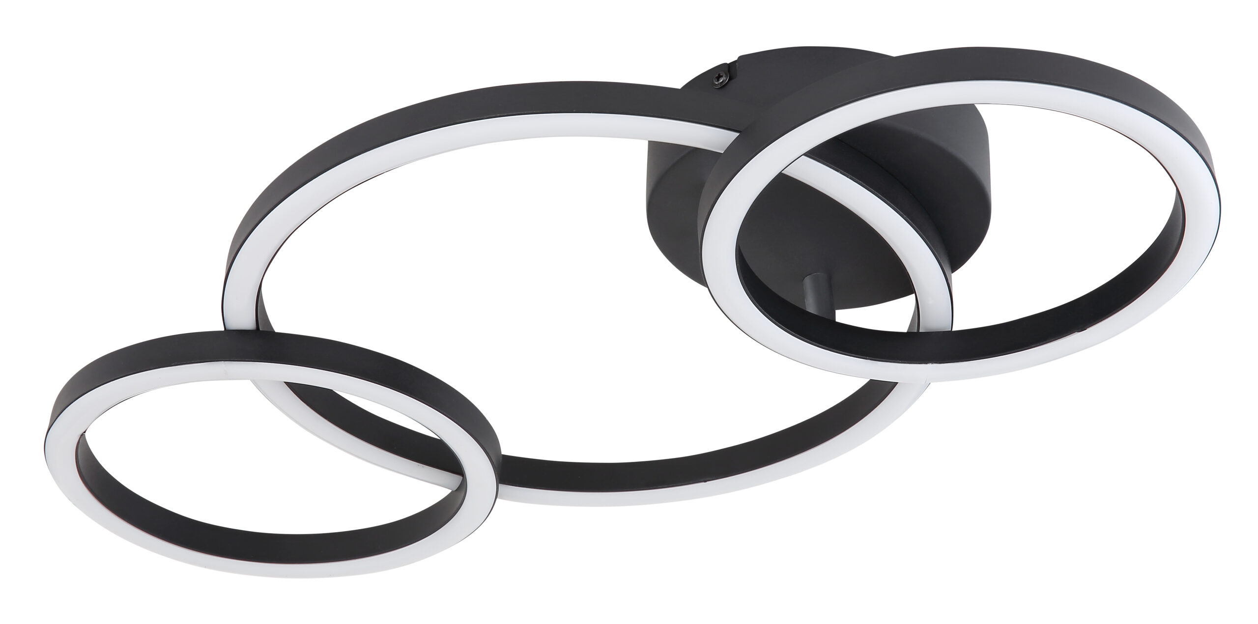 Ova plafonska lampa iz Reggy serije (54,5×30 cm) impresionira svojim elegantnim dizajnom od crnog metala i opal akrila. Sastoji se od jednog većeg i dva manja metalna prstena, koji se lijepo preklapaju i opremljeni su opalnim akrilom. Ovo pokriva uključene LED sijalice, sa kojima plafonsko svetlo emituje 760 lumena jakog svetla sa svetlosnom bojom od 3000 Kelvina (toplo belo). Uz ostale modele iz iste serije možete upotpuniti cjelokupnu sliku u svom interijeru i stvoriti elegantan ambijent.