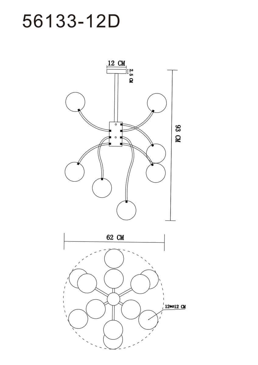 RIHA plafonska lampa se predstavlja u okruglom obliku koji stvara elegantan i minimalistički izgled. Posebna atrakcija ove lampe su 12 zakrivljenih krakova, od kojih svaki nosi staklenu kuglu. Staklene kugle su dimljene boje i daju lampi jedinstven dizajn. Telo lampe je izrađeno od crno lakiranog metala, koji ima mat površinu. Dimenzije RIHA plafonske lampe su ø 700 mm, što znači da se može uklopiti i u male prostorije. Svjetiljka ima efektivnu svjetlosnu snagu od 130 lumena pri temperaturi boje od 3000 K. Ova kombinacija dizajna i kvaliteta svjetla čini plafonsko svjetlo RIHA odličnim dodatkom za uređenje interijera