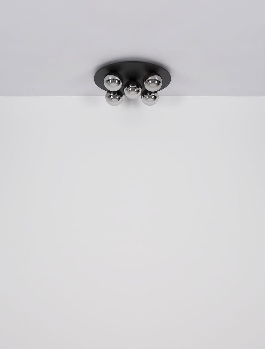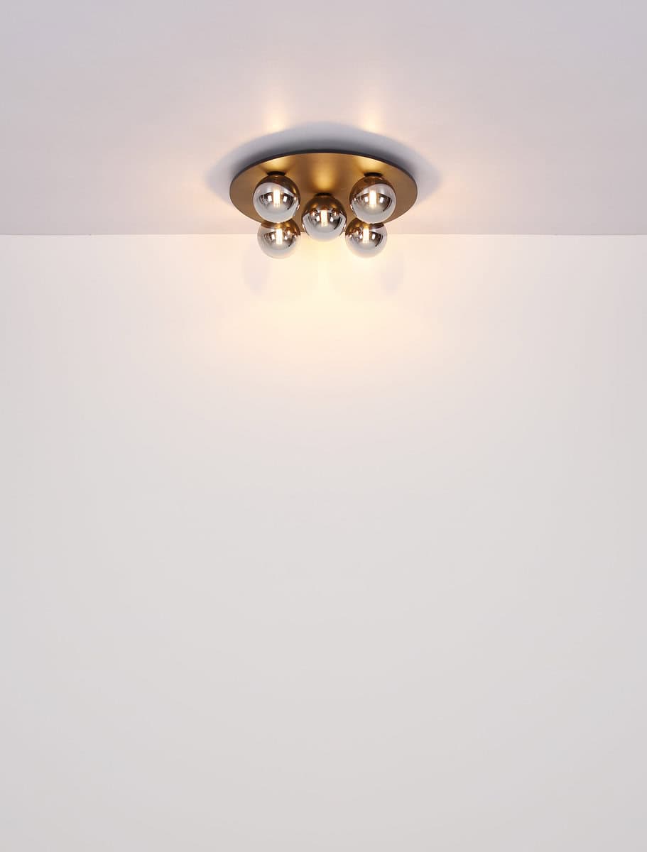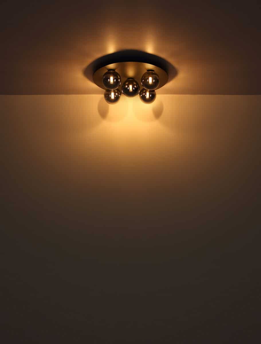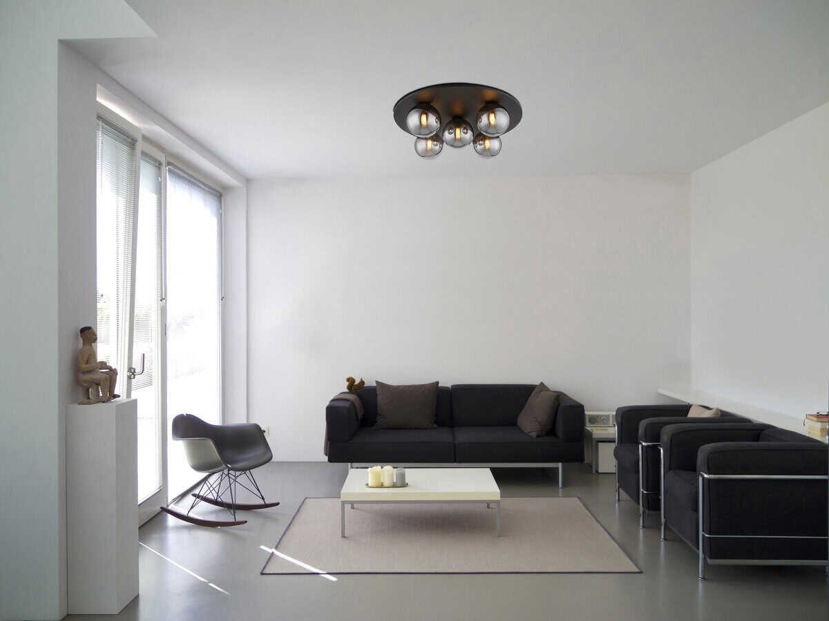 RIHA plafonska lampa je moderan akcenat u svakoj prostoriji. Njegov okrugli dizajn definiran je sa 5 staklenih sfera u boji dima koje podržava crno lakirano metalno tijelo. Mat površina tijela osigurava elegantan izgled. Lampa je kompaktne veličine od ø 500 mm, što je čini pogodnom čak i za male prostore. Sa efektivnom svjetlosnom snagom od 130 lumena pri temperaturi boje od 3000 K, RIHA plafonsko svjetlo stvara ugodno osvjetljenje. Sa svojim minimalističkim dizajnom i elegantnim sjenilom od staklenih kuglica, RIHA plafonska lampa postaje moderan dodatak za svaki dizajn sobe.