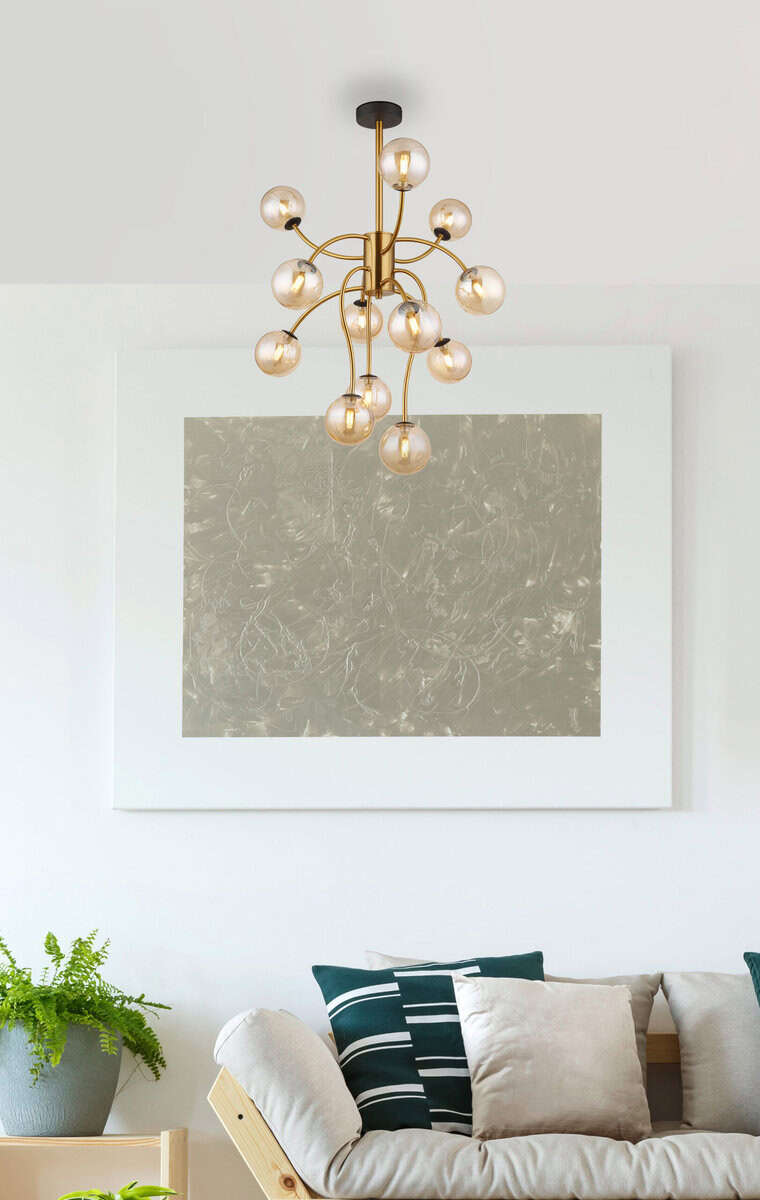 Plafonska lampa RIHA sa svojim elegantnim, okruglim dizajnom i 12 zakrivljenih krakova donosi elegantnu rasvjetu u svaku prostoriju. Kućište od mat metala zlatne boje i mat metala boje mesinga kombinuje luksuz i modernost. Staklene kuglice od ćilibara stvaraju toplu, privlačnu atmosferu. Sa svjetlosnom snagom od 290 lumena i 3000K LED tehnologijom, svjetiljka pruža ugodno svjetlo. Sofisticirani dizajn dodaje elegantan štih vašem prostoru, dok čvrsta konstrukcija garantuje dug životni vijek. Idealno za stilizovane dnevne sobe ili trpezarije.