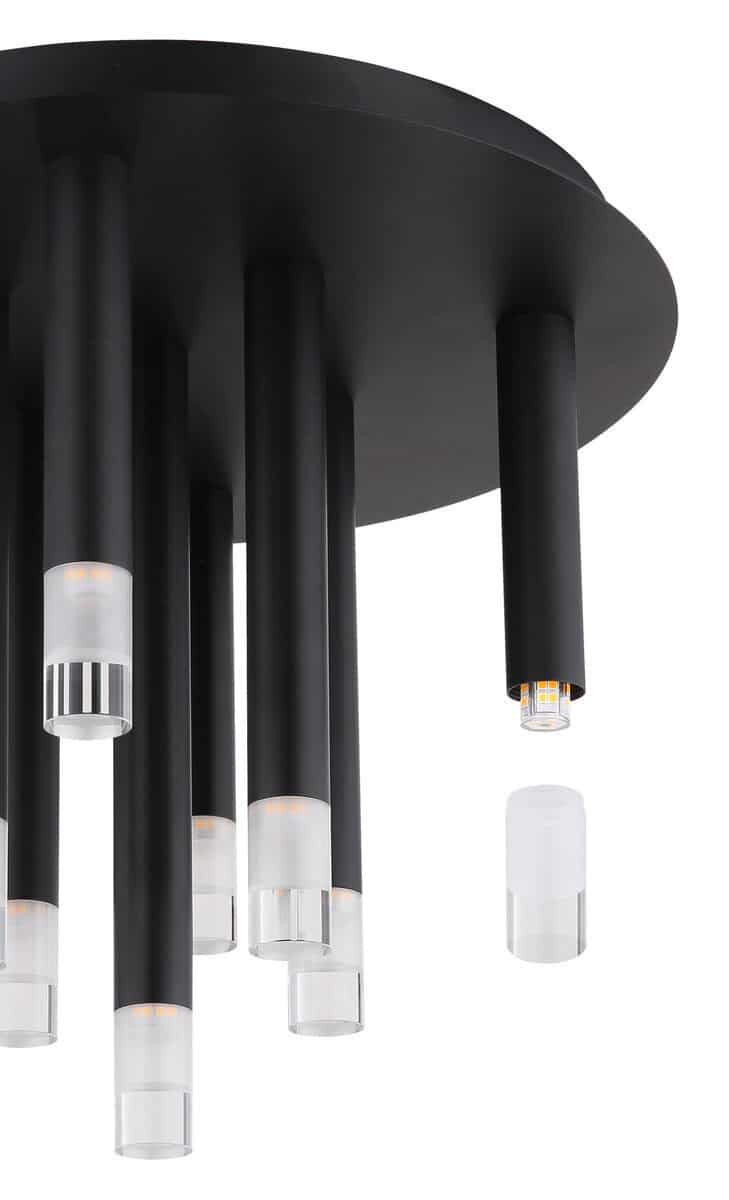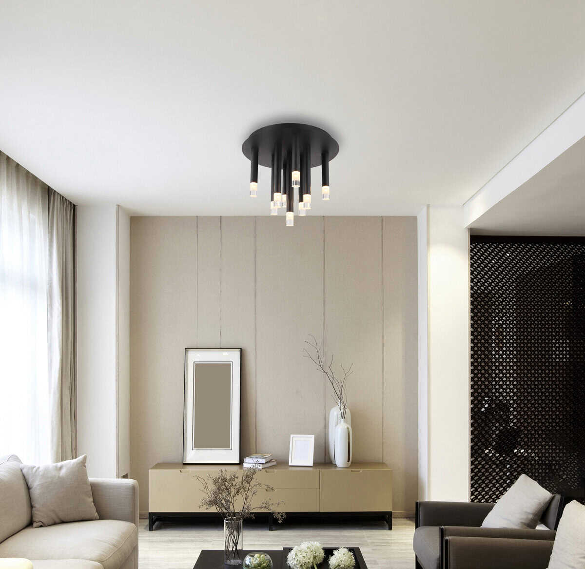 Plafonska lampa RYAN impresionira svojim modernim i elegantnim dizajnom. Njegovo okruglo kućište napravljeno od mat crnog metala dodaje stilski štih svakoj prostoriji. Devet tankih cilindričnih nijansi su također izrađene od mat crnog metala i obrađene su satenom i prozirnim akrilom, što osigurava ugodnu i ravnomjernu distribuciju svjetlosti. Sa prečnikom od 340 mm, RYAN se savršeno uklapa u različite veličine prostorija i nudi optimalno rešenje za osvetljenje. Idealna za dnevni boravak, trpezariju ili spavaću sobu, RYAN plafonska lampa se neprimetno uklapa u moderne stilove nameštaja i postavlja stilske akcente. Kombinacija mat crne i prozirnog akrila daje lampi savremenu estetiku i osigurava harmoničnu igru ​​svjetla. RYAN nije samo funkcionalan izvor svjetlosti, već i dekorativni element koji svakoj prostoriji daje posebnu atmosferu.