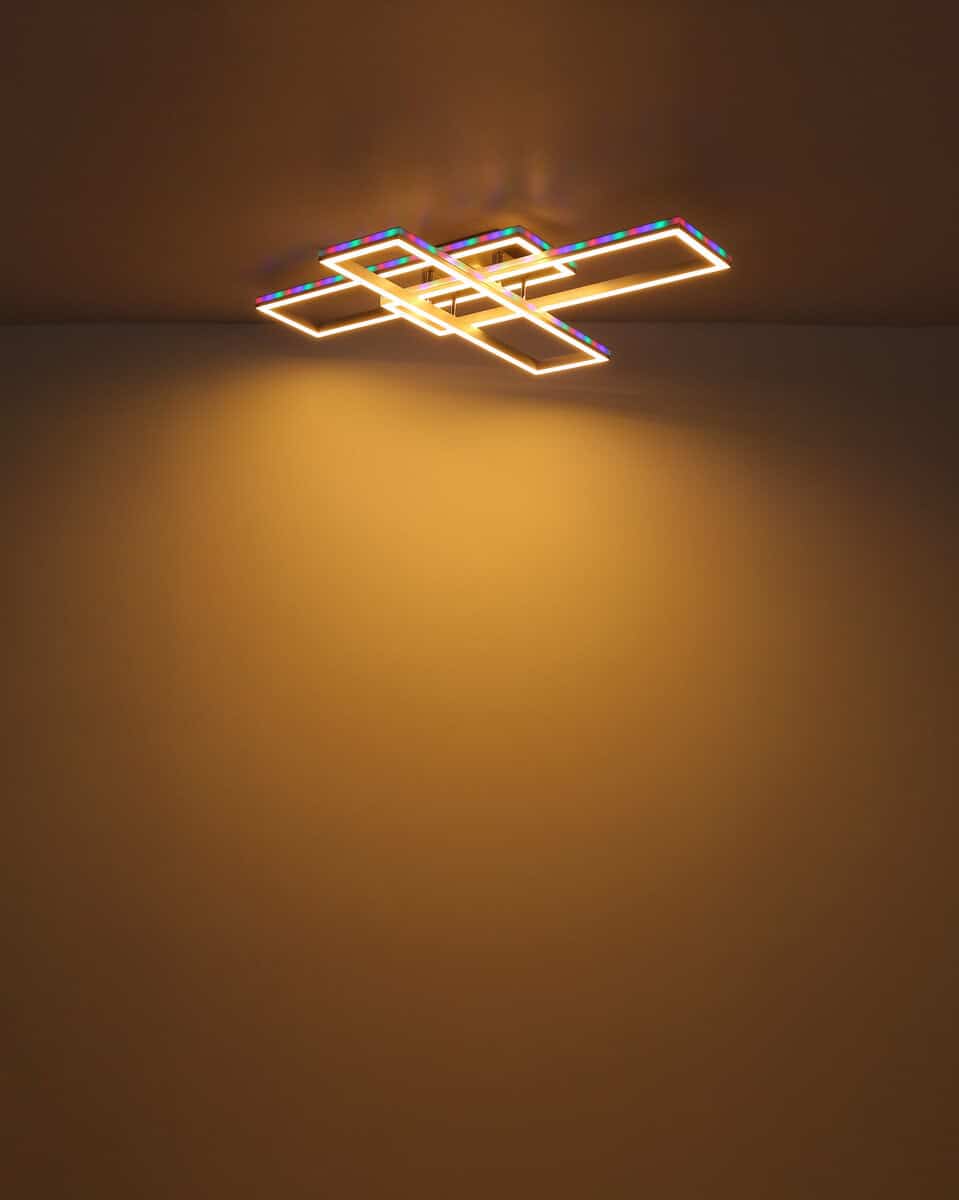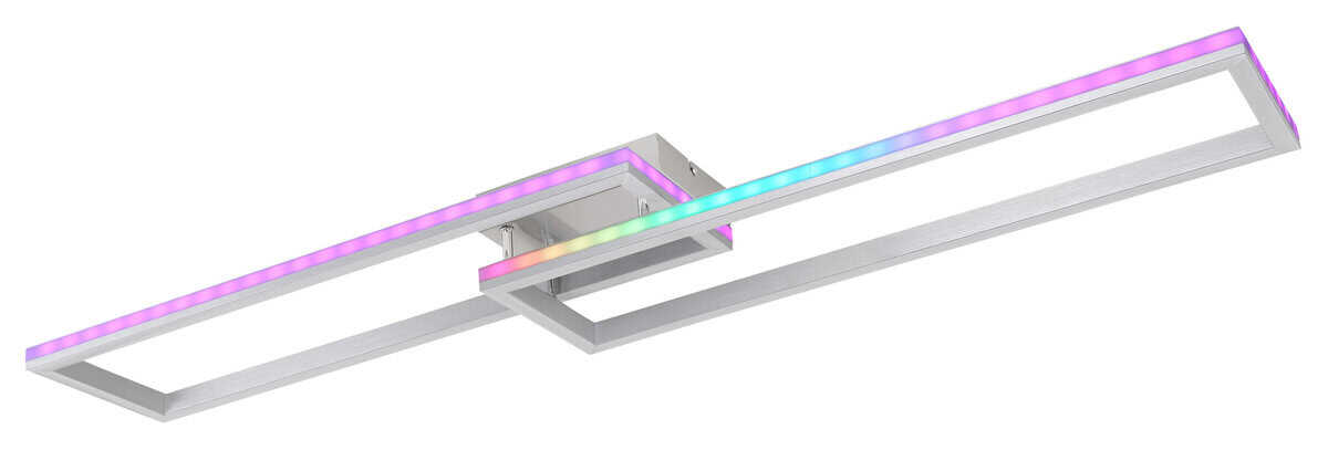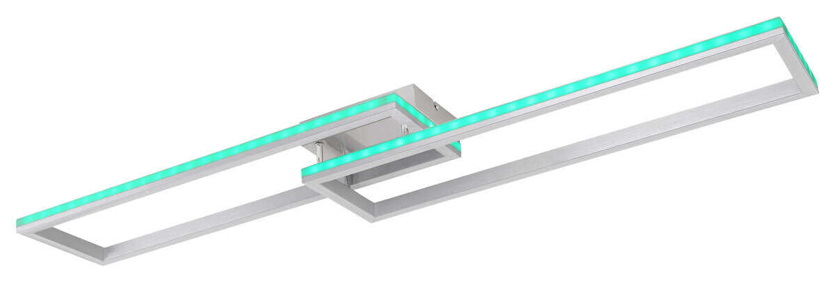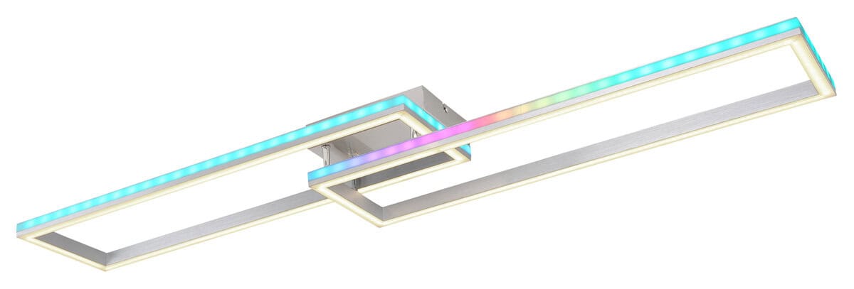 Ova plafonska lampa je izrađena od srebrno sivog metala i brušenog aluminijuma, sa opal plastičnim difuzorom. Može se zatamniti i ima nekoliko nivoa koji se mogu podesiti preko zidnog prekidača. Boje se mogu popraviti i postoji RGB izmjenjivač boja, kao i efekat duge. Tu je i memorijska funkcija, noćno svjetlo i tajmer. Lampa se može rotirati i okretati i dolazi s daljinskim upravljačem za koji su uključene 2 AAA baterije. Dimenzije su DxŠxV: 1195x255x100mm. Svetiljka sadrži LED sa snagom od 40W i napajanjem od 230V. Izlaz svjetlosti je izvor 410-5150lm, stvarna svjetlina je 230-2510lm izlaz, a temperatura boje može se birati između 2700-6500K. RGB LED sa 5W i 230V je takođe uključen.
