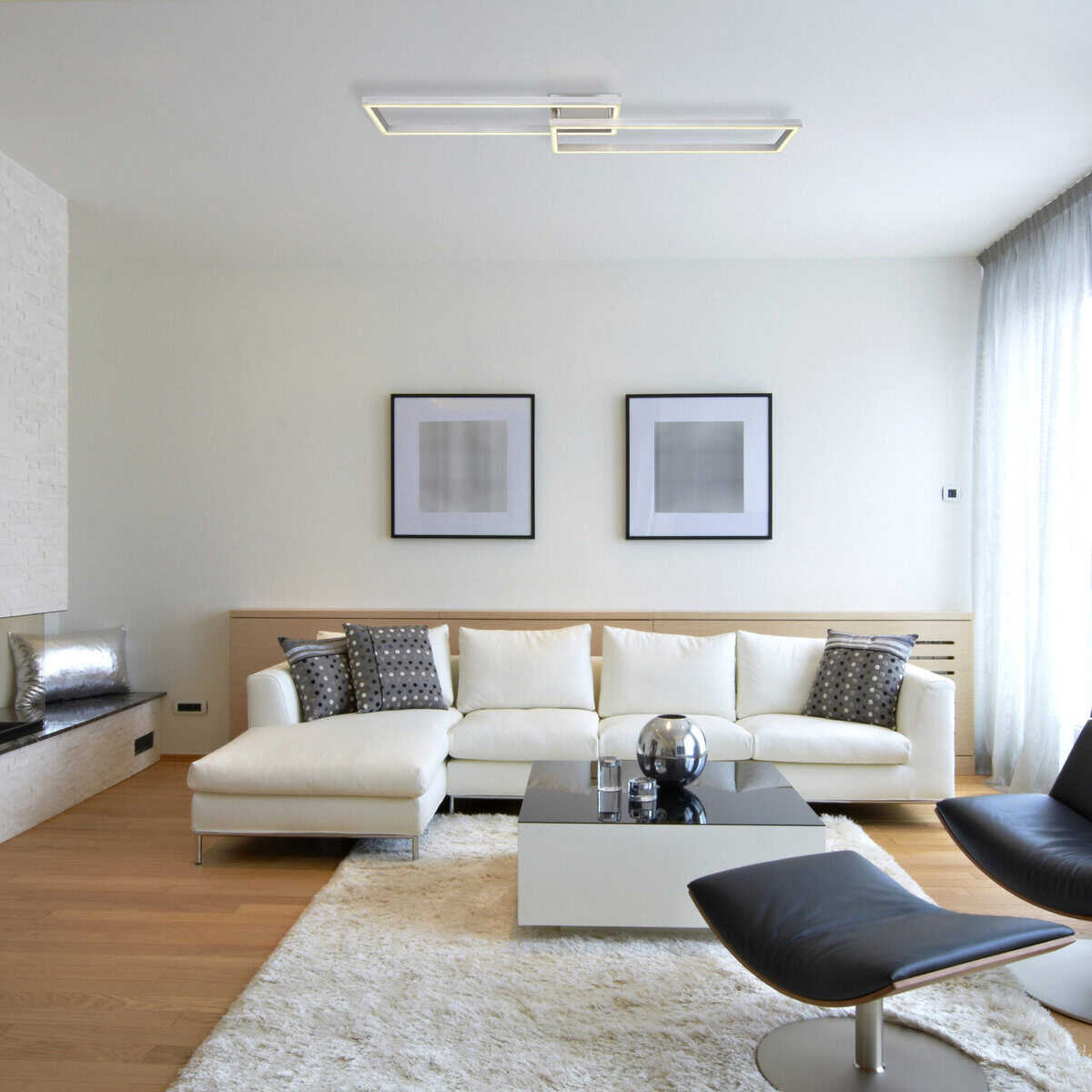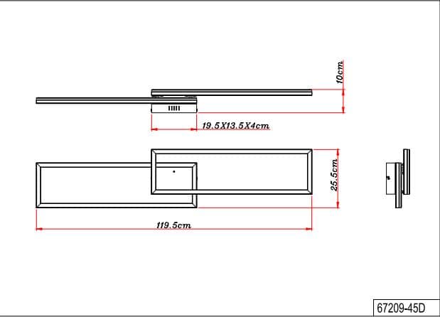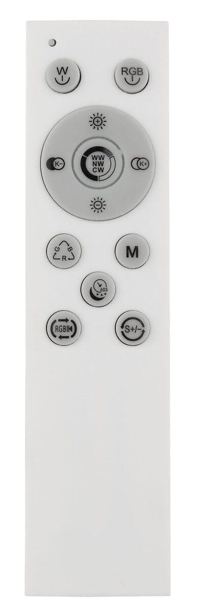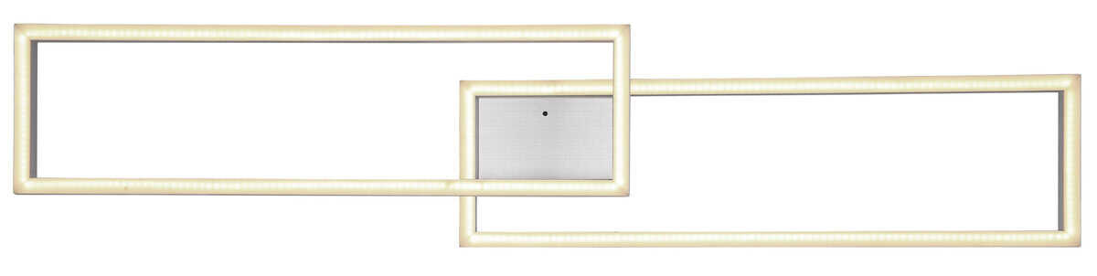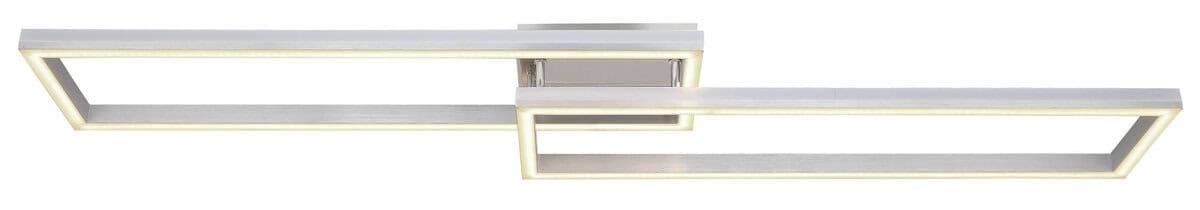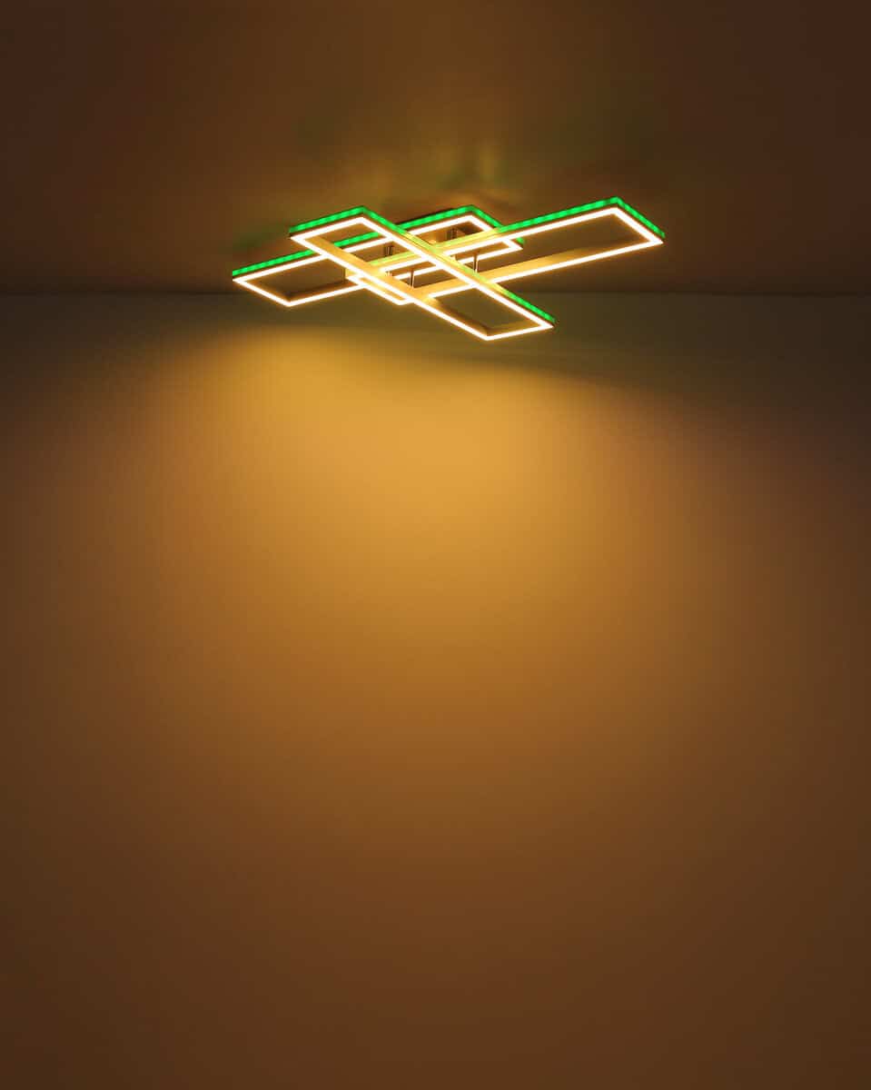 Ova plafonska lampa je izrađena od srebrno sivog metala i brušenog aluminijuma, sa opal plastičnim difuzorom. Može se zatamniti i ima nekoliko nivoa koji se mogu podesiti preko zidnog prekidača. Boje se mogu popraviti i postoji RGB izmjenjivač boja, kao i efekat duge. Tu je i memorijska funkcija, noćno svjetlo i tajmer. Lampa se može rotirati i okretati i dolazi s daljinskim upravljačem za koji su uključene 2 AAA baterije. Dimenzije su DxŠxV: 1195x255x100mm. Svetiljka sadrži LED sa snagom od 40W i napajanjem od 230V. Izlaz svjetlosti je izvor 410-5150lm, stvarna svjetlina je 230-2510lm izlaz, a temperatura boje može se birati između 2700-6500K. RGB LED sa 5W i 230V je takođe uključen.